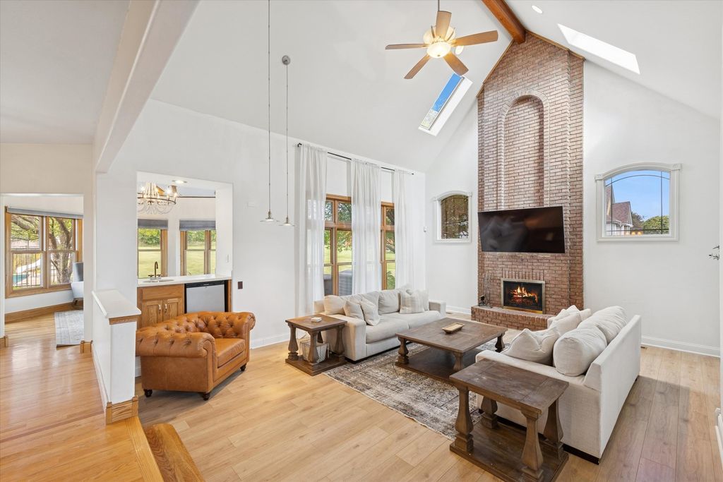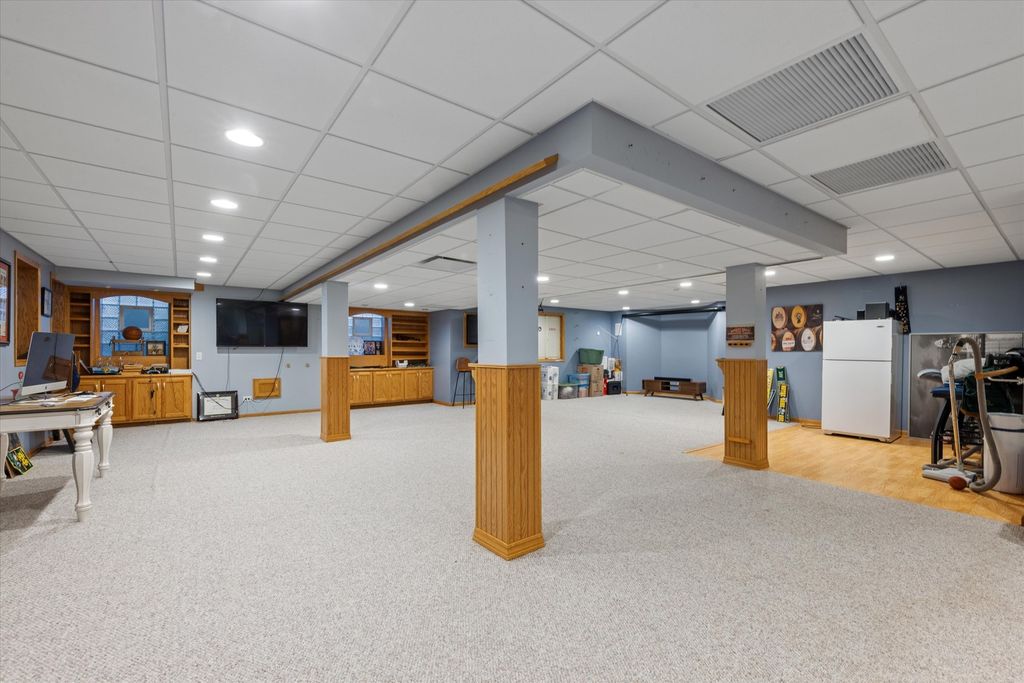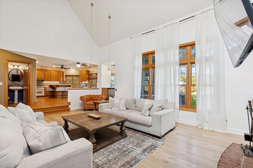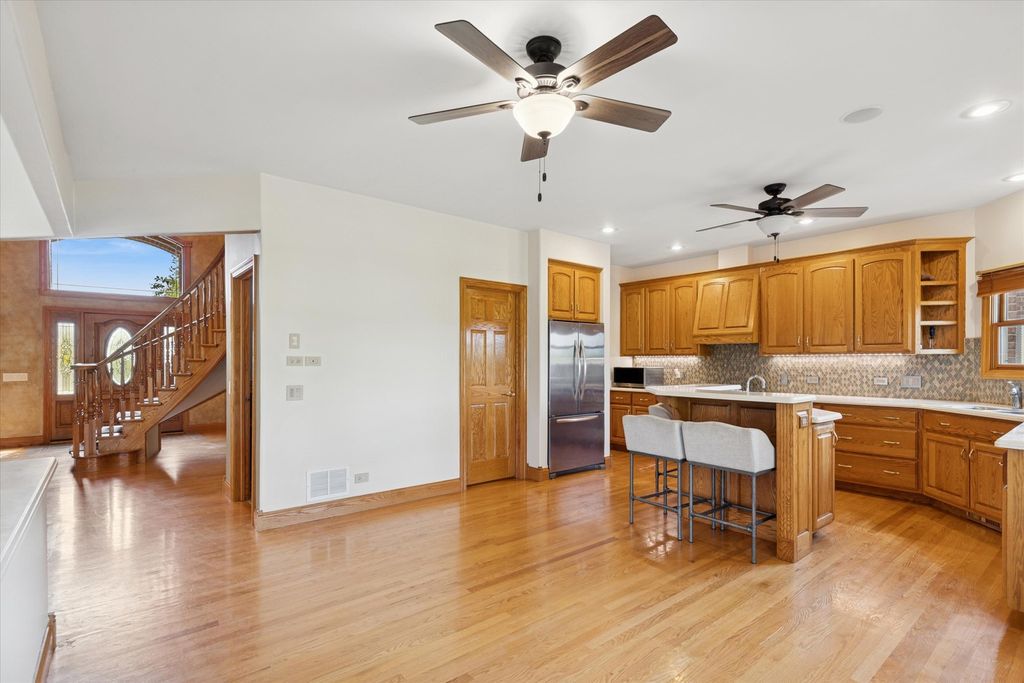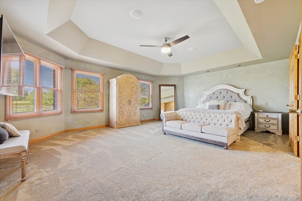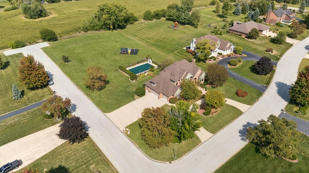 **Incredible Entertainer's Dream!** This one-of-a-kind custom home sits on 1.21 acres at a prime corner lot, backing to wide-open land for unmatched privacy and views. Every inch of this home is richly appointed inside and out with no expense spared. Step into the grand 2-story foyer with an elegant winding staircase and show stopping chandelier. To one side, a formal dining room with a pass-through butler's pantry; to the other, a stately office/study with cathedral ceilings, extensive built-ins, a brick accent wall, and French doors. The gourmet kitchen boasts42" oak cabinetry, walk-in pantry, large island with prep sink and seating, and a spacious eating area that opens to the impressive 2-story family room with vaulted ceilings and a floor-to-ceiling brick fireplace to cozy up to in winter months. The sunroom, with its wall of windows, offers breathtaking backyard views. The main level also includes a bedroom and full bath, ideal for guests or related living. Upstairs, find 3 bedrooms, 2 full baths, a convenient laundry area, and the luxurious primary suite with expanded walk-in closet and a beautifully remodeled spa bath featuring a steam shower, double vanity, and whirlpool tub.The finished basement expands your living space with a wide-open rec room, full bath, 2nd laundry with custom drying racks, and abundant storage. Car enthusiasts will love the heated 4-car garage (45' x 25') with floor drains. Outside, your private oasis awaits: stamped concrete patio, 40' x 20' pool, a play set and sprawling green space. Notable features: dual staircases, oak trim & 6-panel doors, radiant heat in basement/garage/baths, whole-house generator ( 7 yrs), roof ( 4 yrs), newer furnaces, A/C, boiler, and new HWH. This home blends elegance, comfort, and entertaining spaces like no other-come see for yourself! 10x15 sheds are allowed on the property.