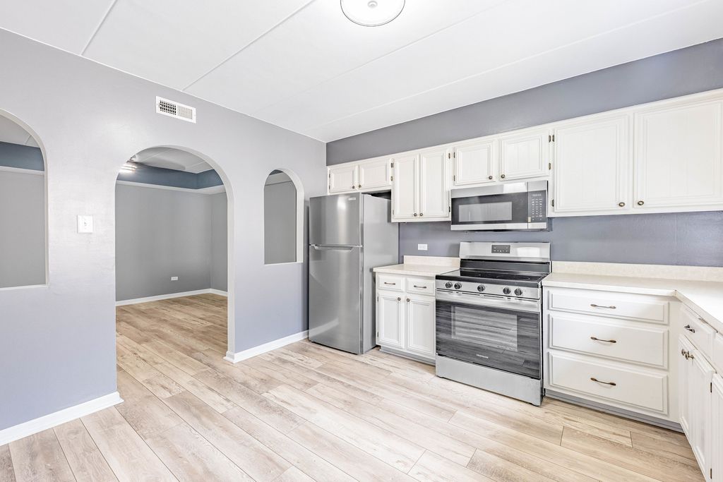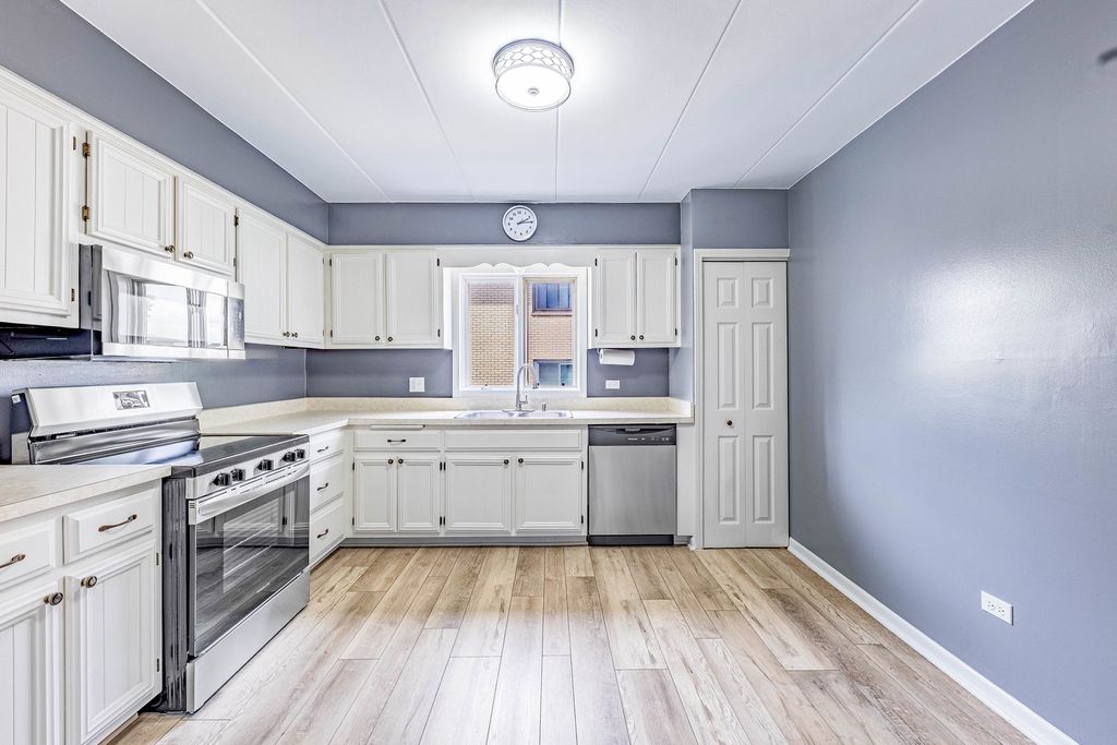 Welcome to this stunning Oak Lawn condo featuring 2 spacious bedrooms and 2 full bathrooms. The home offers timeless details including white trim and doors, a bright living room with access to an east-facing balcony, and a large walk-in entry closet. The formal dining room flows seamlessly into a generous eat-in kitchen with ample cabinetry and pantry space. The expansive primary suite boasts a walk-in closet and private full bath, while the second bedroom offers dual closets and easy access to a stylish guest bath complete with a white vanity, marble countertop, and modern fixtures. Additional highlights include a full-size in-unit laundry room, basement storage unit. This property comes with a detached one-car garage plus an additional assigned parking space (2N). Perfectly located near Memorial Park, residents can enjoy walking and biking paths, a fishing pond, splash pad, tennis courts, the iconic Rocket Slide, and covered picnic areas. Convenient access to the Metra, shopping, dining, and I-294 makes this a fantastic place to call home.
