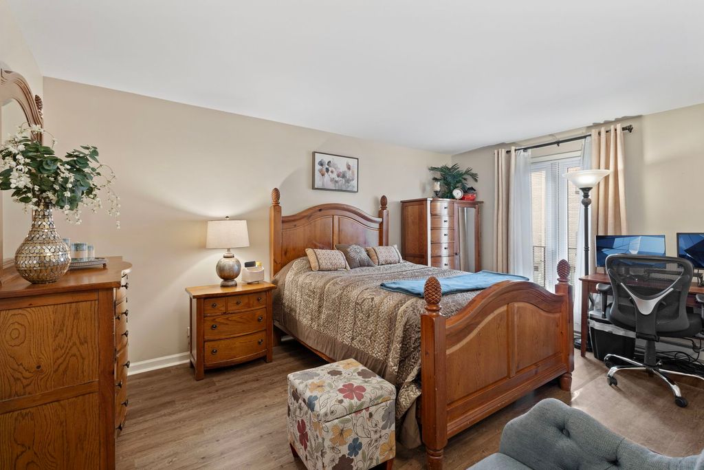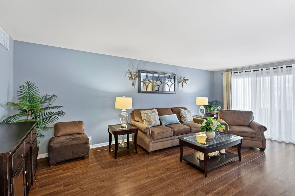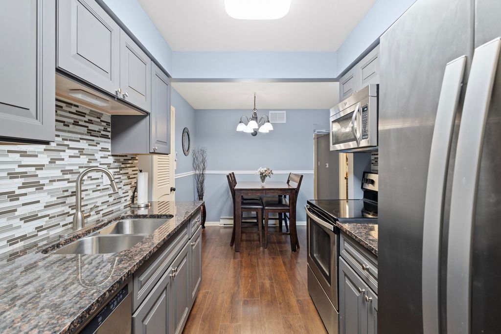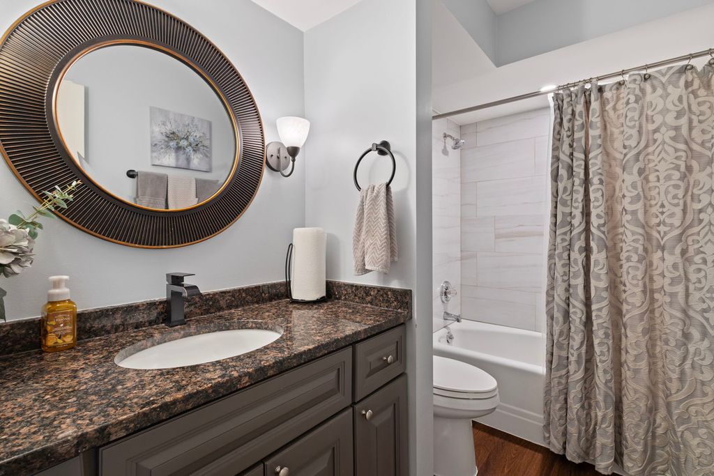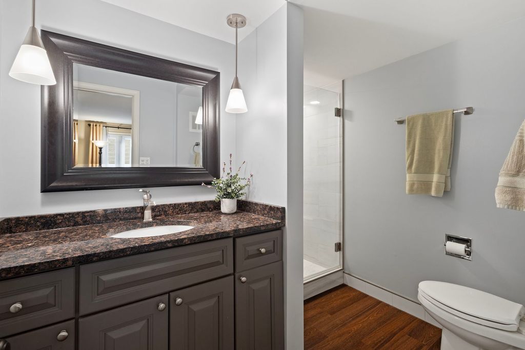 Charming 1st-floor 2 bed/2 bath condo with updates including flooring and electrical with a spacious open layout and welcoming foyer. Bright living room flows to formal dining area and kitchen with gray cabinetry, granite counters, glass backsplash, and stainless steel appliances. Primary suite with private bath and modern vanity. Generous second bedroom and full hall bath. Updated lighting and walnut-tone prefinished wood floors. Private balcony overlooking courtyard. Attached tandem 2-car garage. Laundry located in garage. Rentals not permitted.