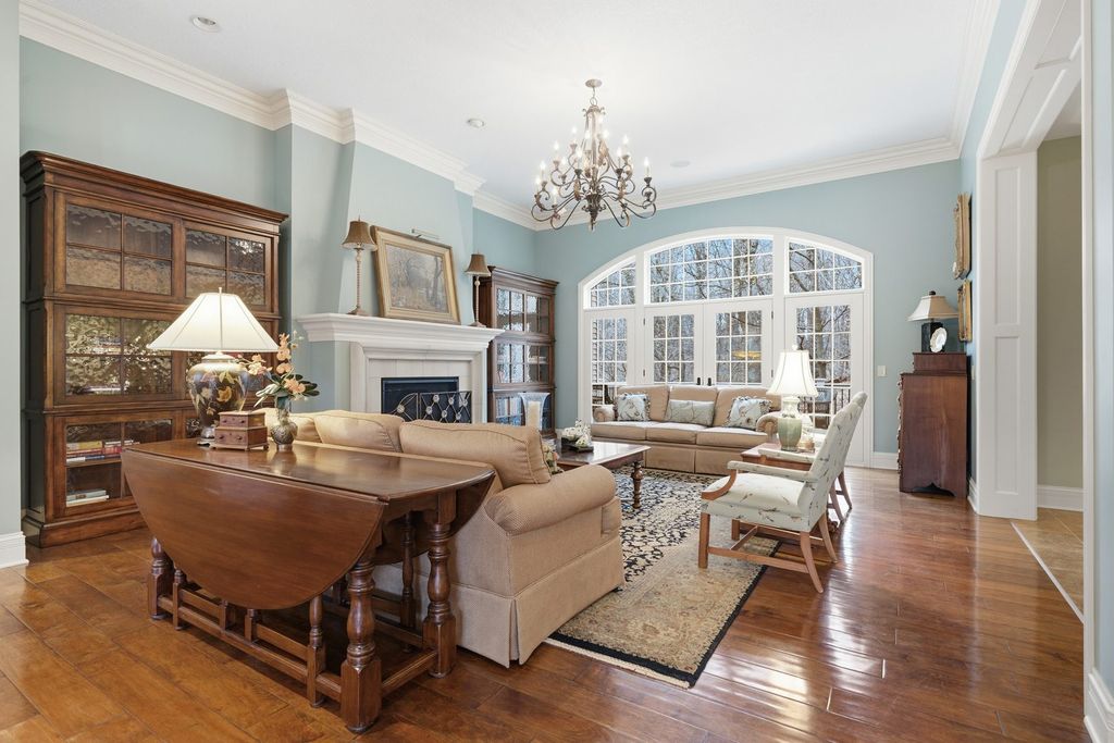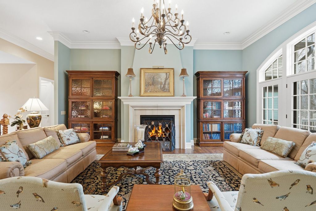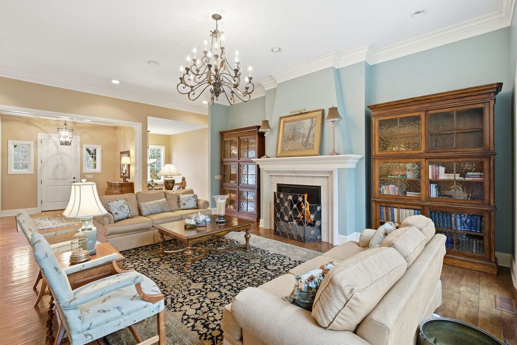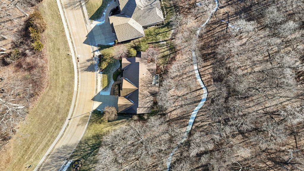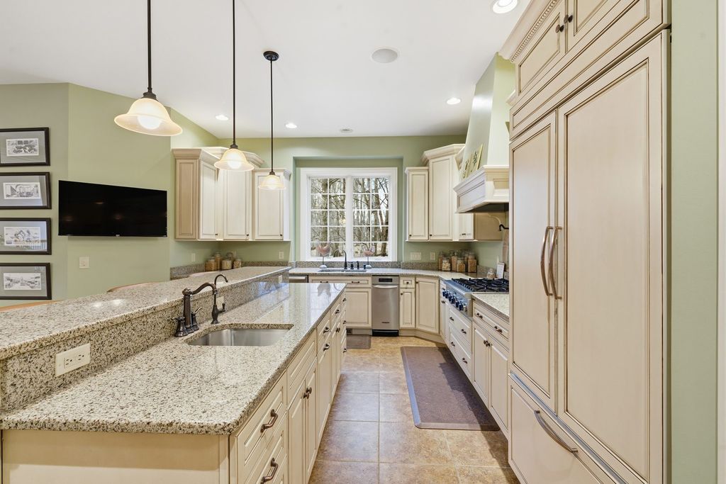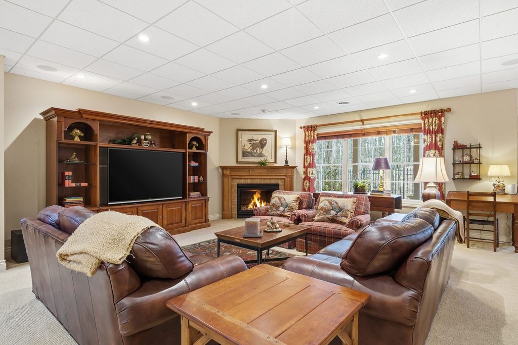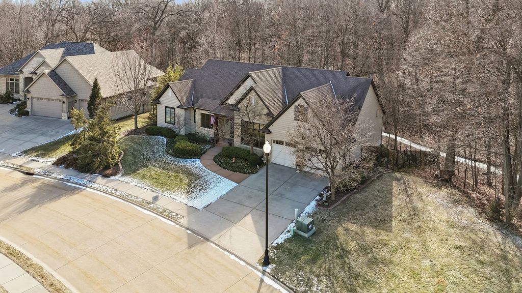 LUXURY MEETS COMFORT in this impeccably designed 3 BR, 5 Bath walk out ranch offering refined finishes, generous living spaces, and a serene wooded backdrop. Enjoy privacy and low maintenance living with landscaping and snow removal included through the HOA, allowing you to focus on living, not upkeep.From the moment you step inside, you will appreciate the soaring 10 to 12 ft ceilings, double layered crown molding, and coffered ceilings in the office, creating an elevated architectural presence throughout. Engineered hardwood floors flow across most of the main level, complemented by tile in the kitchen. The inviting living room is centered around a gas fireplace, ideal for both everyday comfort and entertaining. The chef inspired kitchen is designed to impress, featuring granite countertops, custom cabinetry with soft close doors and full extension drawers, pull out shelving, under cabinet lighting, pot filler, prep sink, breakfast bar, and a spacious island. High end appliances showcasing the integrated refrigerator and a butler's pantry with additional cabinet and counter space, making this kitchen as functional as it is beautiful. The main level primary suite offers a private retreat with generous proportions and a spa like atmosphere. Step out onto the private deck overlooking the landscaped and fenced backyard with peaceful wooded views, an ideal setting for morning coffee or evening relaxation. The finished walk out lower level expands the living space with a second fireplace, recreation room, two bedrooms each with access to full bathrooms. A secondary kitchenette that features a custom antique bar with dishwasher, beverage refrigerator, and prep sink that adds flexibility for guests, entertaining, or extended living arrangements. Schedule your private showing today and discover why this home stands apart from the others on your list.