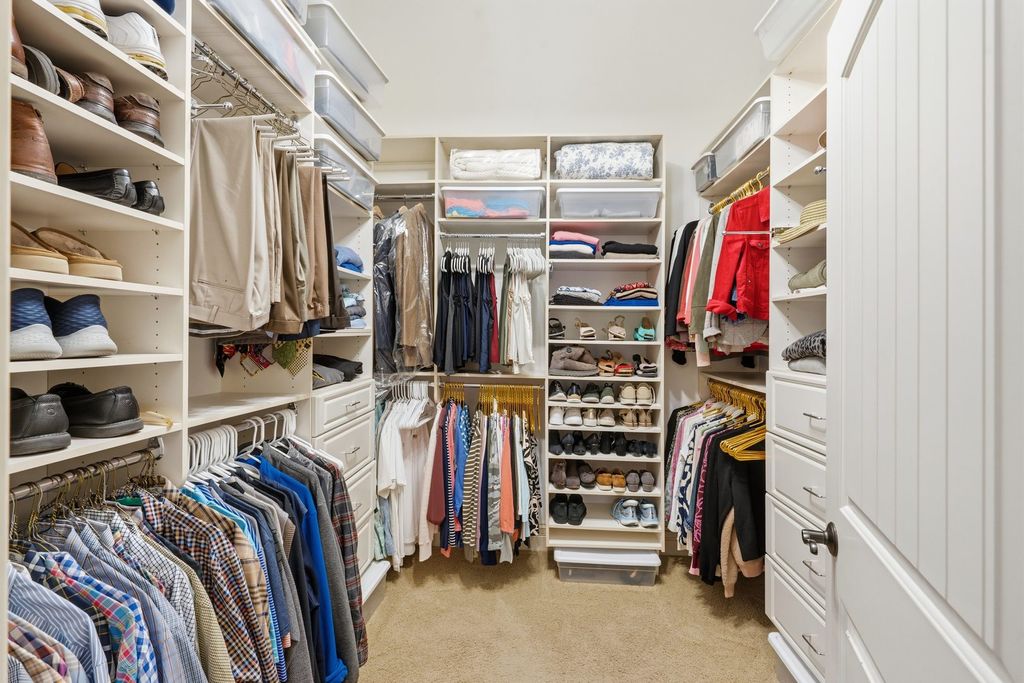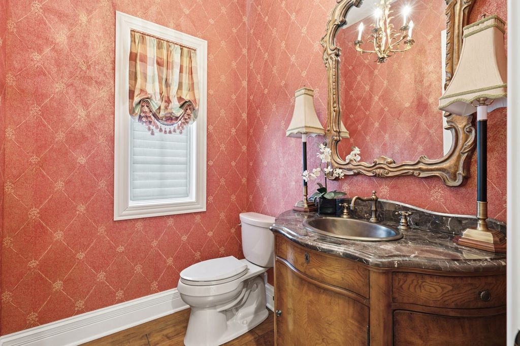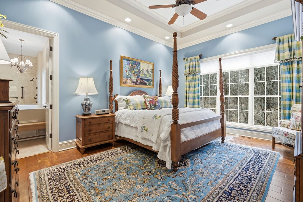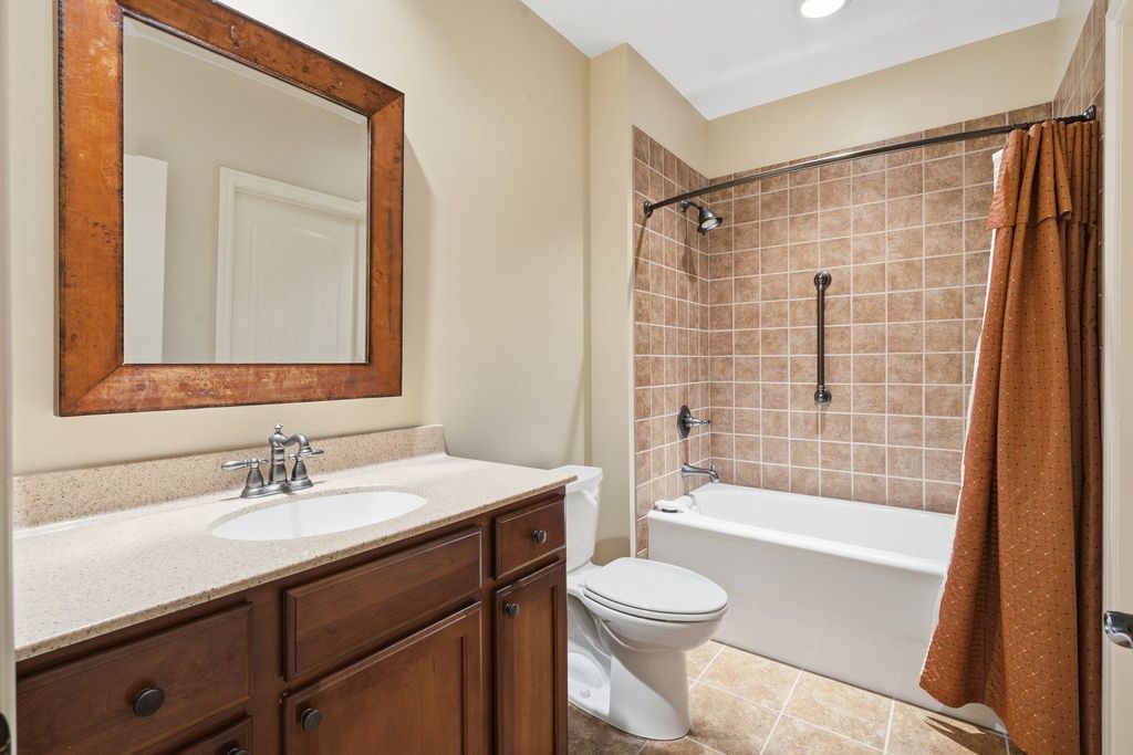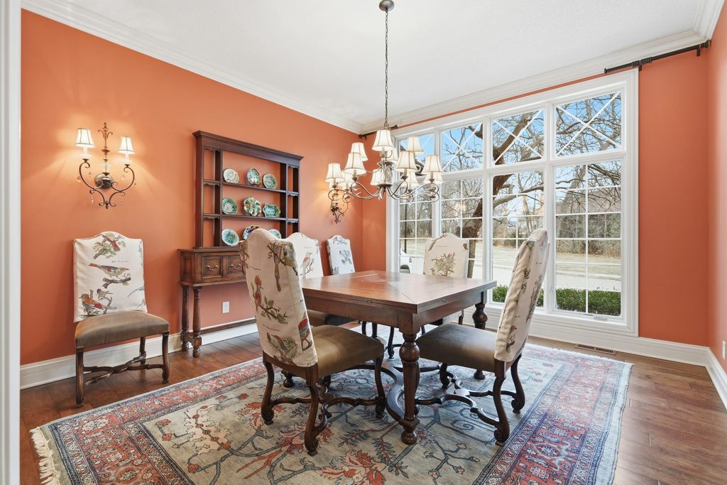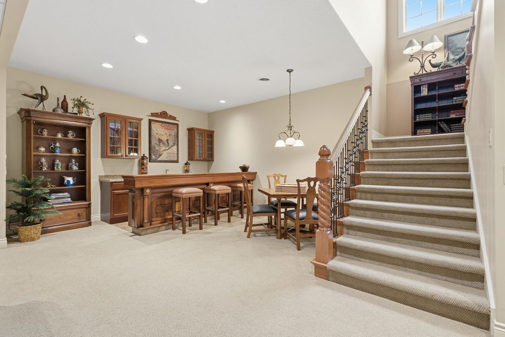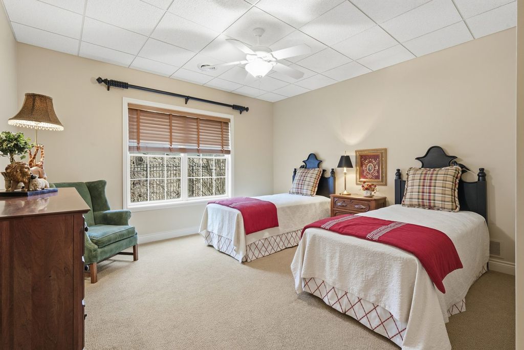 LUXURY MEETS COMFORT in this impeccably designed 3 BR, 5 Bath walk out ranch offering refined finishes, generous living spaces, and a serene wooded backdrop. Enjoy privacy and low maintenance living with landscaping and snow removal included through the HOA, allowing you to focus on living, not upkeep.From the moment you step inside, you will appreciate the soaring 10 to 12 ft ceilings, double layered crown molding, and coffered ceilings in the office, creating an elevated architectural presence throughout. Engineered hardwood floors flow across most of the main level, complemented by tile in the kitchen. The inviting living room is centered around a gas fireplace, ideal for both everyday comfort and entertaining. The chef inspired kitchen is designed to impress, featuring granite countertops, custom cabinetry with soft close doors and full extension drawers, pull out shelving, under cabinet lighting, pot filler, prep sink, breakfast bar, and a spacious island. High end appliances showcasing the integrated refrigerator and a butler's pantry with additional cabinet and counter space, making this kitchen as functional as it is beautiful. The main level primary suite offers a private retreat with generous proportions and a spa like atmosphere. Step out onto the private deck overlooking the landscaped and fenced backyard with peaceful wooded views, an ideal setting for morning coffee or evening relaxation. The finished walk out lower level expands the living space with a second fireplace, recreation room, two bedrooms each with access to full bathrooms. A secondary kitchenette that features a custom antique bar with dishwasher, beverage refrigerator, and prep sink that adds flexibility for guests, entertaining, or extended living arrangements. Schedule your private showing today and discover why this home stands apart from the others on your list.