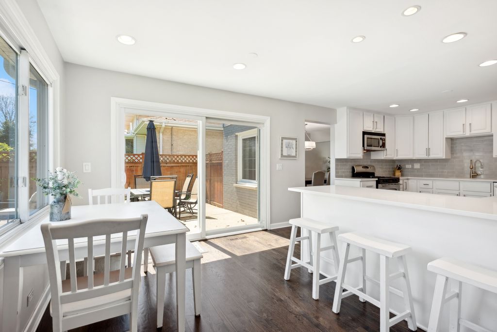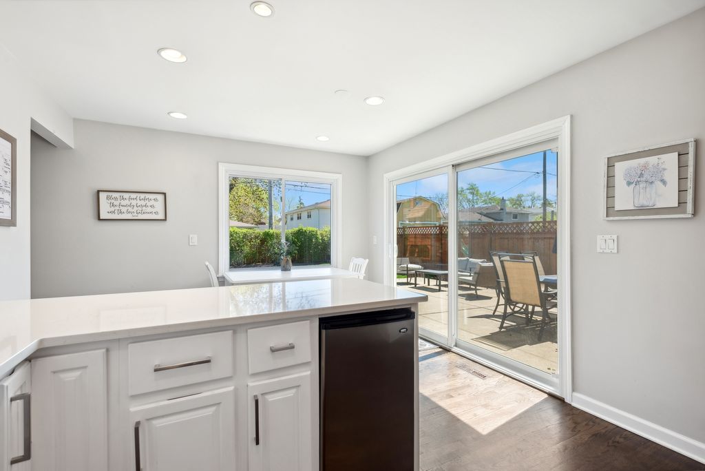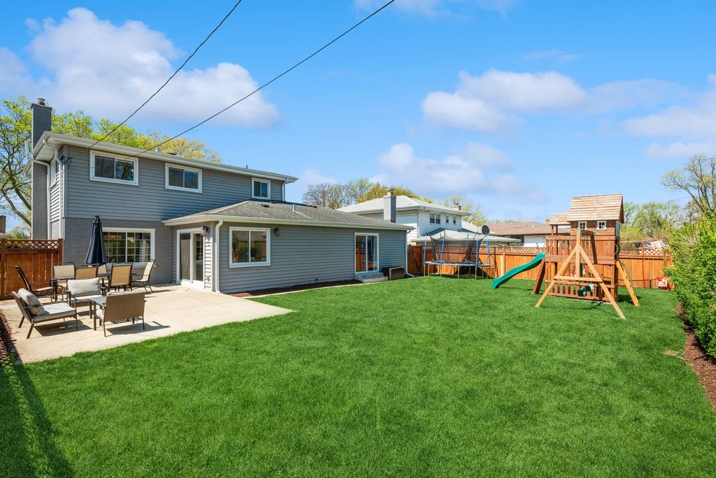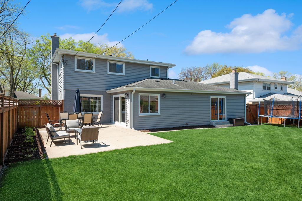 Nestled in the highly desirable Blue Ribbon Jefferson school neighborhood of southeast Elmhurst, this meticulously renovated 3-bedroom, 2.5-bathroom home offers modern comfort and thoughtful updates throughout. Upon entering the new front door, you'll be greeted by a spacious living room showcasing beautiful hardwood floors and new windows that flood the space with natural light. The home features a separate dining room perfect for entertaining, while the well-appointed kitchen boasts stainless steel appliances, a convenient breakfast bar, and an eating area. A sliding glass door from the kitchen opens to a patio, ideal for outdoor grilling and dining. The generous family room centers around a cozy fireplace and provides access through sliding glass doors to the fully fenced and professionally landscaped large backyard-perfect for relaxation and recreation. The primary bedroom features an updated en-suite master bathroom. Two additional well-sized bedrooms share a beautifully renovated full bathroom. Finished lower level with new carpeting. Convenient first-floor laundry room. Attached two-car garage for secure parking and storage. This exceptional home is walking distance to Butterfield Park with quick access to Jefferson (K-5),Visitation (PreK-8),Smalley Pool/Park,The IL Prairie Path, the York/Vallette Business District, to all Chicagoland highways (88/290/294) and Oak Brook Mall.