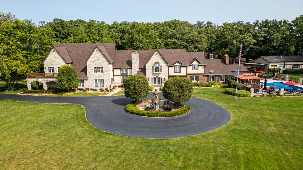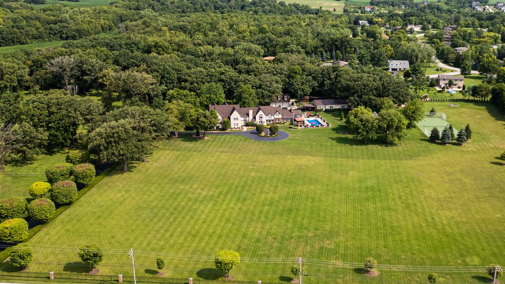 This estate is a true masterpiece of luxury, comfort, and privacy-nestled on nearly 11 meticulously landscaped acres. Offering over 10,000 square feet of beautifully designed living space, the residence combines timeless elegance with thoughtful functionality. A gated entrance leads to this private sanctuary, which features a heated six-car garage and two fully equipped guest apartments-ideal for extended stays or multigenerational living. The main home includes a spacious main-floor bedroom suite for added convenience. Two sprawling living rooms offer abundant space for entertaining and relaxation, one featuring a built-in bar. A formal dining room sets the stage for elegant gatherings, while a charming breakfast room offers a more casual spot to enjoy morning meals. The gourmet kitchen is designed for the discerning chef, equipped with a full-size Sub-Zero refrigerator and freezer, two dishwashers, and a professional-grade six-burner range with griddle. The showstopping master suite spans an impressive 38' x 37' and includes a private balcony, tanning room, fireplace, and three massive walk-in closets. The luxurious master bath is outfitted with spa-quality finishes, creating a private retreat. Additional interior highlights include a state-of-the-art theater room with a 12-foot screen, a game room with hot tub, a cozy sitting room with built-in bar, a well-equipped exercise room with professional flooring, a bright Florida room, and an executive office filled with natural light. The outdoor amenities rival those of a private resort. A heated in-ground swimming pool and spa house provide the ultimate relaxation, while resurfaced tennis courts (2024), decorative fountains, a charming gazebo, and a 30' x 50' heated pole barn offer year-round enjoyment. The estate is fully fenced and secured with an advanced security system, ensuring both privacy and peace of mind. Recent upgrades include new roofs on all structures (2022/2023), gutters and soffits (2023), all air conditioning units replaced (2024), furnace rebuild (2019), water heater (2022), and a new driveway (2023). Interior updates include new carpet (2024), luxury vinyl tile flooring (2024), updated kitchen lighting, and newly upgraded pool equipment (2024) with a liner installed in 2023. Even the cedar shed received a full update in 2024. Set well off the main road behind stately gates, this extraordinary estate offers a rare opportunity to enjoy refined living in a truly private and serene setting.