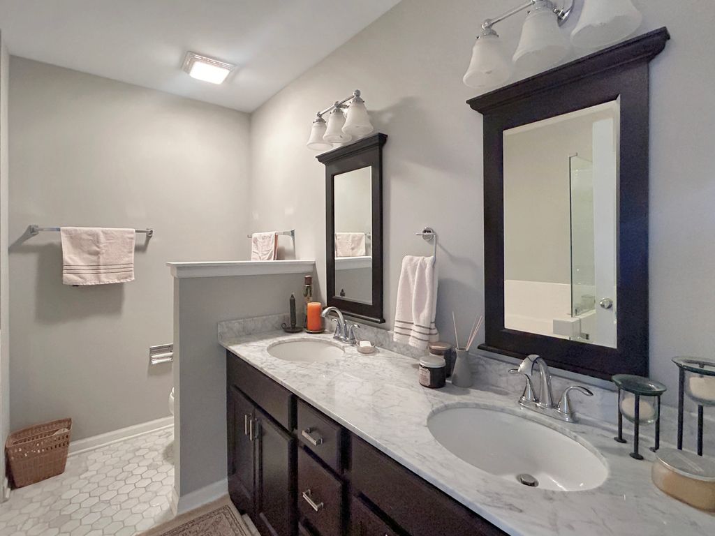 A gem of an opportunity in Hidden Lake! This spacious home overlooks a beautifully landscaped common area, enjoyed from both the living room and custom deck. Hardwood floors span the entire first level, along with brand new high-end carpeting throughout the second floor and basement. Numerous upgrades include recently updated kitchen w/ quartz countertops & stainless steel appliances, and a beautifully finished basement/rec room. Features also include a gas-log fireplace, impressive vaulted ceilings, built-in surround-sound system, and an eat-in kitchen. Convenient second-floor laundry and tasteful neutral decor throughout. And a beautiful walking trail right outside your door! Move right in and enjoy the good life in Hidden Lake of Green Trails!