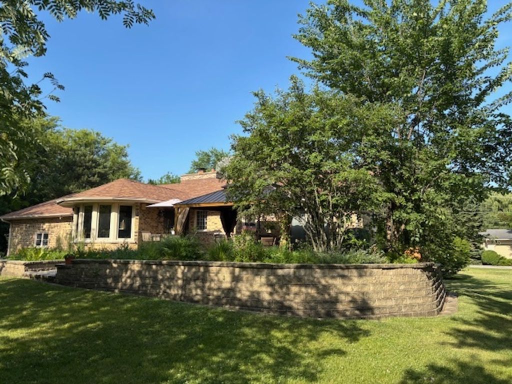 Beautiful 4-bedroom, 3-bath brick ranch on almost an acre lot! Located on a quiet street at the end of the road. Oversized garage (24x30) with vaulted ceiling, a workshop and plenty of storage. Brick walkway leads to the front door. Living room has a dramatic floor-to-ceiling stone fireplace and beamed vaulted ceiling. Kitchen has been updated with quartz countertops, new backsplash and stainless appliances. Large dining room has built-in cabinetry, bow windows with seat, and doors that open to a patio & landscaped yard with waterfall, pond and new gazebo. Primary bedroom has a bathroom with large shower with bench and body-spray jets. Newly finished basement has a large wet bar, fireplace, bedroom, bath, exercise room, and laundry room. Zoned surround-sound throughout home, 10x16 outdoor shed, and water rights. New HVAC and water heater. All baths recently remodeled, roof replaced in 2017. This house has it all!