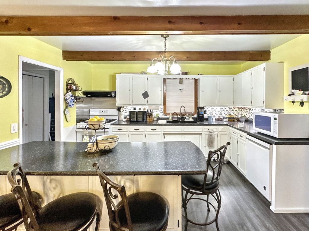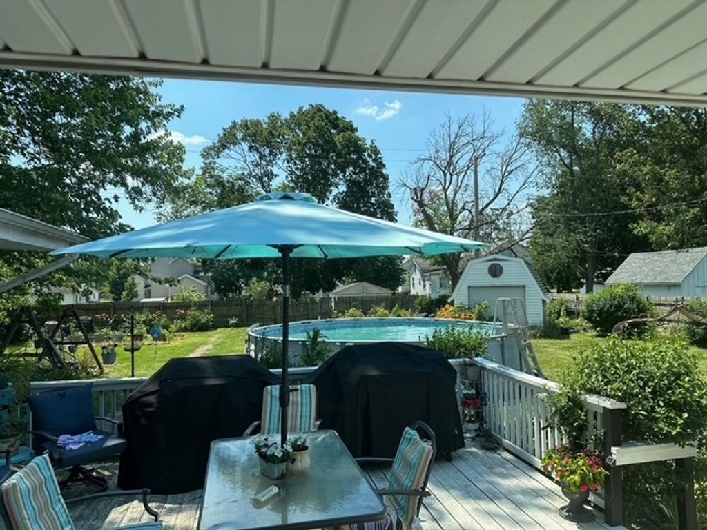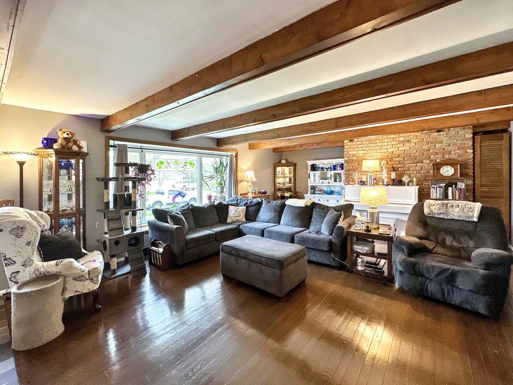 Step into style with this beautifully maintained home featuring a cozy wood-burning fireplace and wood-beamed ceiling in the kitchen! There's a formal dining room when extra seating is required and a breakfast bar in the kitchen for casual dining. An exposed brick wall, a striking beamed ceiling, and real hardwood floors create an inviting atmosphere in the living room, and the family room adds additional living space. Enjoy outdoor living with a private deck overlooking the fenced backyard with a sparkling pool. Oversized sliders give access to the deck from dining room and family room. The 12x12 storage shed has a roll-up door and 2022 roof. New roof, furnace, w/whole house humidifier, and central air in 2022. Fresh paint recently and new Andersen bay window in living room. Located in a highly desirable area, this is a gem. Attached oversized garage is 23x30.