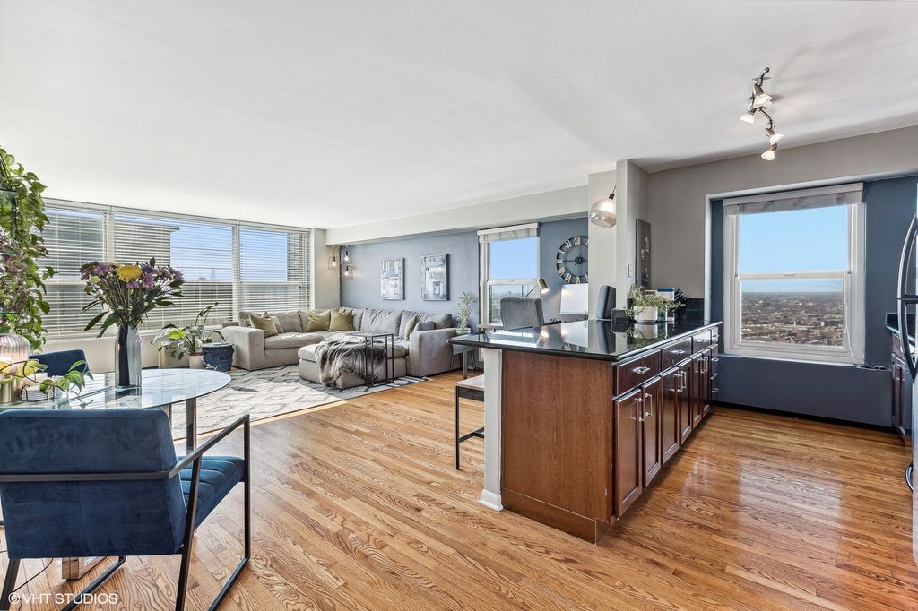 Over-sized corner 1-bedroom unit with tons of natural light and panoramic views from its high floor within a prestigious full amenity building! This sought-after floor plan on the coveted South and West corners offers stunning vistas of the lake, iconic Wrigley Field, and glimpses of the downtown skyline. Recently renovated, the unit features gleaming hardwood floors in the main living area, a modern kitchen with granite countertops and stainless steel appliances, and an updated bathroom. The generously-sized bedroom easily accommodates a king-sized bed, nightstands, and a dresser, providing a rare level of comfort and convenience. Residents enjoy a wealth of amenities including a 24-hour door person, on-site management, a well-equipped workout room, a scenic roof deck, and a convenient commissary. With the Addison Red-line stop nearby and express buses at your doorstep, this prime location offers unparalleled accessibility to city living. Tenant occupied will need 48hr notice to show.