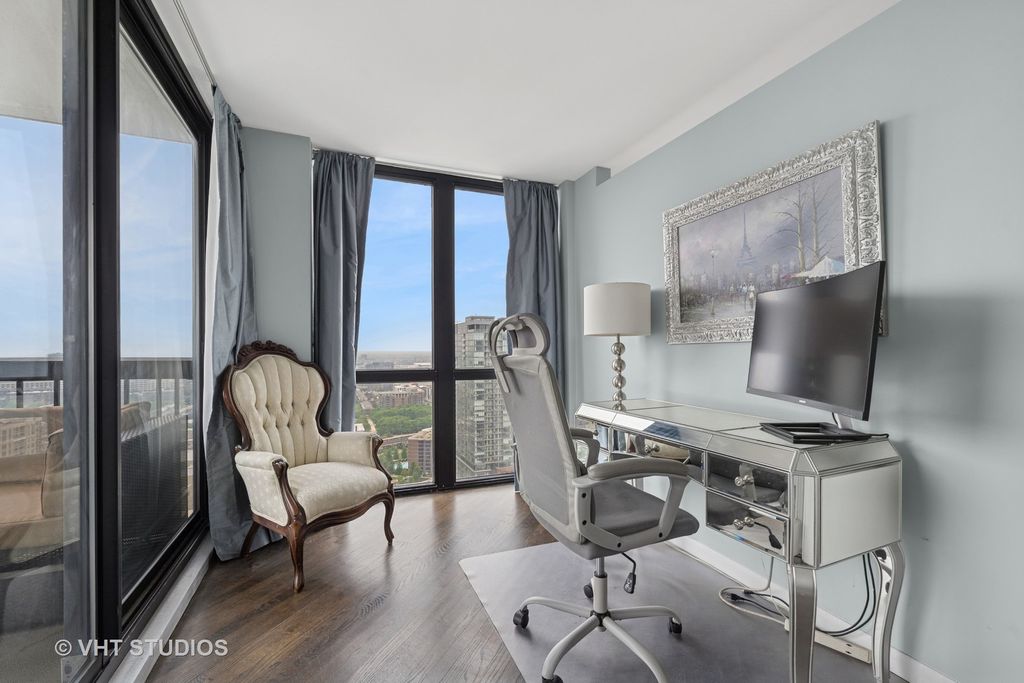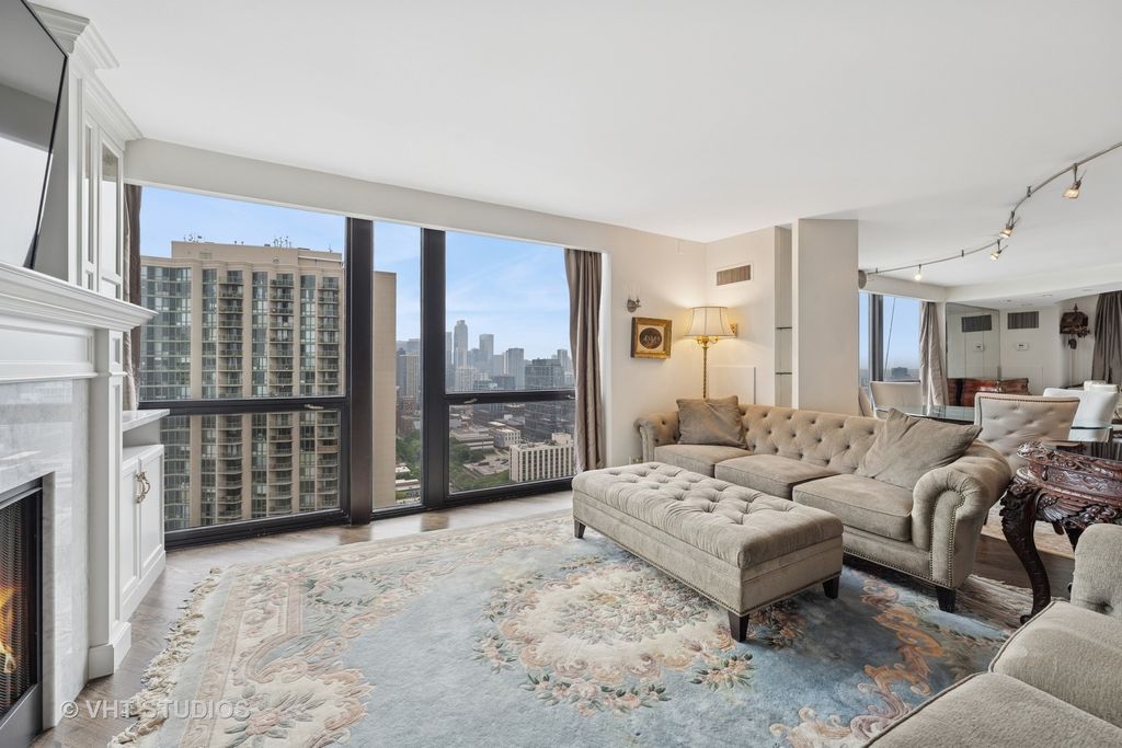 Enjoy beautiful panoramic city views from the southwest corner of one of the top floors at The Elm at Clark. This 3bed+den/3 full bath open concept home has 1800 SQFT of living space and is great for entertaining. Floor-to-ceiling windows showcase stunning city views while the open floorplan floods the home with natural light. An entry foyer has enough space to accommodate a baby grand piano. The living room features a fireplace flanked by built-in bookcases. An upgraded kitchen has granite counters, Sub-Zero, Wolf, Dacor, and Bosch appliances, and a breakfast bar. Conveniently located just off the kitchen, a large, covered balcony is the ideal place to grill, dine, and relax. The living space also offers a den/office, with fantastic views, perfect for working from home. The primary bedroom features porcelain tile flooring, a sitting "nook," and an ensuite bathroom with double sinks and shower. The second bedroom has an ensuite bath and the third bedroom has a large, walk-in closet. A third full bath is accessible to both the third bedroom and to guests. A laundry room with washer and dryer completes this residence. Two storage cages included in the price. Deeded parking space (P216) available for an additional $40,000. Professionally managed building with 24hr doorman, outdoor pool, fitness room & party room. Steps to the lake, Wells Street, shopping, restaurants, grocery stores, gyms, public transportation, and all the Gold Coast has to offer!