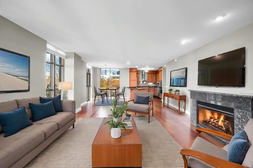 Downtown Naperville! Move right in to this super spacious and very stylish two-bedroom condo perfectly located by everything the downtown area has to offer. Whether you're looking for an urban lifestyle or a smart investment property, this home checks all the boxes. Inside, you'll find classic design touches including gleaming hardwood floors, dramatic granite countertops, stainless steel appliances, Kohler fixtures, and a cozy fireplace. Expansive vertical windows fill the living space with natural light while custom electric blinds offer instant privacy when needed. Enjoy your morning coffee or grill out on the cute balcony, just off the dining area. The primary suite is generously sized with a custom closet system and a luxurious en suite bath featuring a double vanity, water closet, soaking tub, and a separate shower. Everything you need is all on one level, with the added convenience of elevator to travel to secure entry/exit, mail, indoor heated parking garage, and basement storage. Step outside and you're just moments from the Naperville Riverwalk, award-winning restaurants, boutique shops, entertainment, parks, and District 203 schools. You're also close to North Central College, with access to enriching arts, culture, and sporting events. Set within a quiet, 7-story building with just 24 units, residents also enjoy a serene shared courtyard and river views tucked just behind the building. Monthly assessment covers: heat, water, gas, building insurance, and exterior maintenance - including snow removal and landscaping. Truly stress-free, low-maintenance living!