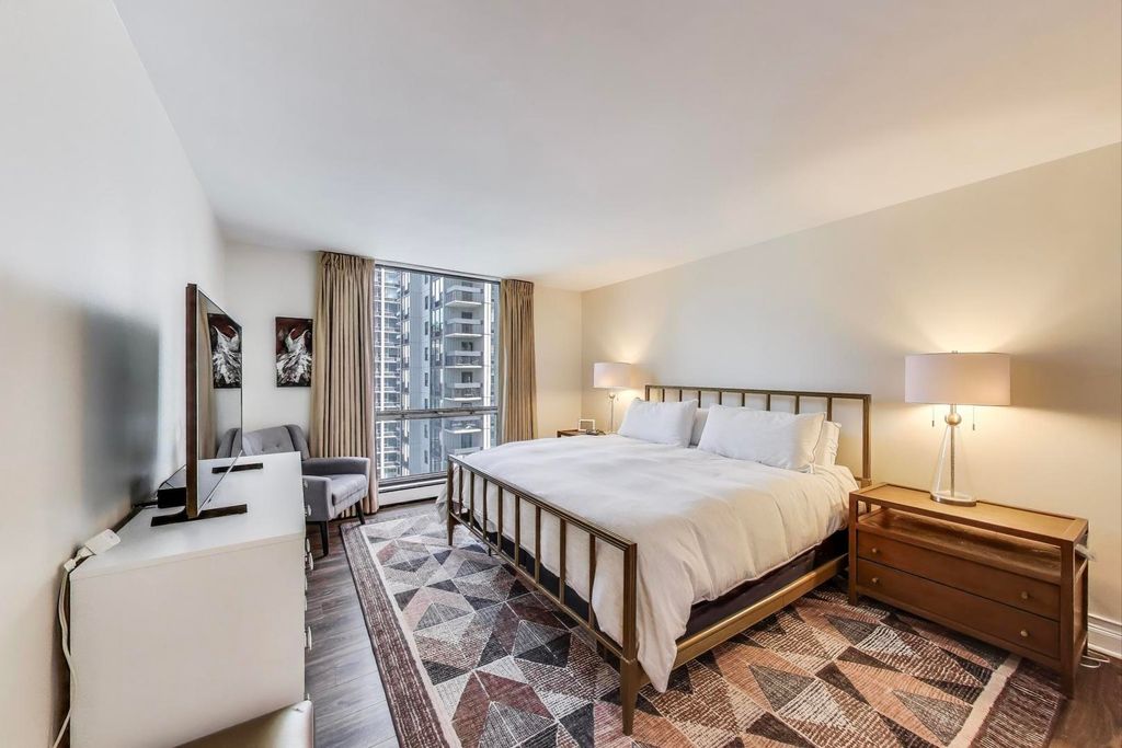 Experience panoramic lake and city views from every room in this elegantly renovated 2 bedroom plus den/2 bath corner residence. Flooded with natural light from floor-to-ceiling windows, this sophisticated home showcases a reimagined open-concept kitchen featuring custom cabinetry that extends seamlessly into the dining area and pantry. Quartz countertops, Fisher & Paykel and Liebherr appliances elevate the culinary experience. The thoughtfully designed floor plan offers generous room sizes, including a luxurious primary suite complete with a professionally organized walk-in closet. Every detail has been curated to impress-from the wide-plank flooring and solid-core doors to the designer light fixtures throughout. Abundant storage and closet space enhance both form and function. Located in a full-service building offering premier amenities, including a pool, sun deck, fitness center, 24-hour door staff, on-site management and engineer, laundry facilities, and additional storage. Enjoy a vibrant lifestyle just outside your door with top-rated restaurants, premier shopping, the lakefront, and park all steps away.