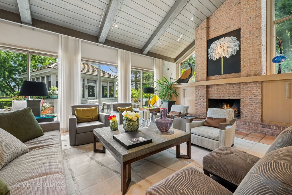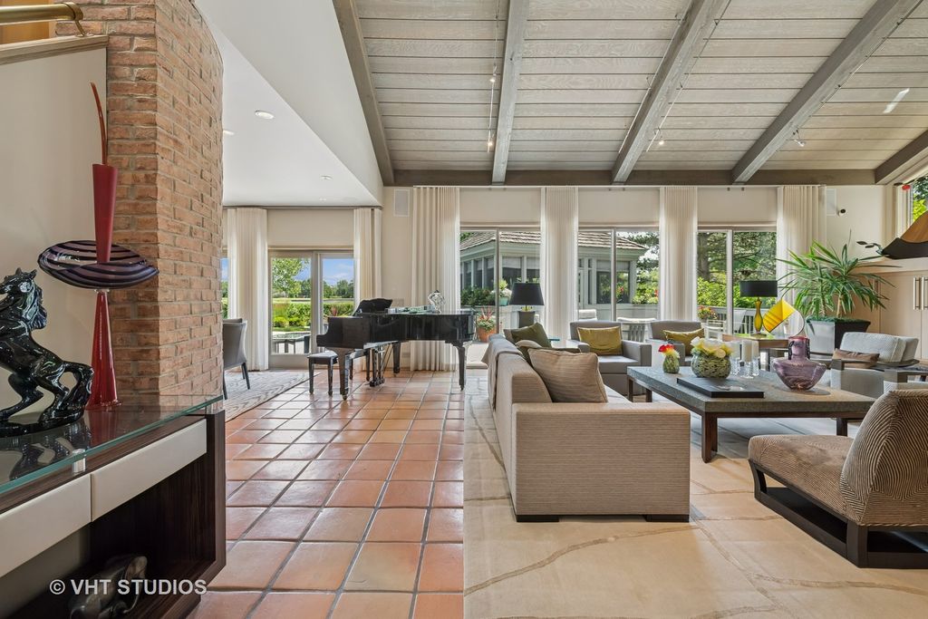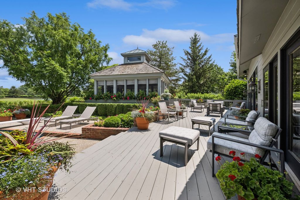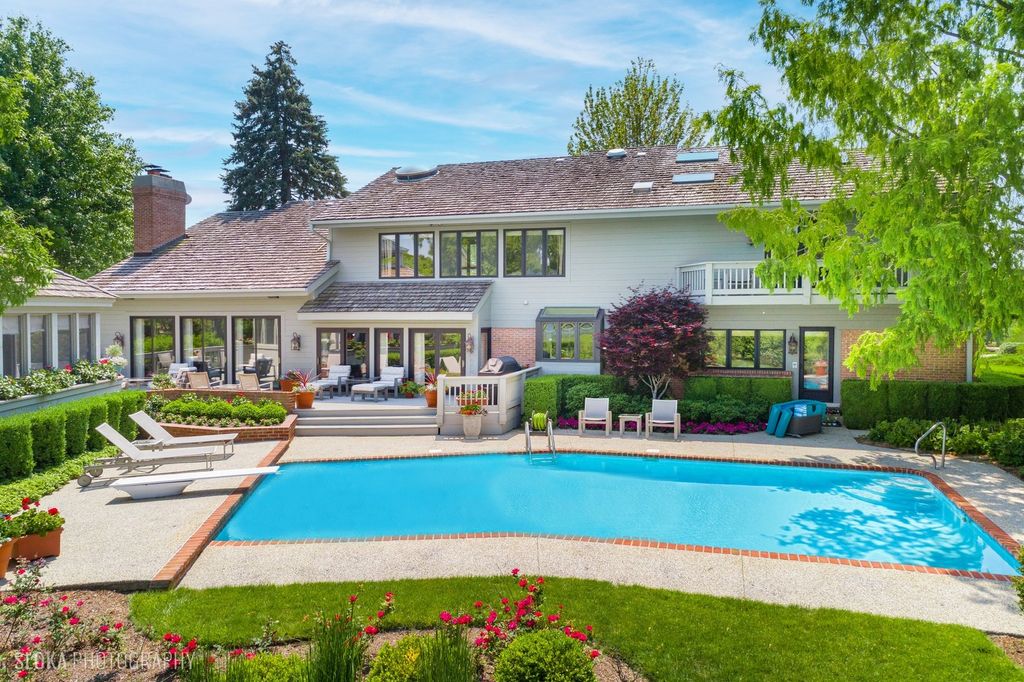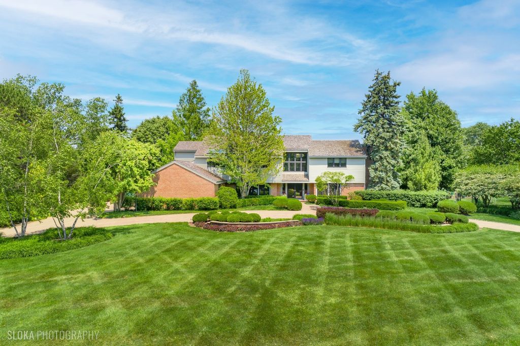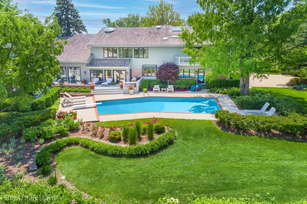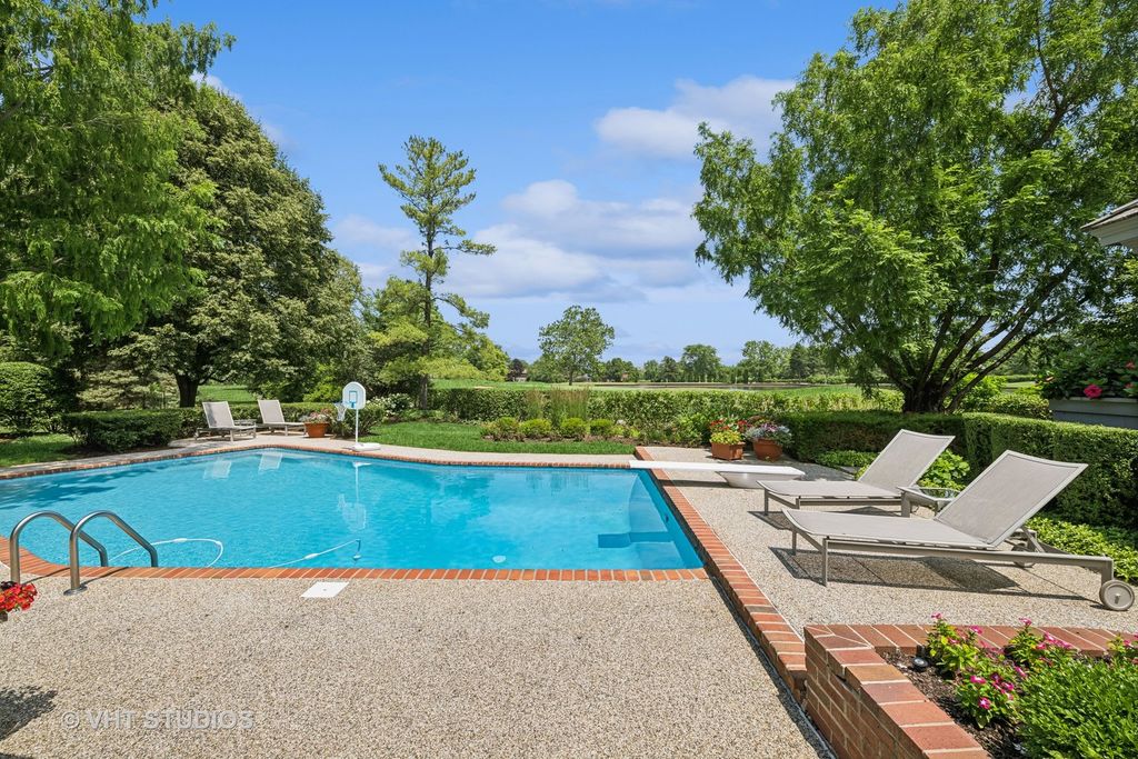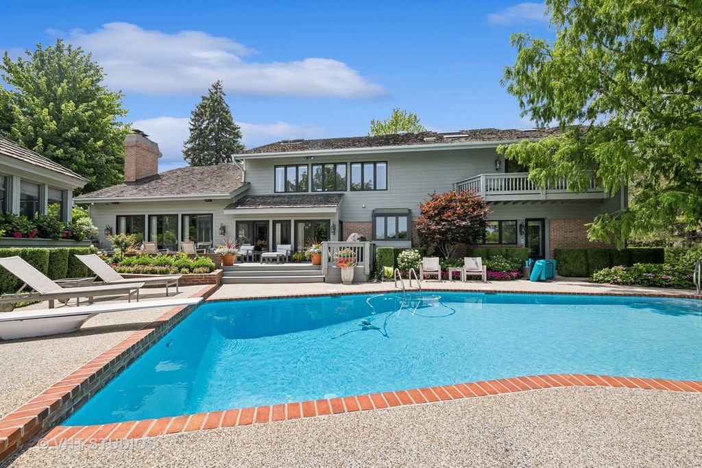 Prepare to be amazed by this extraordinary custom-built home, perfectly positioned to capture breathtaking golf course and pond views in coveted Country Club Estates. Reimagined with nearly $1M in renovations since 2020, this stunning residence offers over 6,300 sq ft of refined living space and an unparalleled outdoor oasis designed for resort-style living. A private backyard retreat awaits with a sparkling inground pool, expansive deck, and screened gazebo-perfect for al fresco dining or quiet evenings outdoors. Inside, the home impresses with a comfortable, contemporary flow and soaring two-story entry anchored by a dramatic curved brick accent wall spanning all three levels. The showstopping great room features vaulted ceilings, custom built-ins, a floor-to-ceiling gas fireplace, and sliders that open to the pool and deck. The adjacent chef's kitchen is a dream, boasting custom cabinetry, quartzite counters, an oversized island, top-tier appliances, and a sunny breakfast area with additional access to the rear deck. A large formal dining room sets the stage for unforgettable gatherings, while the private office provides a quiet space to work from home. Ideal for multi-generational living, the first-floor guest suite includes a full ensuite bath. A spacious laundry room with custom cabinetry, access to the pool area, and a three-car heated garage with epoxy flooring add function and convenience. Upstairs, the luxurious primary suite is a true sanctuary with panoramic views, a cozy sitting area with curved brick detail, dual walk-in closets, a private balcony, and a spa-like bath with whirlpool tub, separate shower, and his & her vanities. Three additional bedrooms include one ensuite and a shared Jack & Jill bath. A walk-up attic offers easy access for seasonal storage. The finished lower level is bursting with personality, offering a vibrant retro vibe with recreation, game, and exercise rooms, a custom dining booth, wet bar with seating for six, a dedicated craft room, and generous storage space. Professionally designed landscaping, beautiful terracotta flooring, circular paver driveway, and countless high-end details elevate this home to a class of its own. Located in award-winning Stevenson High School district and just minutes to charming downtown Long Grove, shopping, dining, and expressways for a quick trip to the city, this is luxury redefined.