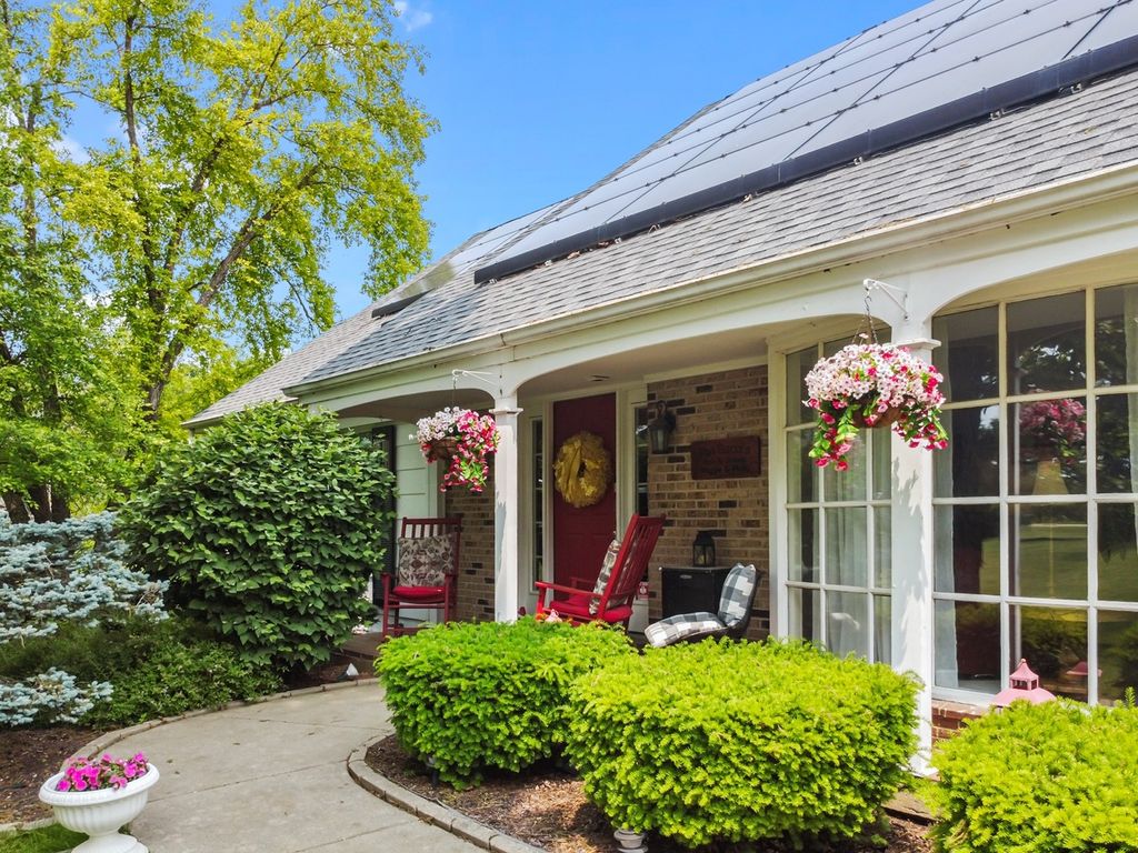 IMPROVED PRICE! Radiating country charm, this home has a warm, inviting atmosphere that makes it hard to ever want to leave. It all begins as you turn onto the drive, winding past mature trees that lead you to the home. The circular driveway gracefully guides guests past the front entrance, while a side-load three-car garage offers ample space for vehicles and recreational gear. You'll enjoy ultimate privacy with over 3 acres of land surrounding the home. A charming front porch welcomes you into the two-story foyer, where a graceful curved staircase and detailed millwork create a striking first impression. The thoughtfully designed layout features a first-floor primary suite with serene views of the backyard and visiting wildlife. You'll also find a spacious office, a formal dining room, and a classic kitchen with bright eat-in area-perfectly suited for both everyday living and entertaining. Two fireplaces add warmth and charm-one in the living room and another in the family room-creating cozy spaces to gather and relax. The detailed millwork and cabinetry throughout creates a feeling of timeless elegance and refined craftsmanship. A combined laundry, mudroom, and pantry offers versatile flex space to keep your home organized and running smoothly. The first floor full bathroom offers seamless convenience for all guests, whether they're relaxing indoors or enjoying the pool outside. Venture up one of the home's two staircases to discover three spacious ensuite bedrooms, a versatile bonus room, and ample storage throughout. The basement offers a wide-open space ready for you to create your perfect recreation room! The backyard oasis is complete with 30'x40' deck and pool cabana. New Architectural Shingle Roof in 2017. Solar panels added 2018. Wiring for a whole-house generator is already installed, along with tubing for a central vacuum system. Equipped with two furnaces, two A/C units, and dual 80-gallon water heaters, this home ensures year-round comfort and efficiency. A large shed offers plenty of extra storage-ideal for lawn equipment and winter storage of pool toys! Zoned A1, Horses Allowed. No HOA rules/regs or fees! Bring your vision and transform this space into your own personal oasis!
