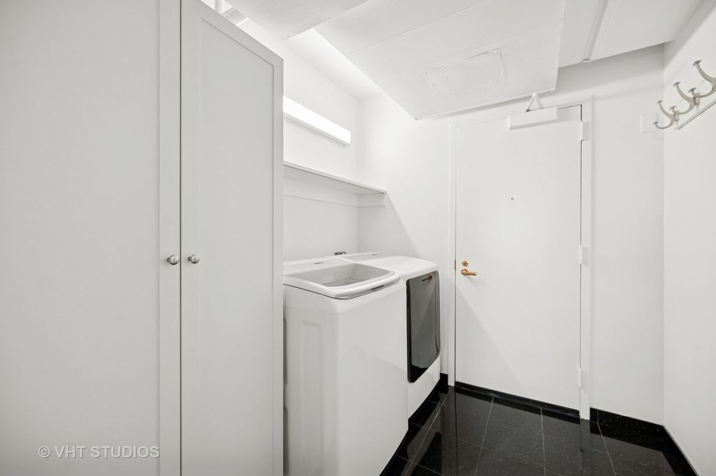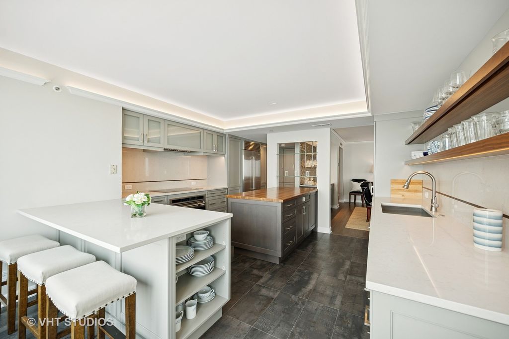 Perched on the 51st floor above the Four Seasons Hotel in Chicago's iconic Gold Coast, this expansive 3 bed, 3 bath corner residence offers panoramic north and east views of Lake Michigan and the city skyline. Renovated in 2017 with a modern, streamlined aesthetic, the home features an open-concept living and dining area, a spacious home office or third bedroom, and wide-plank oak flooring. The chef's kitchen is outfitted with Sub-Zero and Wolf appliances, porcelain tile floors, a striking walnut island, custom two-tone cabinetry, and open shelving for display. The primary suite is a serene retreat with a Victoria & Albert soaking tub overlooking the lake, marble tile, a walk-in shower, and a large dressing room / walk-in closet. The second bedroom includes its own full bath, while a third full bath, in-unit laundry room with storage, and a built-in dry bar offer added convenience. Enjoy full-service living above the Four Seasons Hotel Chicago, with optional access to hotel amenities including room service and spa offerings-all just steps from world-renowned shopping and dining on Michigan Avenue. Don't miss this rare opportunity for turnkey luxury in one of Chicago's most prestigious addresses.