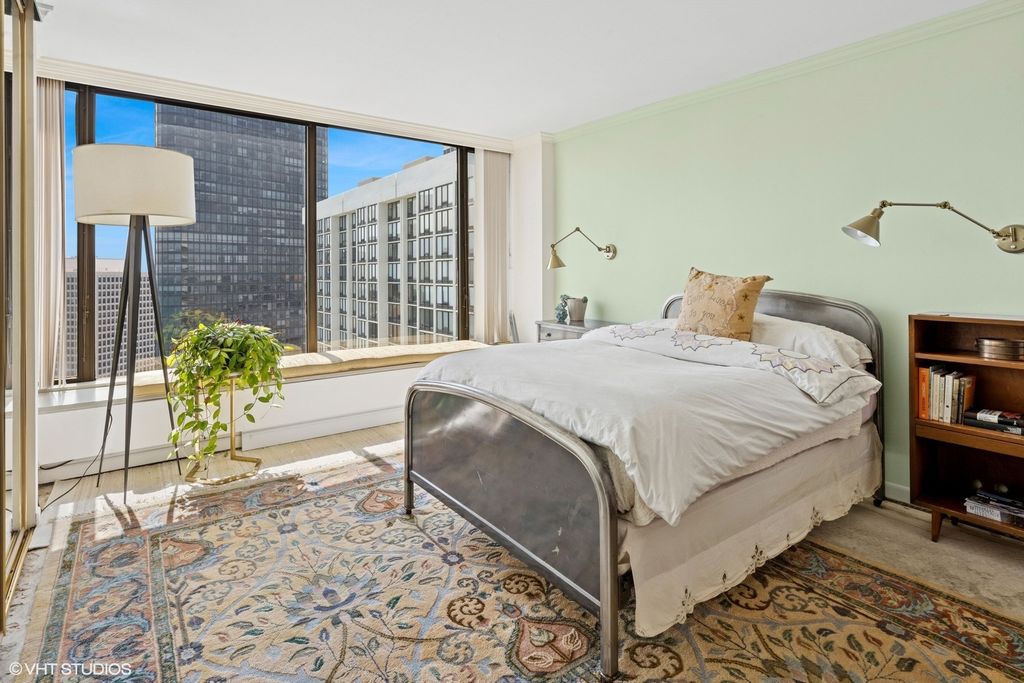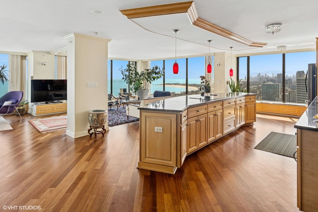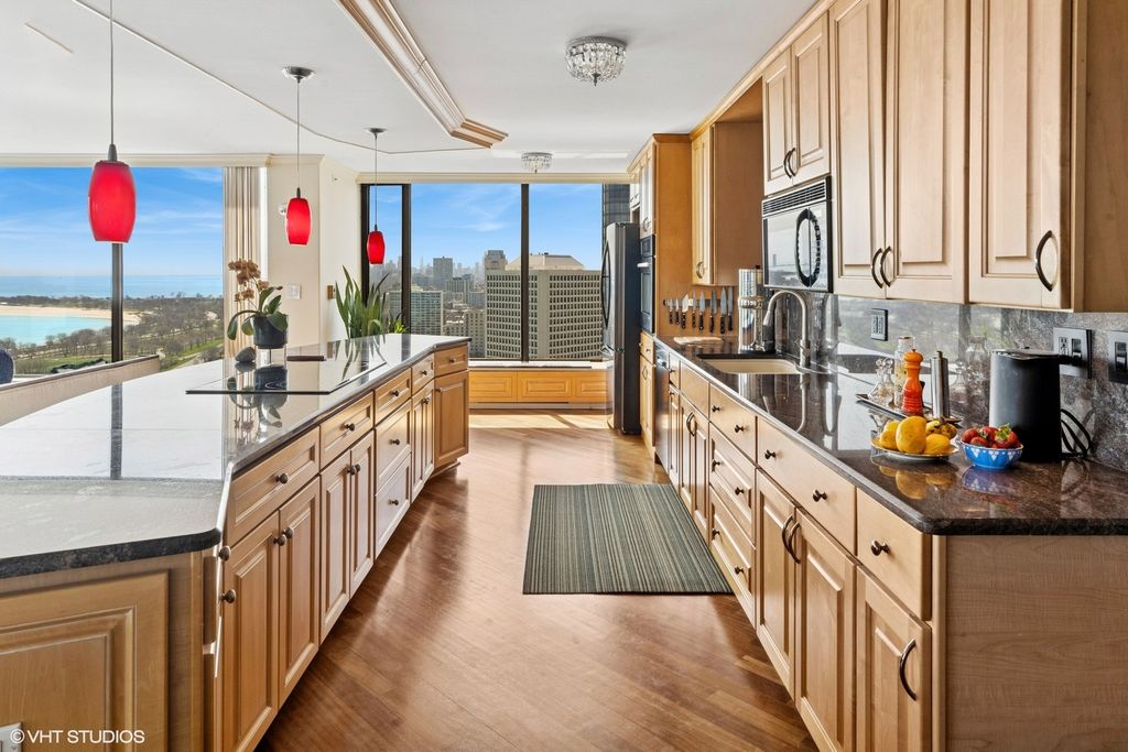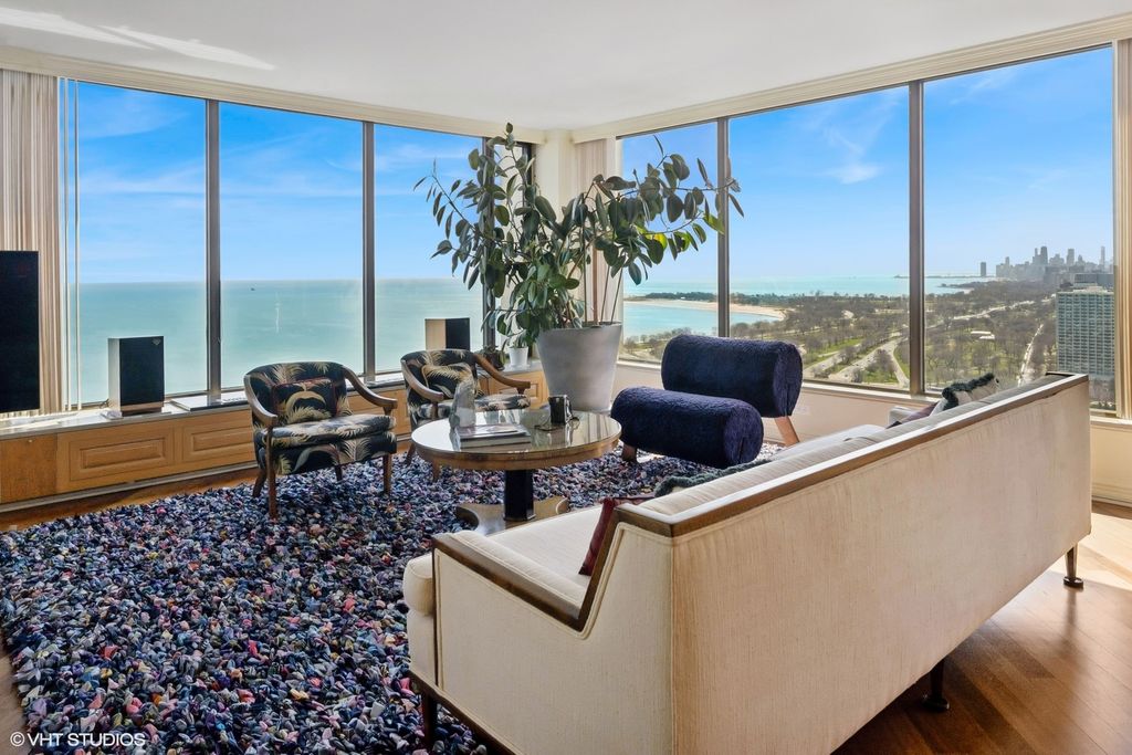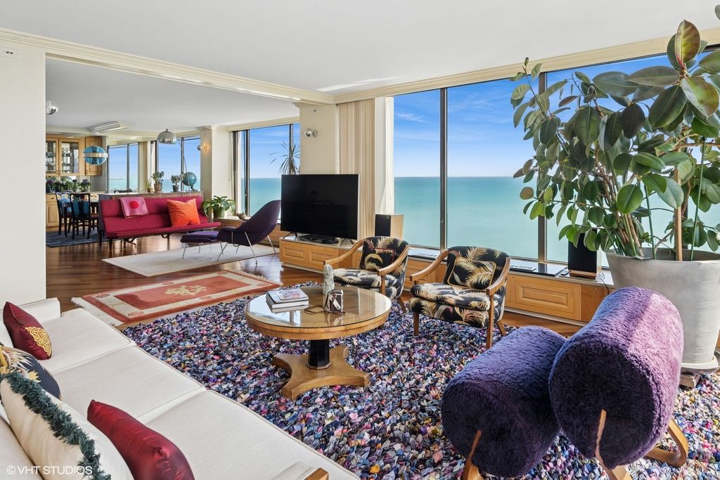 Spectacular lake-front living in this iconic mid-century modern building by renowned Chicago architecture firm in Chicago's Edgewater Beach community! This high-floor double corner unit commands unobstructed and breathtaking views east to the lake and beaches, south to the city skyline and north to Evanston and beyond. Two 2-bedroom corner units were combined to create a 2,685 sq ft oasis filled with abundant natural light. This unit is one of only three combined units in this full amenity building - a rarity to come to market. The unit features hardwood cherry floors throughout the main living area and primary bedroom, an open kitchen with a large island that flows seamlessly into spacious open plan living, sitting and dining room areas, and three bedrooms, each with an ensuite bath, including a spacious primary bath with steam shower, heated floor and 2-person jetted bathtub. There is an additional powder room off the kitchen, and a utility closet with a deep sink off the primary suite. Wake up to gorgeous sunrises over the lake from the primary bedroom, enjoy cooking and entertaining in your expansive kitchen and living area, or simply marvel at the ever-changing moods of our Great Lake. This well-managed building offers 24-hour door staff and onsite management, and a variety of amenities including an outdoor pool with cabanas and a veranda, a library, two party rooms, a rooftop sun deck, and a bike storage room. Additional neighboring access to tennis courts, indoor swimming pool and fitness club is available. On the park side of the building there are BBQ grills, a playground and a dog run. The location is a dream for outdoor enthusiasts, with fantastic direct access to Lincoln Park and lakefront bike trails just outside the back door. Easy access to DuSable/LSD, Express bus to/from downtown just out the front door and newly renovated red line train make this transportation-oriented neighborhood lively and accessible. An array of fine restaurants and shopping options are nearby, including Mariano's and Jewel Osco. Valet or self-park options offered in the onsite garage. Pet-friendly building. Assessments include heat, A/C, and cable/internet. With so much to offer - from views to amenities to location - this is a truly special property and a great place to live!