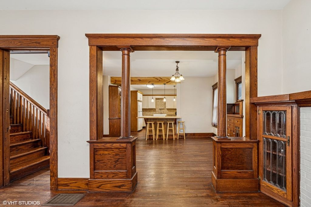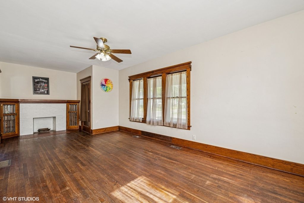 Latest price adjustments-$5000 Off- Step into this enchanting 1900s century home and be captivated by its timeless charm and character, no matter which entrance you choose-front, side, or back. Enjoy relaxing summer evenings on the expansive front porch, a perfect spot to unwind. Inside, discover the home's unique features, including stunning hardwood floors and custom-built cabinetry that showcases the craftsmanship of the era. The living room boasts a decorative classic fireplace with built-in cabinets, offering both elegance and practical storage solutions. The grand open staircase adds a touch of sophistication to the home. The second floor accommodates three generously sized bedrooms, providing ample space for family and guests. This home is equipped with a modern two-zone heating system for comfort throughout the seasons. Additional amenities include a large attached two-car garage with extra space on the concrete driveway, offering convenience and plenty of parking. The full unfinished English basement provides endless possibilities for customization and also offers direct access to the garage. While significant work has been done to enhance this home's appeal, it still requires some finishing touches. The pricing reflects its current condition, presenting an excellent opportunity for those looking to add their personal touch to a historical gem!