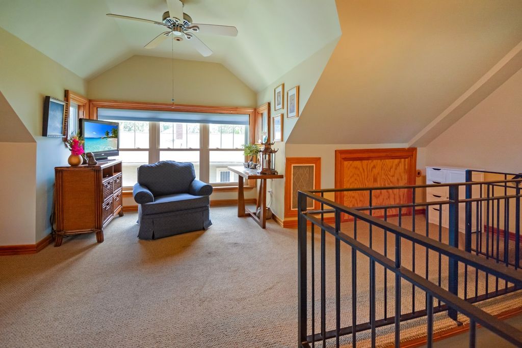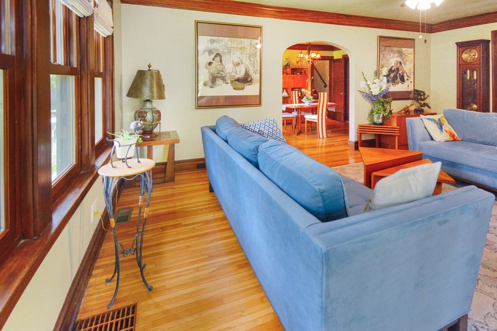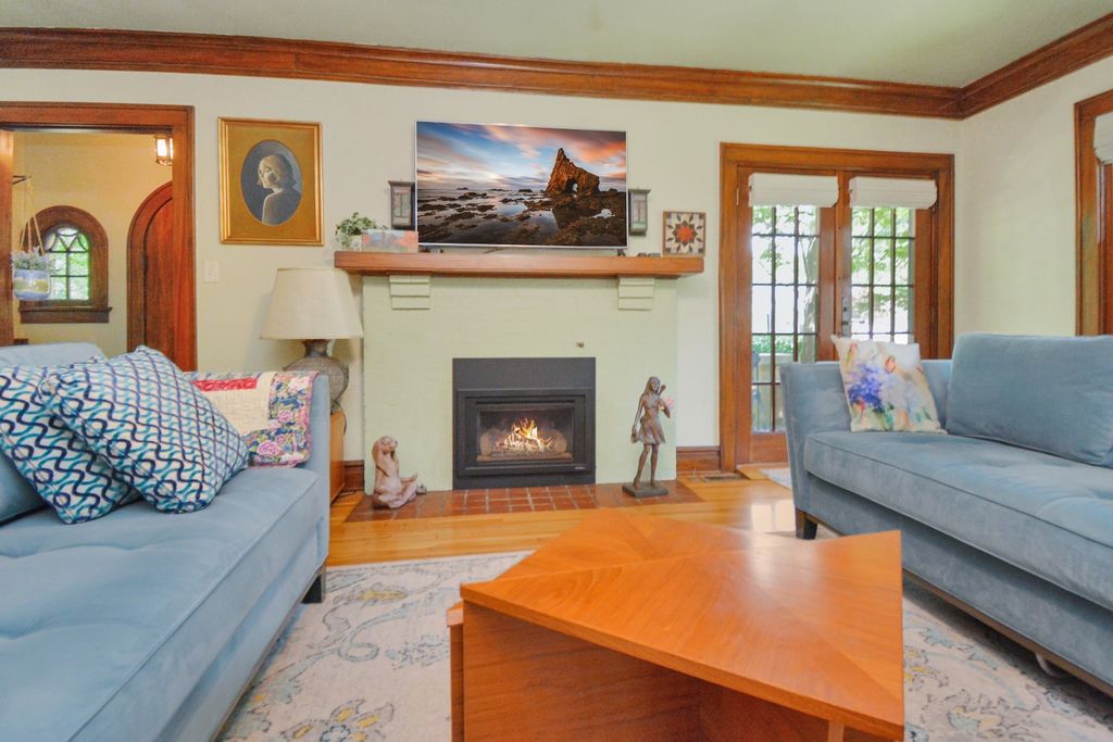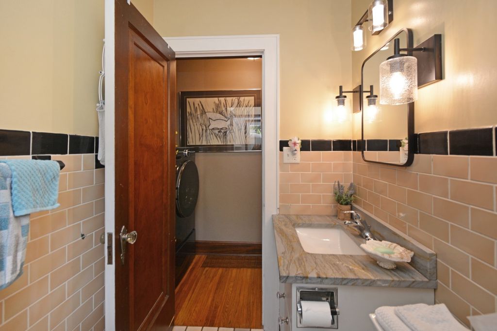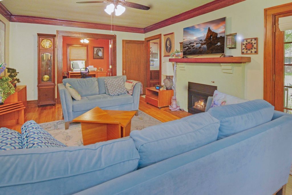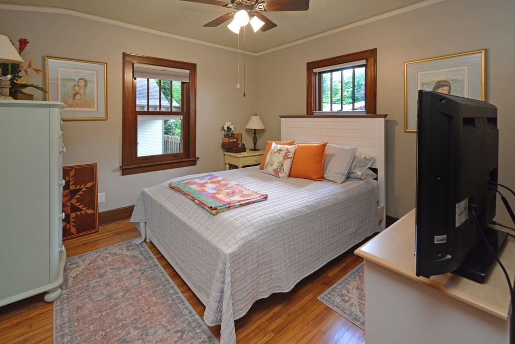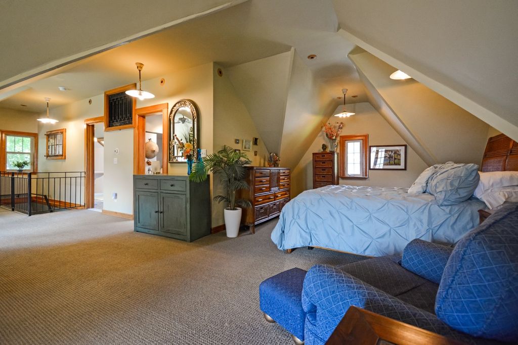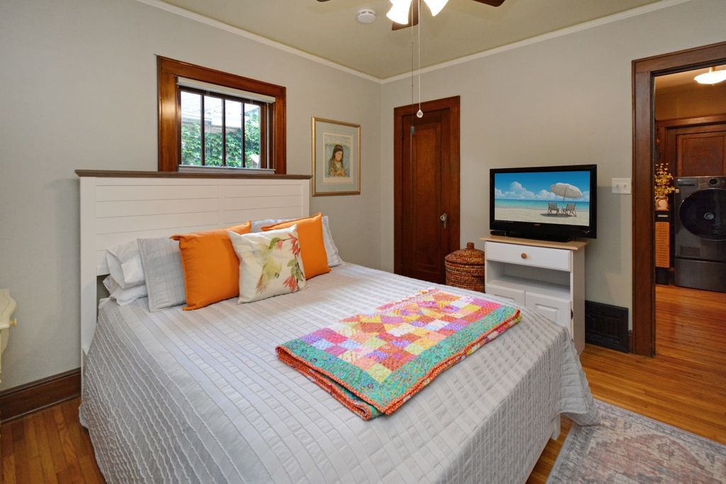 Located on one of the most picturesque streets in Founder's Grove, this 3 bedroom, 2 bath gem is quite possibly the most stunning all-brick bungalow in Bloomington-Normal! From the moment you step through the curve-topped front door, you'll be captivated by the home's timeless beauty: Original hardwood floors, natural wood trim, and elegant crown molding set the tone for a truly special living experience. This home has been meticulously maintained and thoughtfully updated with some of the finest upgrades imaginable. Two bedrooms and one full bath are located on the main level... however the expansive second-floor master suite is a true retreat, featuring a spacious living area, walk-in closet with high-end custom organizers, private balcony, en suite bath with a tiled shower and heated floors, and convenient laundry hookups. All three levels-including the basement, main floor, and second floor-offer laundry hook-ups, adding ultimate flexibility. The remodeled custom kitchen is a showstopper with granite countertops, new cabinetry, stainless-steel appliances, and a cozy breakfast nook. Additional recent upgrades include a new gas fireplace insert, new ceiling fans, and new custom window treatments throughout. Outside, you'll love the fully fenced and gated front yard, as well as the newer heated and insulated 1.5-car carriage-style garage with an attached covered patio. The professionally landscaped yard includes an irrigation system in the front and is surrounded by other character-filled homes. This home also features a real slate roof, copper gutters and downspouts, thermal-pane windows, zoned heating and cooling, and completely updated electrical and plumbing systems. All appliances stay-including the fancy LG washer/dryer combo on the main level. Truly a rare find that combines classic bungalow charm with top-tier modern updates-this home is a must-see.