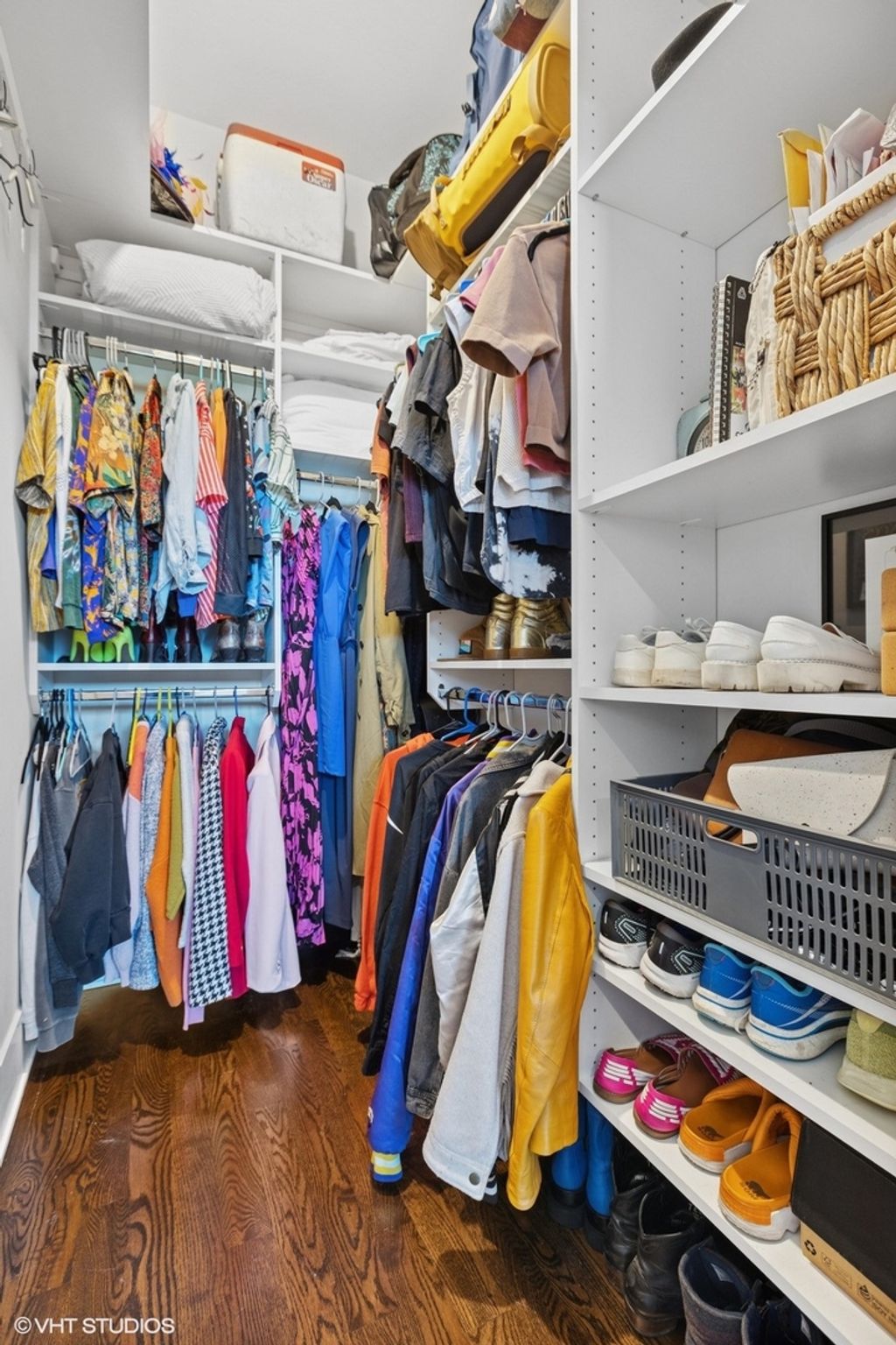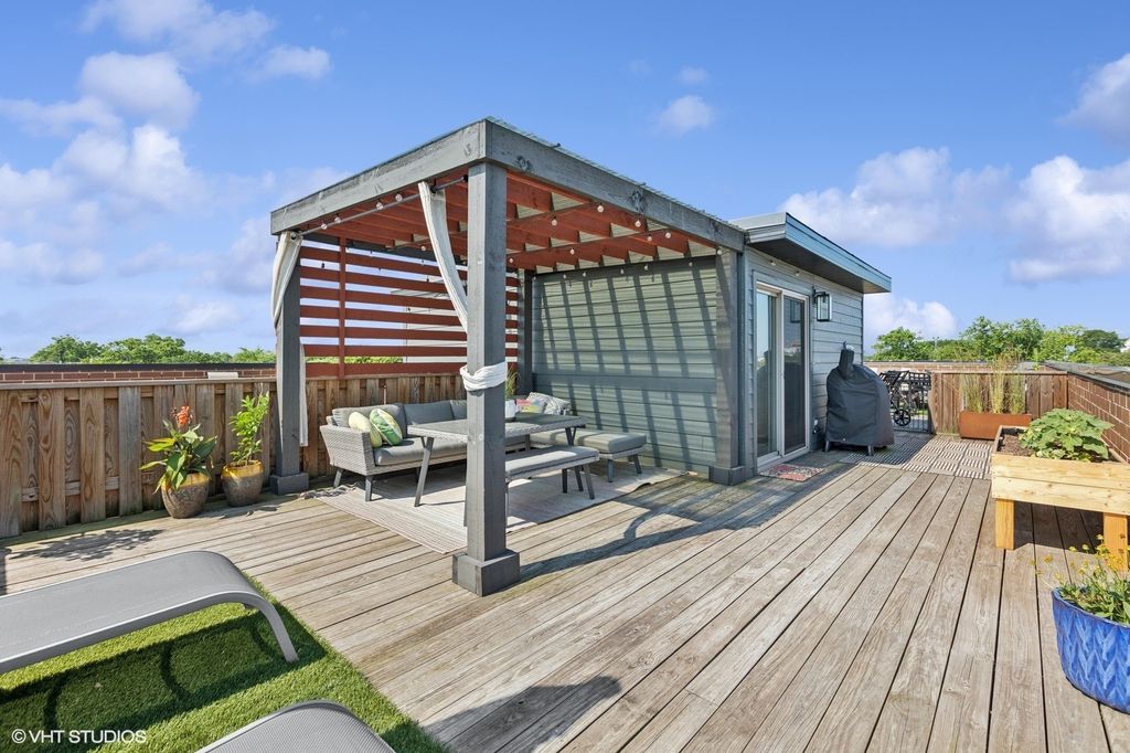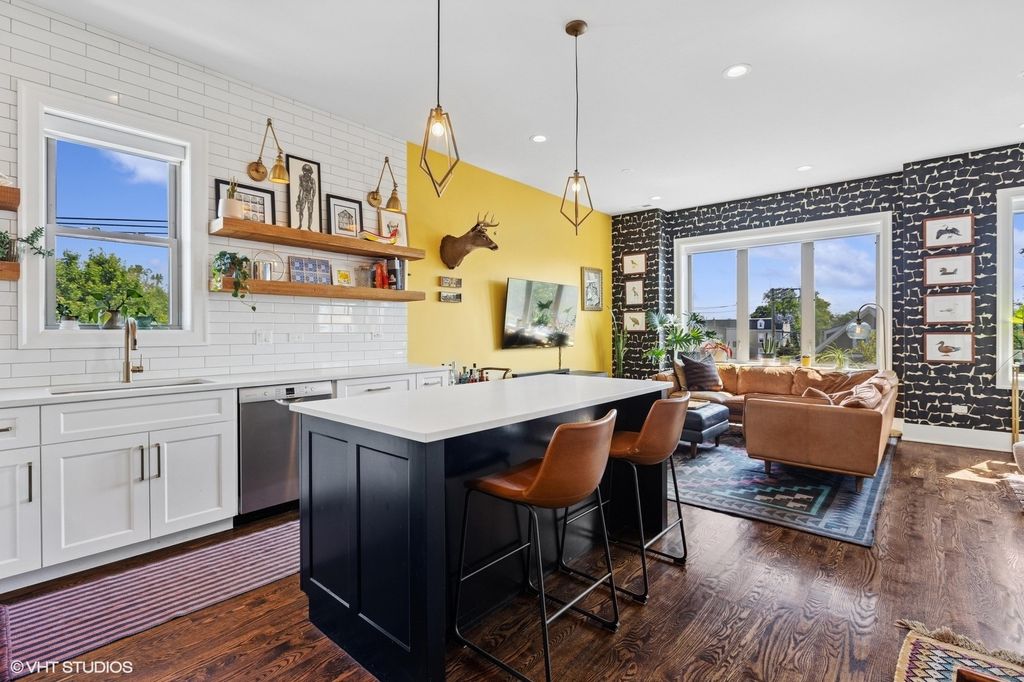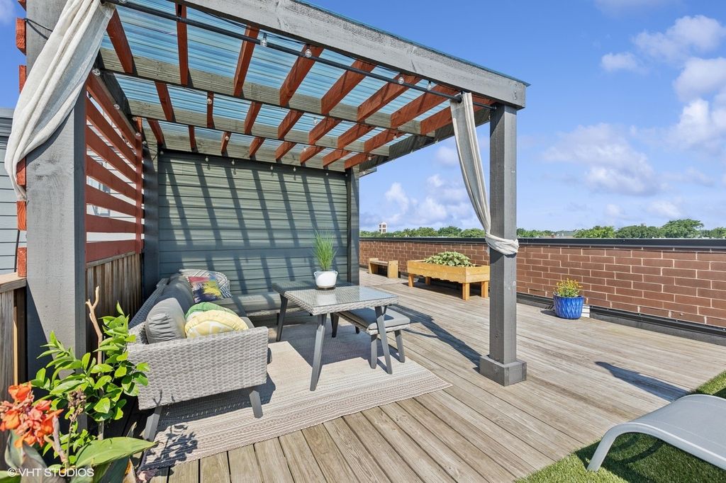 Bold style meets thoughtful design in the heart of Logan Square! This stunningly updated 2 bed, 2 bath condo is the epitome of fun and sophistication. The show-stopping kitchen is an entertainer's dream, featuring reclaimed wood shelving set against a full-height tile backsplash, accented by chic articulating sconces. Slate appliances and brushed brass hardware complement the bold Tricorn Black island, creating a look that's truly unmatched in the market. The open living and dining area easily accommodates full-size furnishings, perfect for gatherings and everyday comfort. An interior staircase leads to your private 750 sq. ft. rooftop deck, ideal for entertaining, with sweeping skyline views. The luxurious primary suite offers a walk-in closet, dual vanity, and a spa-inspired shower that invites relaxation. Set within a full masonry building just one block from Kosciuszko Park and a short 12-minute walk to the Logan Square Blue Line and Metra, this home delivers the perfect blend of style, quality, value, and location!