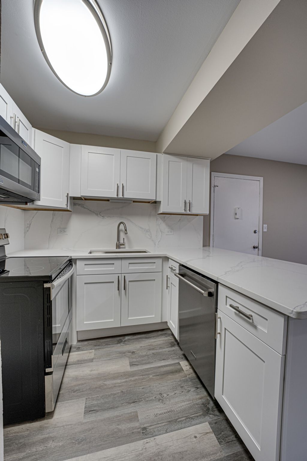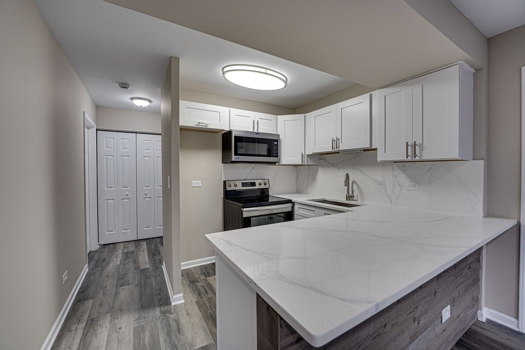 Discover the perfect blend of comfort and convenience in this stunning first-floor condo with an elevated lake view within the desirable Four Lakes resort community. This beautifully remodeled one-bedroom, one-bathroom home features updated finishes, including new white shekhar kitchen cabinets and luxurious white and grey quartz countertops and matching backsplash, creating an inviting space for both relaxation and entertaining. The spacious living room, highlighted by a cozy wood-burning fireplace, flows effortlessly through floor-to-ceiling glass doors that open to your own private balcony with tranquil water views. Brand new bath with wainscotting title, new tub, new toilet, new cabinet, sink, and lights. Freshly painted and with new LPV flooring throughout, this home offers thoughtful details such as new doors and trim, a pantry, and an in-unit laundry set-up. The added space of an accessible storage area ensures everything has its place. Step outside and enjoy a world of amenities right at your doorstep, including canoe and boat rentals, fishing, skiing, volleyball, pools, tennis courts, and even a Frisbee golf course. With a membership, you can take advantage of the TK GYM or relax by the picnic area. Winter enthusiasts will appreciate skiing and snowboarding opportunities, while the Basecamp Pub & Eatery and a nearby convenience store provide added convenience. Easy access to the Pace bus, Metra train, and major highways (Route 53, I-355, I88, and I-55) makes your daily commute effortless. Whether you're seeking a peaceful retreat or an active lifestyle, this condo offers the perfect place to call home. LG 2.4 cu. ft. Wi-Fi Enabled Compact Front Load All-In-One Washer/Dryer Combo with Built-In Intelligence is being delivered and installed Oct 7th 2025