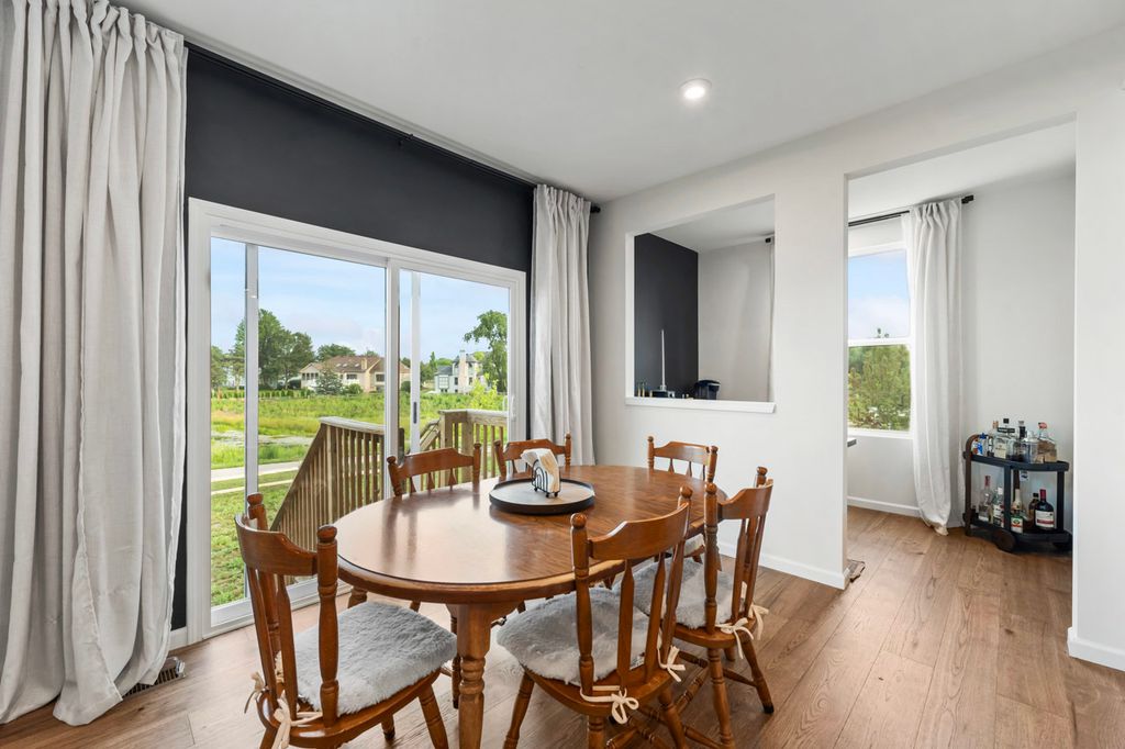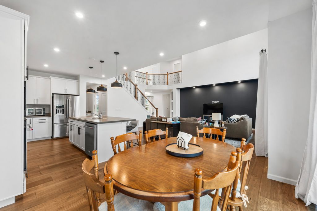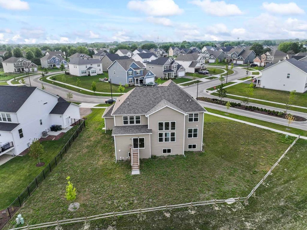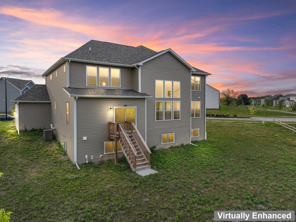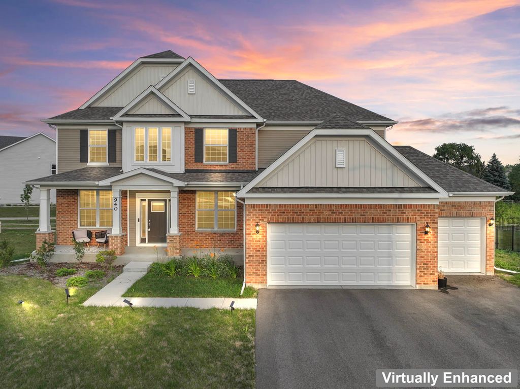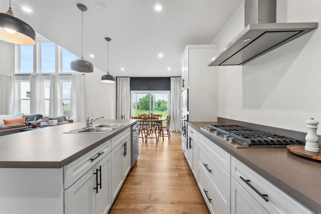 Don't miss this incredible opportunity to own a newly built home in the desirable Trails of Wood Creek, perfectly positioned on a corner lot overlooking a serene pond. This modern residence features luxury vinyl plank flooring throughout the main level, which includes a convenient bedroom and full bath with a walk-in shower-ideal for guests or multi-generational living. Upon entry, you're welcomed by separate living and dining rooms that frame the foyer, offering flexible space for entertaining or quiet retreats. The heart of the home is the stunning two-story family room, open to a spacious kitchen equipped with a large island, stainless steel gas cooktop and hood, wall oven, and built-in microwave. A nearby planning center connects to the oversized eating area and leads to a generous walk-in pantry. The main-floor laundry is discreetly located near the garage for added convenience. Upstairs, you'll find three carpeted bedrooms-one with a walk-in closet-all sharing access to a full bath with dual sinks. The luxurious primary suite includes a tray ceiling, expansive walk-in closet, dual vanities, a soaking tub, and a separate shower. An unfinished English basement with bath rough-in provides endless potential for future expansion. Tucked away yet close to shopping, dining, and healthcare, this home blends peaceful surroundings with everyday convenience.