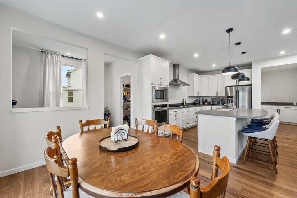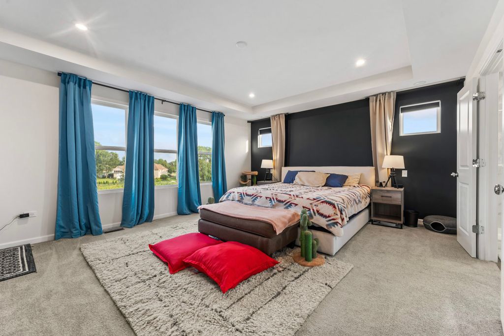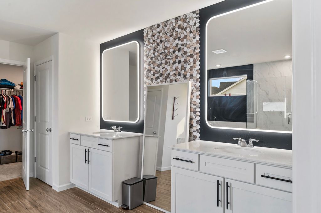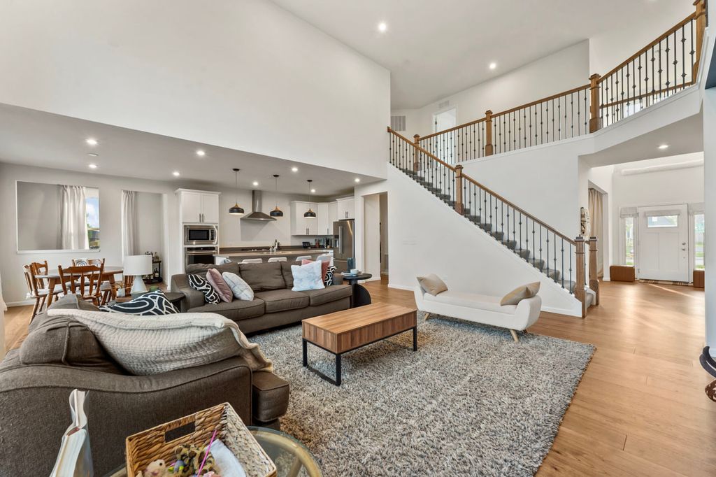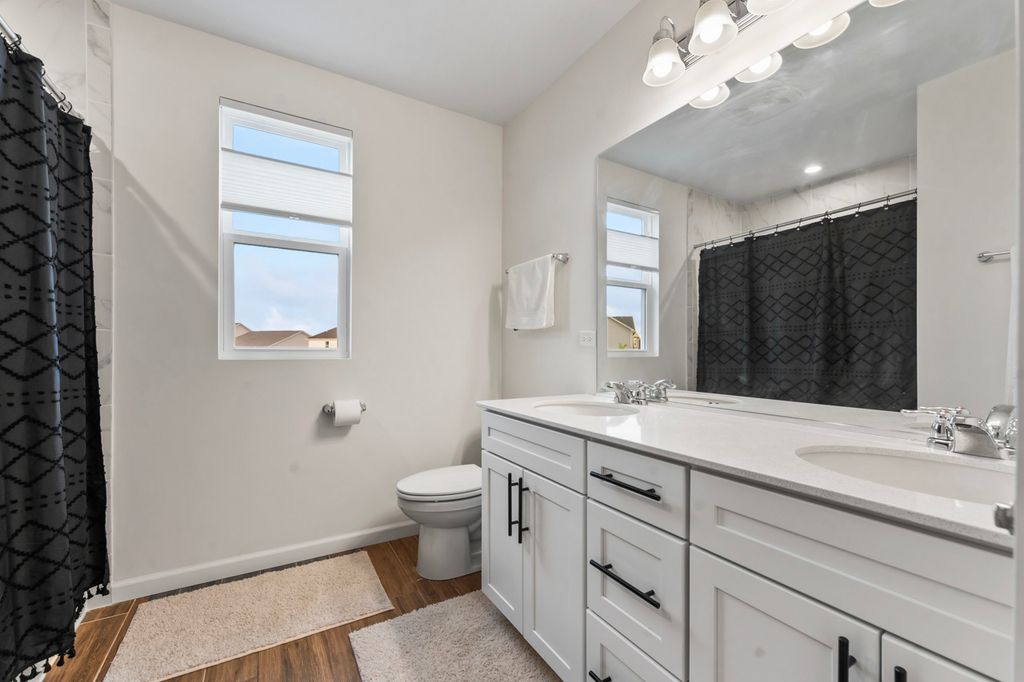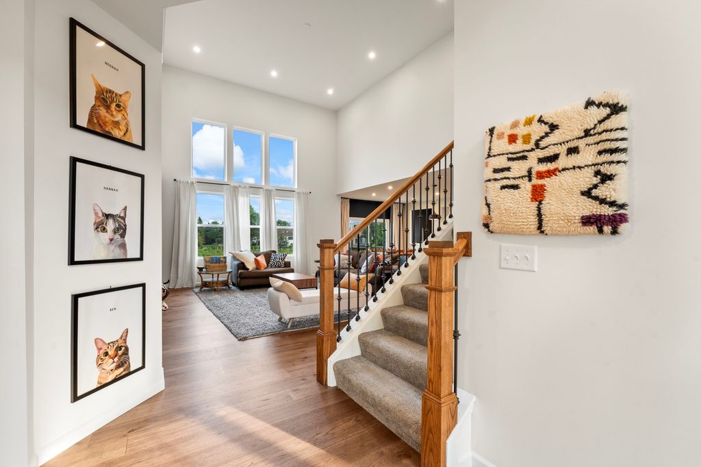 Don't miss this incredible opportunity to own a newly built home in the desirable Trails of Wood Creek, perfectly positioned on a corner lot overlooking a serene pond. This modern residence features luxury vinyl plank flooring throughout the main level, which includes a convenient bedroom and full bath with a walk-in shower-ideal for guests or multi-generational living. Upon entry, you're welcomed by separate living and dining rooms that frame the foyer, offering flexible space for entertaining or quiet retreats. The heart of the home is the stunning two-story family room, open to a spacious kitchen equipped with a large island, stainless steel gas cooktop and hood, wall oven, and built-in microwave. A nearby planning center connects to the oversized eating area and leads to a generous walk-in pantry. The main-floor laundry is discreetly located near the garage for added convenience. Upstairs, you'll find three carpeted bedrooms-one with a walk-in closet-all sharing access to a full bath with dual sinks. The luxurious primary suite includes a tray ceiling, expansive walk-in closet, dual vanities, a soaking tub, and a separate shower. An unfinished English basement with bath rough-in provides endless potential for future expansion. Tucked away yet close to shopping, dining, and healthcare, this home blends peaceful surroundings with everyday convenience.