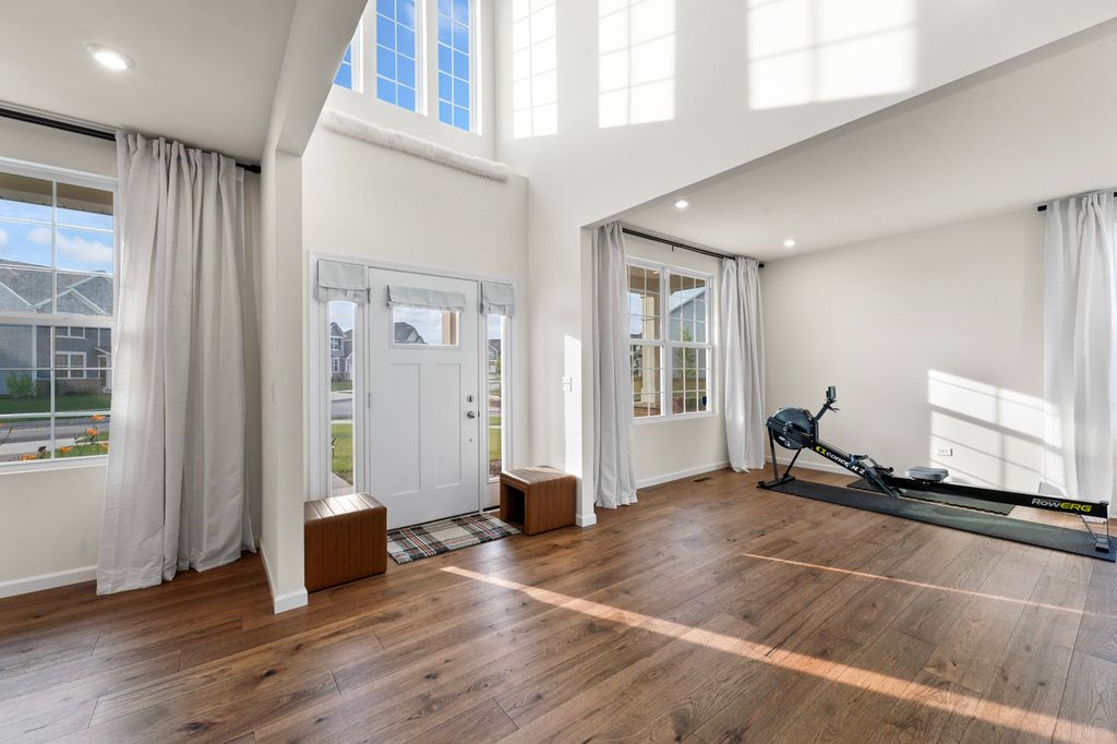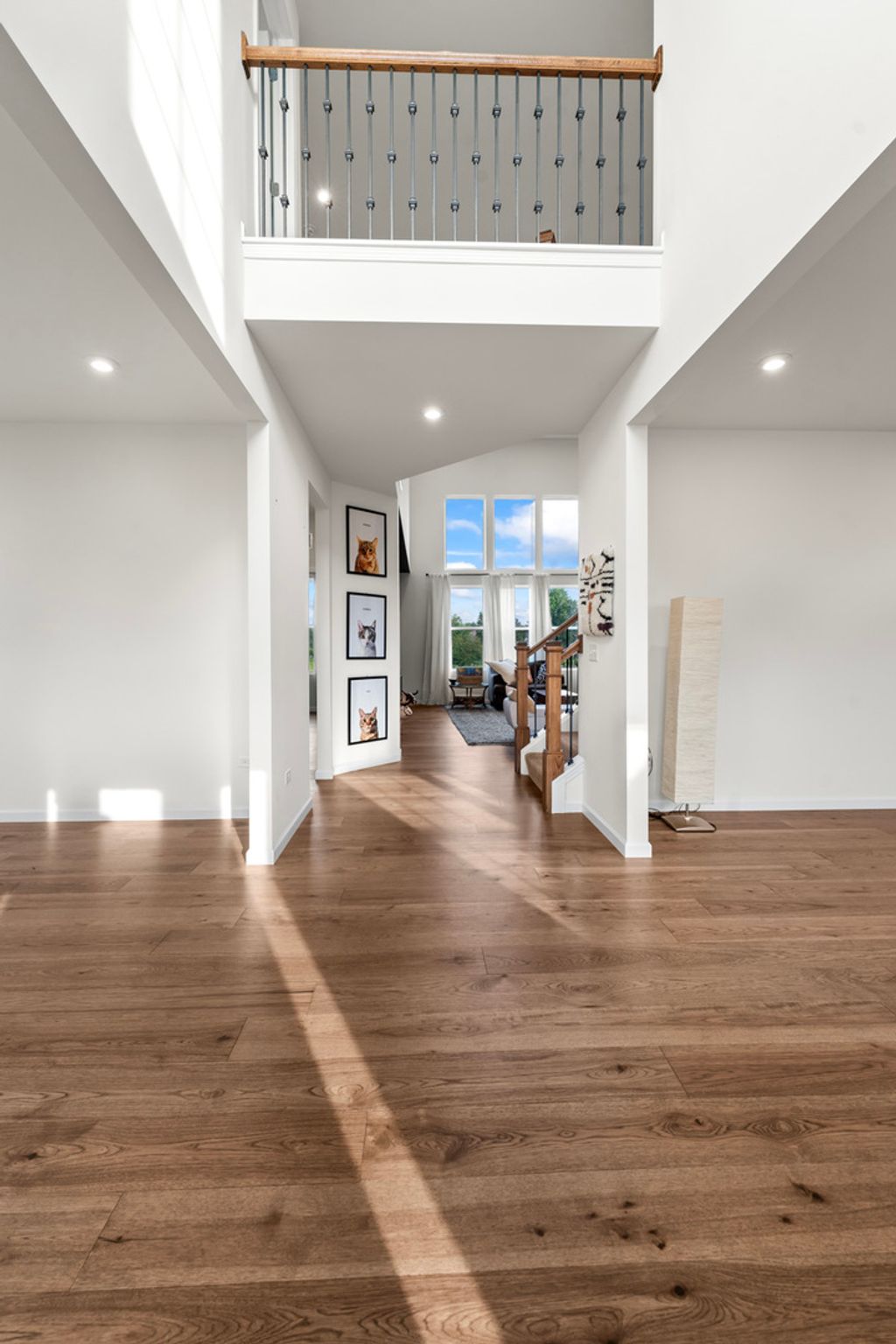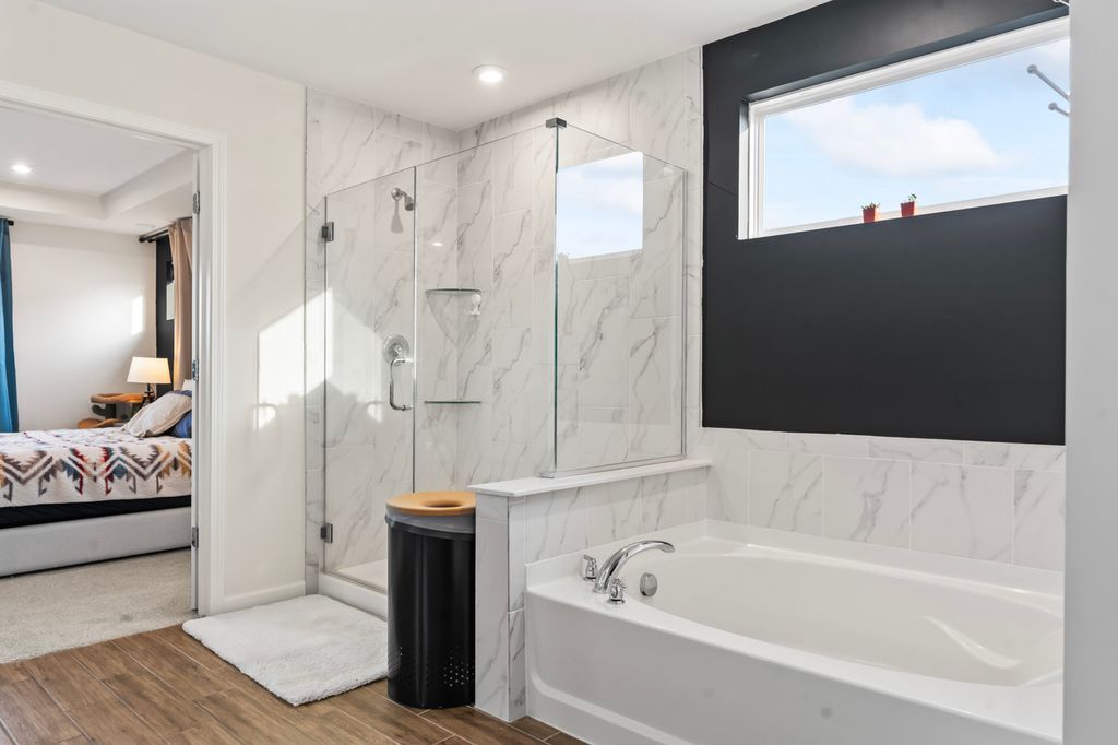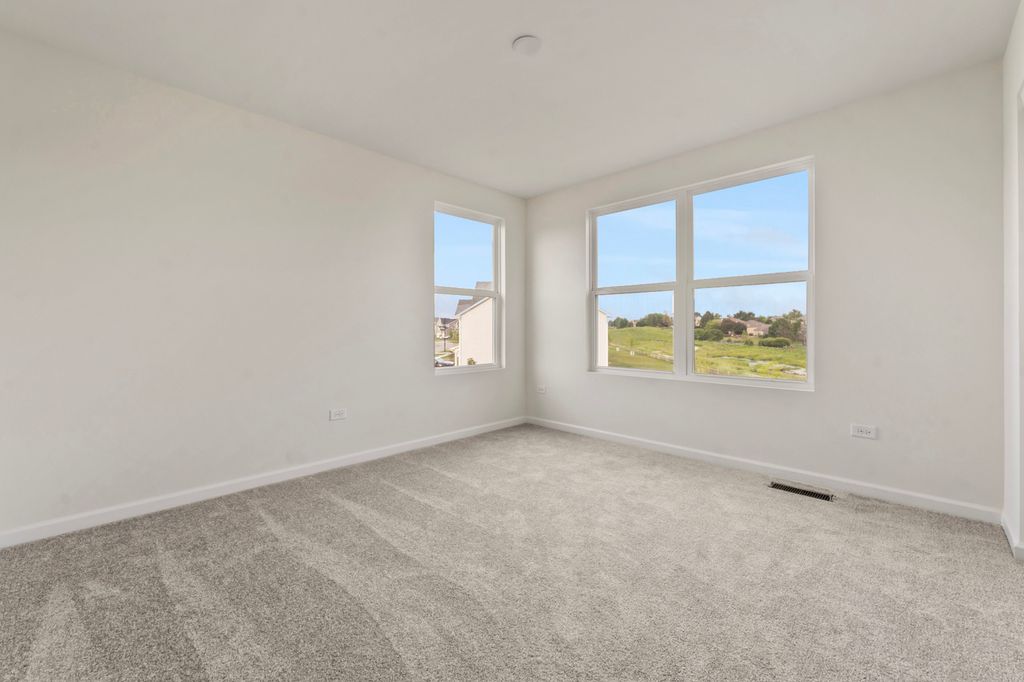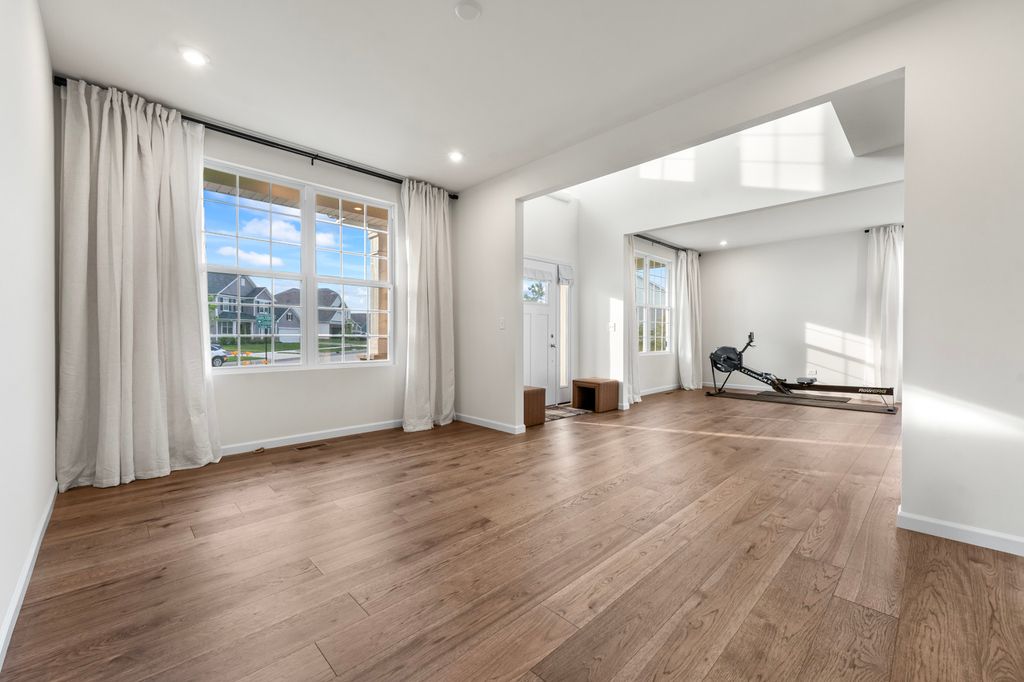 Don't miss this incredible opportunity to own a newly built home in the desirable Trails of Wood Creek, perfectly positioned on a corner lot overlooking a serene pond. This modern residence features luxury vinyl plank flooring throughout the main level, which includes a convenient bedroom and full bath with a walk-in shower-ideal for guests or multi-generational living. Upon entry, you're welcomed by separate living and dining rooms that frame the foyer, offering flexible space for entertaining or quiet retreats. The heart of the home is the stunning two-story family room, open to a spacious kitchen equipped with a large island, stainless steel gas cooktop and hood, wall oven, and built-in microwave. A nearby planning center connects to the oversized eating area and leads to a generous walk-in pantry. The main-floor laundry is discreetly located near the garage for added convenience. Upstairs, you'll find three carpeted bedrooms-one with a walk-in closet-all sharing access to a full bath with dual sinks. The luxurious primary suite includes a tray ceiling, expansive walk-in closet, dual vanities, a soaking tub, and a separate shower. An unfinished English basement with bath rough-in provides endless potential for future expansion. Tucked away yet close to shopping, dining, and healthcare, this home blends peaceful surroundings with everyday convenience.