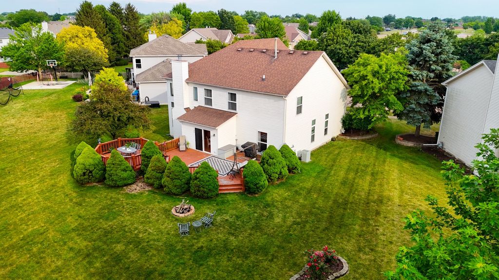 Welcome to this stunning house in the highly desirable Oakhurst North, with Naperville 204 School District! With 4 spacious bedrooms and 2.1 bathrooms, this impressive home is designed for you and your loved ones to thrive. Step inside to a welcoming foyer with rich hardwood flooring that sets a luxurious tone. The living room features soaring 2-story ceilings and an abundance of windows that flood the space with natural light. Imagine hosting memorable gatherings in the dining room, or crafting culinary masterpieces in the expansive kitchen with stainless steel appliances, a beautiful backsplash, and sleek granite countertops. The inviting family room boasts an elegant fireplace, and the conveniently located office with custom built-ins is perfect for remote work. Upstairs, the master suite features a walk-in closet and an updated bathroom with double vanities and a walk-in shower. Three additional generously sized bedrooms and an upgraded hall bathroom complete this level. The finished basement provides extra recreation space and ample storage. Picture yourself sipping coffee or unwinding with a glass of wine on your deck, surrounded by lush landscaping. Plus, you can walk to the elementary school, club house & pool, tennis court, and enjoy convenient access to Route 59 shopping and Metra. New windows 2025 & 2021, roof 2020, water heater 2022, sump pump 2022. This is the home you've been waiting for!