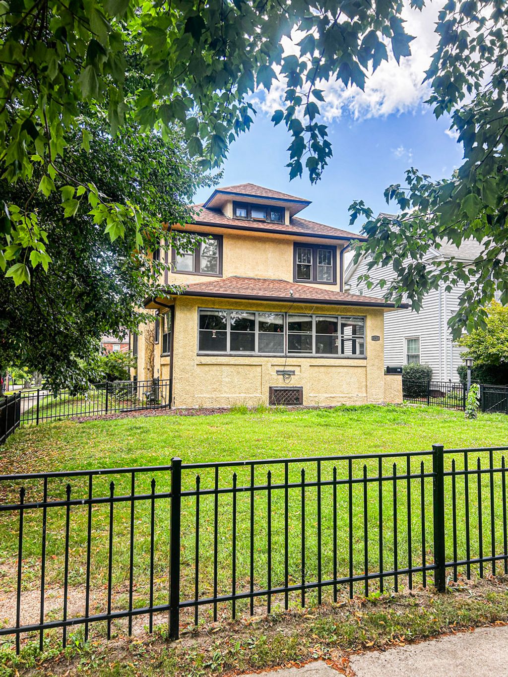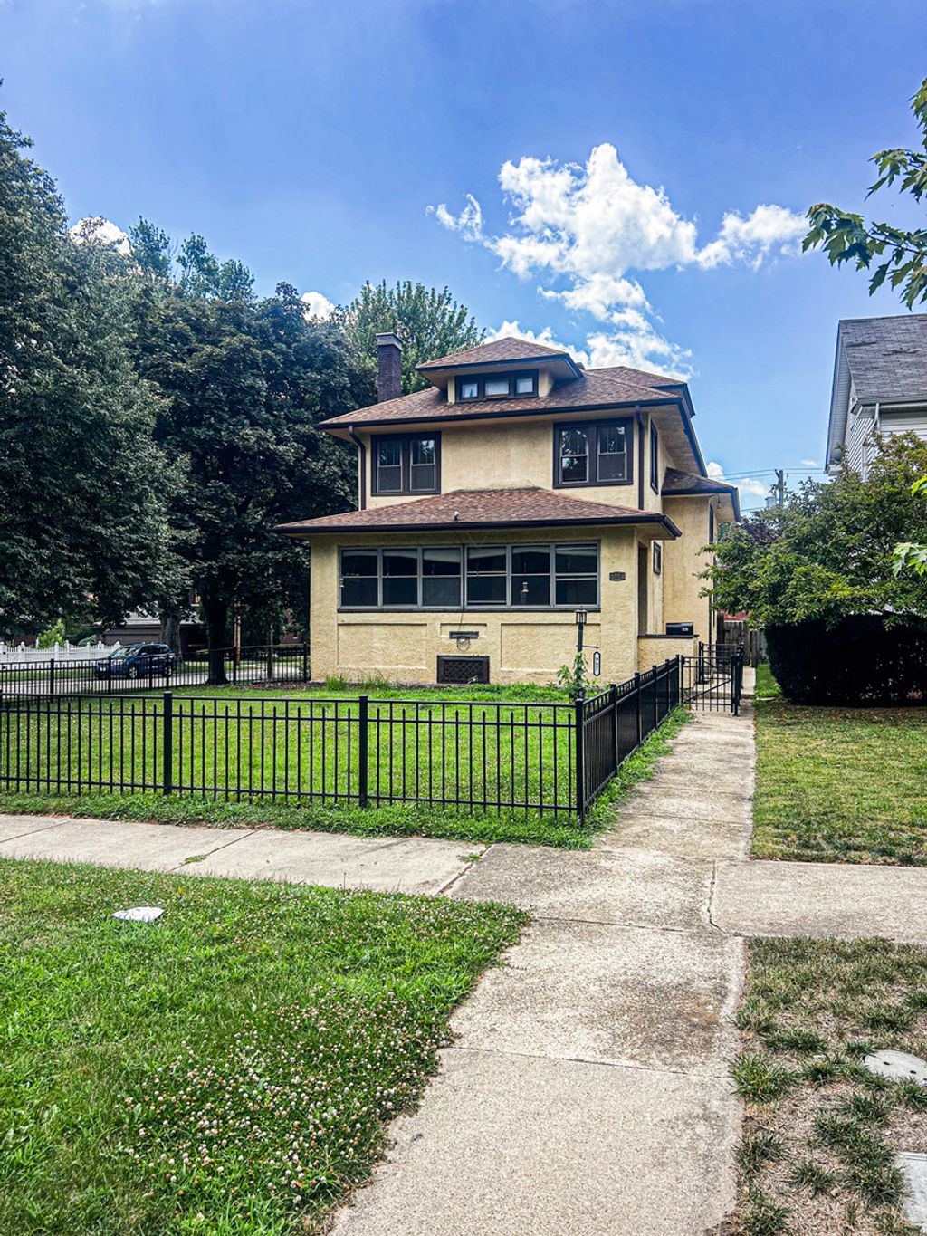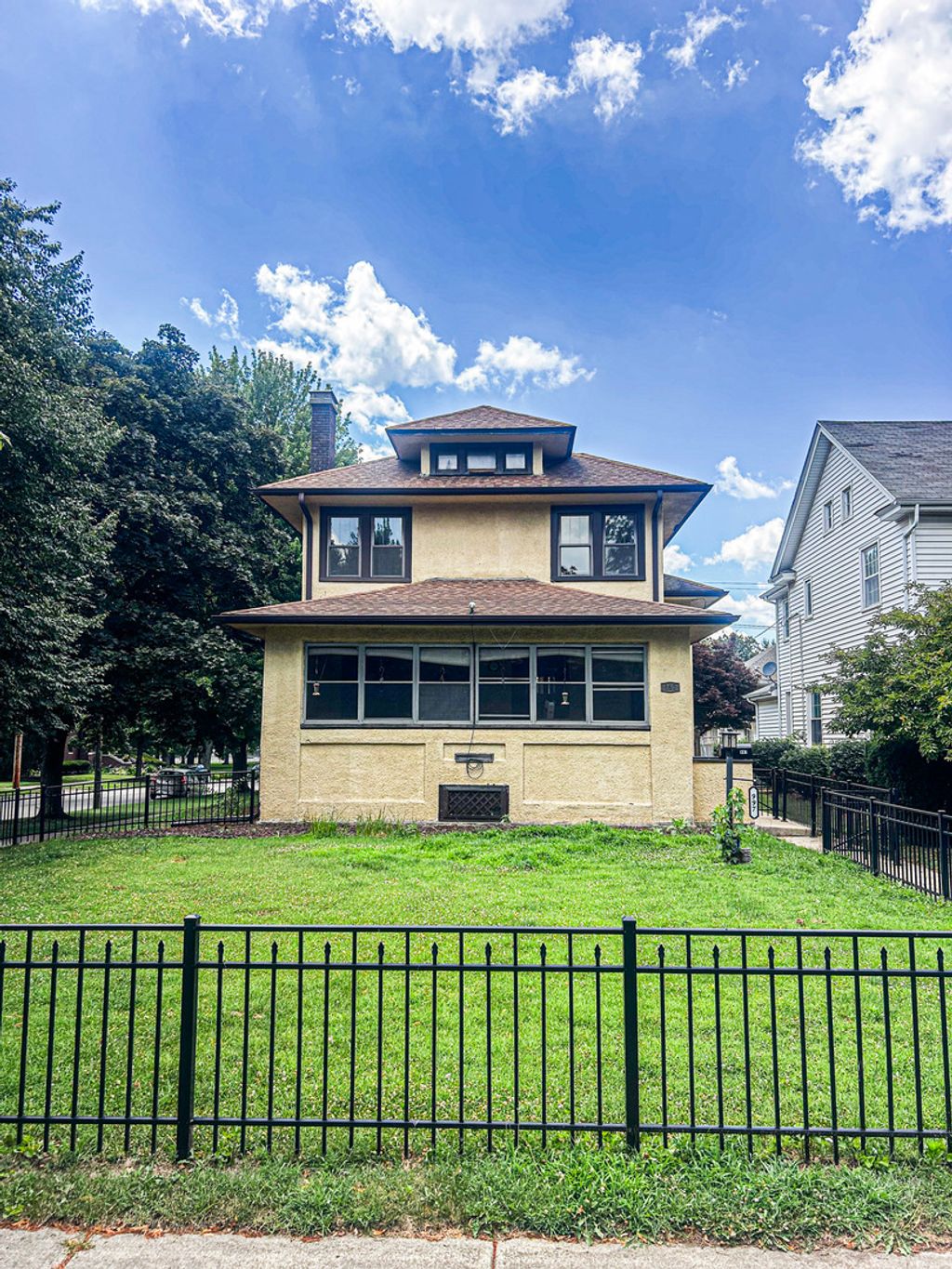 Spacious and well-maintained 3-bedroom, 1.1 bath home with a full basement, ideally located in desirable Riverview just two blocks from Cobb Park. The exterior offers a charming stucco finish in excellent condition, a fenced front and backyard, and a detached 1.5-car garage. Enjoy quiet mornings or relaxing evenings on the expansive front porch. Inside, the living area showcases beautiful original wood trim, historic crown molding, and a cozy wood-burning fireplace. French doors lead to a stunning study with unique built-in shelving, perfect for a home office or library. The kitchen features solid wood cabinetry, stainless steel appliances, and an adjacent half bath. Upstairs, you'll find three spacious bedrooms, a full bathroom, a large landing, a laundry chute, and access to a partially finished attic. The full basement includes an additional shower and laundry area, with some updated plumbing and electrical. This home is filled with character and charm-schedule your private showing today!