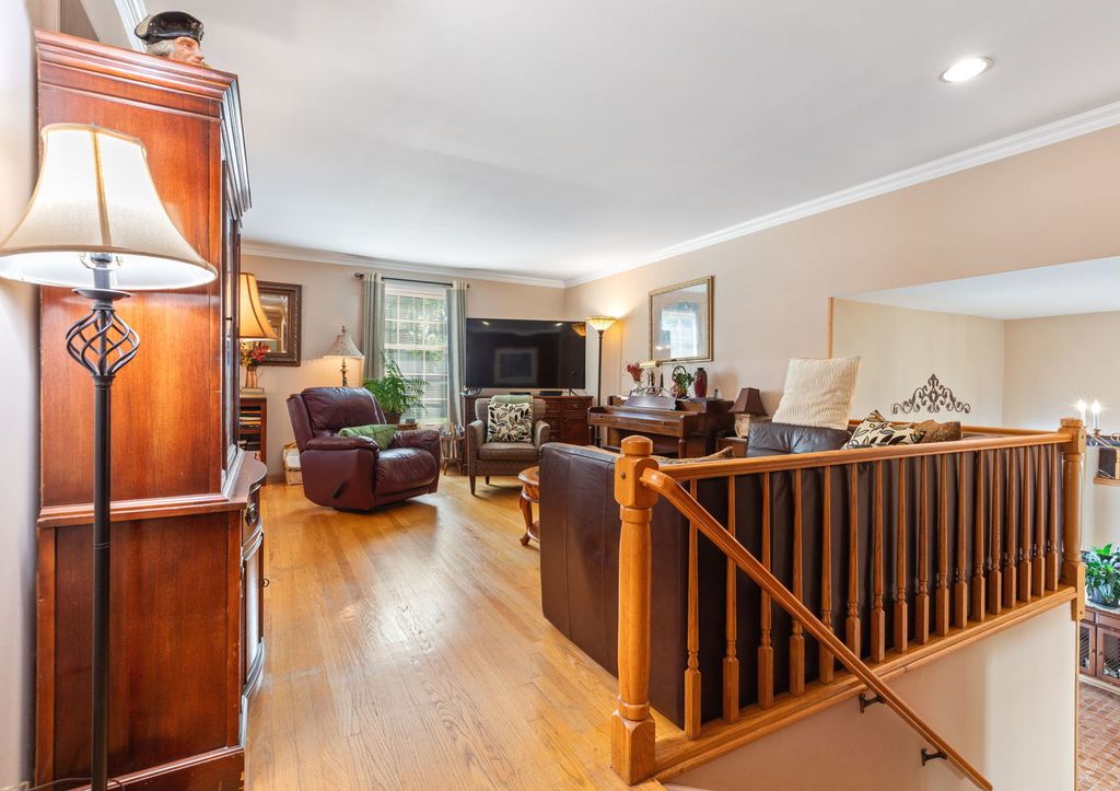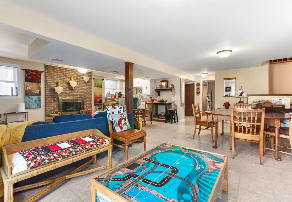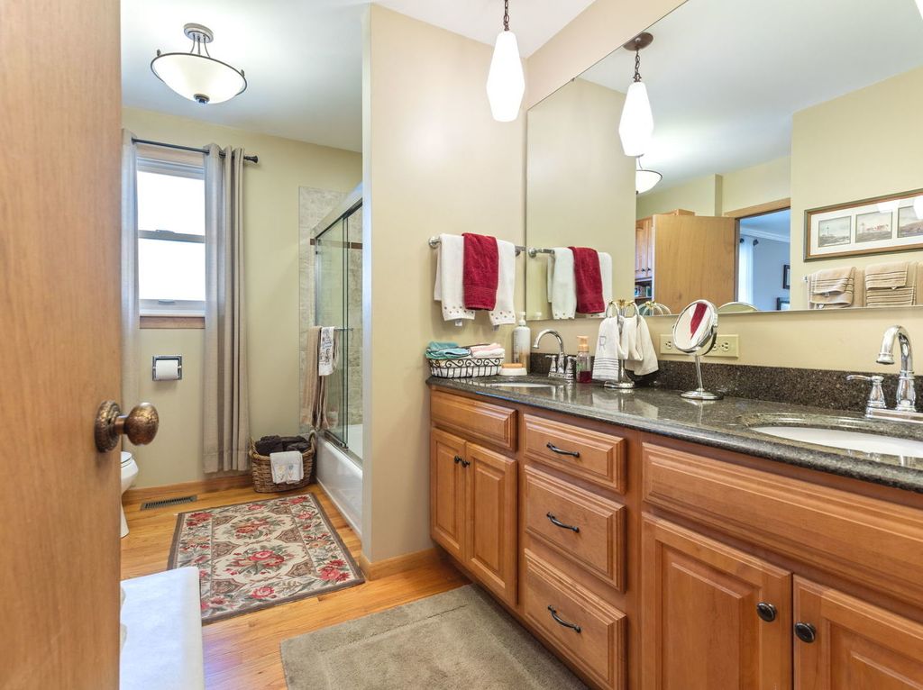 The kitchen has been beautifully updated with maple cabinetry, a convenient pantry, and a spacious peninsula offering plenty of counter space. Hardwood floors flow throughout the upstairs, complemented by elegant crown molding on the main level. Enjoy the quality of Andersen Windows on the main floor and lower-level patio doors. The lower level is designed for entertaining, featuring a generous family room with an open layout and cozy gas fireplace. It also includes a full bath, bedroom, laundry room, and an area with sink and cabinetry. Possible In-law option. Patio doors provide a private exterior entrance to the backyard. Located just steps from the neighborhood grade school, this home also includes a fenced dog enclosure just outside the garage for added convenience.