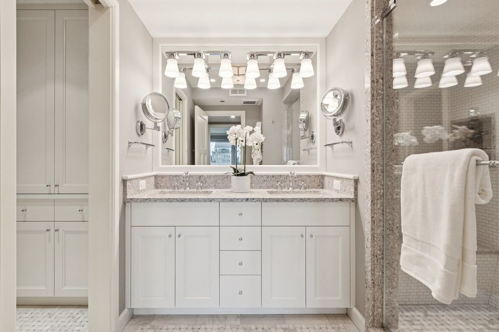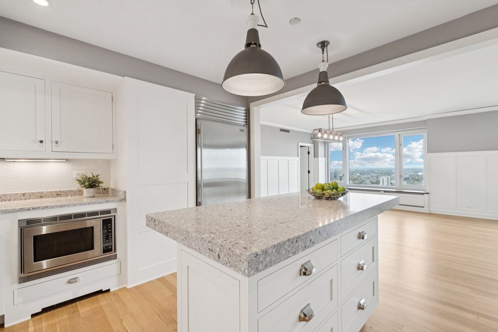 This beautifully reimagined two-bedroom home at the Four Seasons Residences offers a sophisticated lifestyle with a completely redesigned floor plan and high-end finishes throughout. The expansive living and dining room features rich hardwood floors, two oversized picture windows framing the magnificent city skyline, and breathtaking sunset views. The open, classic white kitchen is a chef's dream with a large island for casual dining or entertaining, ample prep space, and deluxe appliances including a Sub-Zero refrigerator, Viking electric range with pot filler, and vented hood. The serene primary suite boasts hardwood floors, a wall of windows, a custom-organized walk-in closet, and an adjacent flexible office space-ideal for a private study or additional dressing room. The spa-inspired primary bath includes a walk-in stone shower with custom glass doors, double vanity, and linen storage. A spacious second bedroom suite offers two closets and room for a complete furniture arrangement, while an additional bonus room off the living area can serve as a den, office, or third bedroom. Additional highlights include a side-by-side laundry room, abundant storage, and a neutral move-in-ready palette. Residents enjoy the boutique, professionally managed Four Seasons Residences with access to world-class a la carte hotel amenities including the pool, exercise room, and spa. Valet and Self Park Options are available.