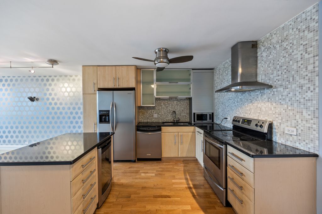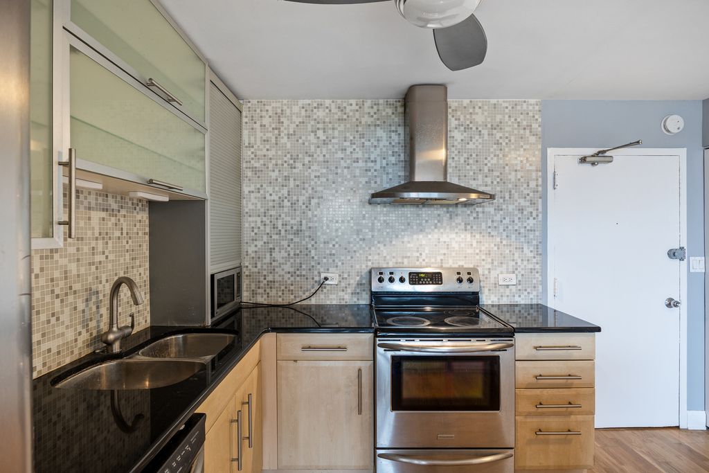 Enjoy skyline views from this south facing one bedroom with balcony in East Lakeview. Modern open living/kitchen/dining layout with maple hardwood flooring thru-out. Kitchen features maple cabinets, granite counter, stainless steel appliances and wine fridge. Modern glass tiled bath. Building features include outdoor pool/deck area, community lounge, on site laundry & garage rental parking. Located just steps from the lake, park and dining/entertainment on nearby Broadway.