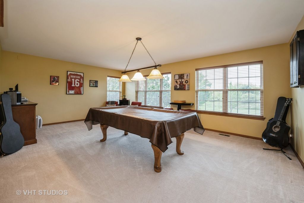 A rare find, this stunning golf course home is perfection. The spacious 1st floor has it all... welcoming dining room, inviting living room, and spacious cooks kitchen w/ 42" cherry cabinetry with lots of prep space and storage, truly a cooks dream! The family room has a spectacular stone fireplace and overlooks the 12th tee. This rare floor model features a perfect 1st floor office/den as well! The 2nd floor features 4 bedrooms, laundry room, and 2nd floor rec/flex space with pool table(included), all generous in size. Gorgeous master bedroom suite has an amazing extra large closet with beautiful cabinetry. A secondary bedroom also has a walk-in closet. Expansive basement with much done already, the full bath is already 3/4 completed. Enjoy stunning views from the slate patio. (FYI, in 23 years, the home has never been hit by a golf ball) Open floor plan, hardwood flooring, golf course location and a 3 car garage make this house a dream come true! The roof and siding were replaced in 2023. Metra is so close.