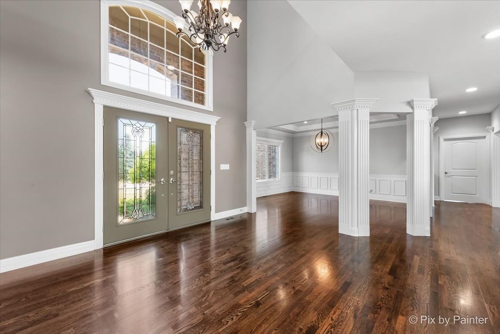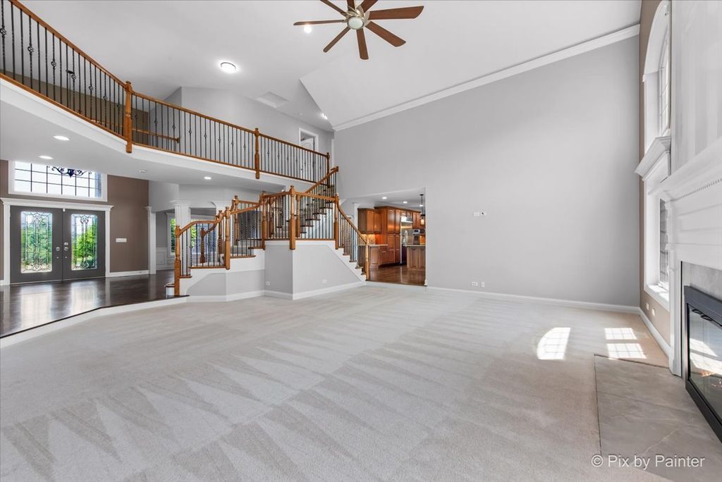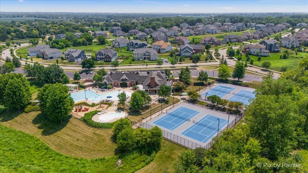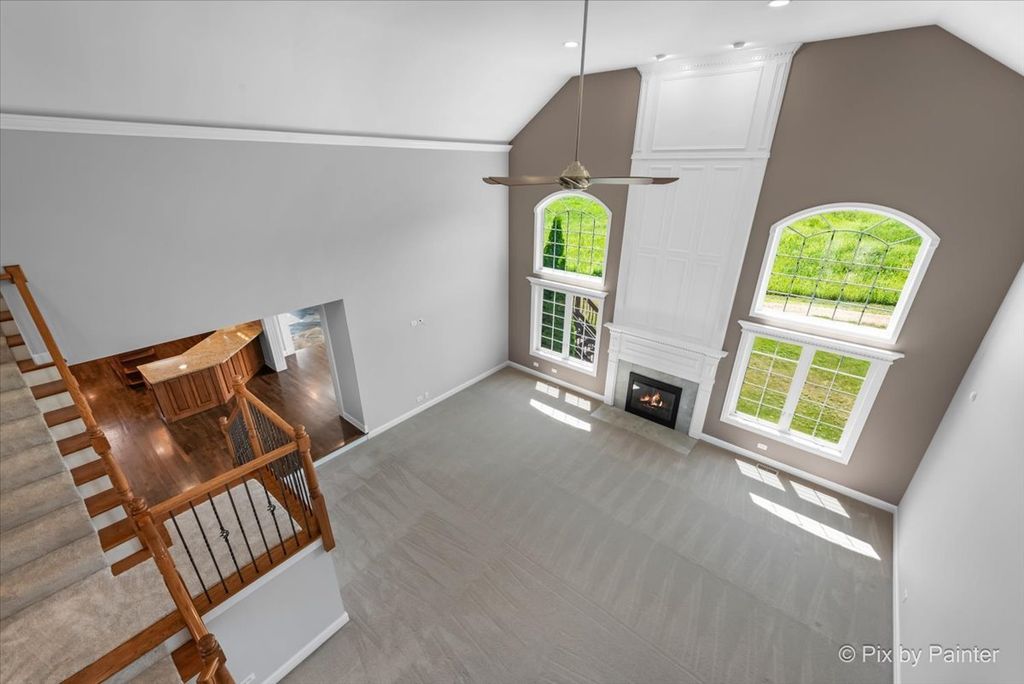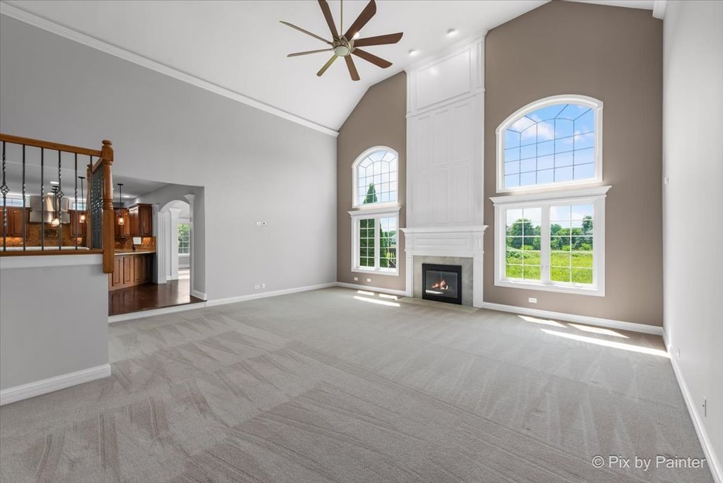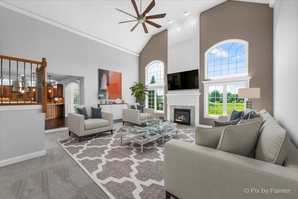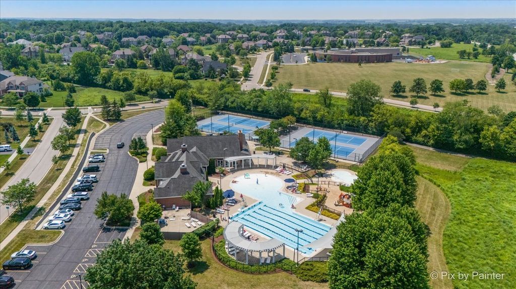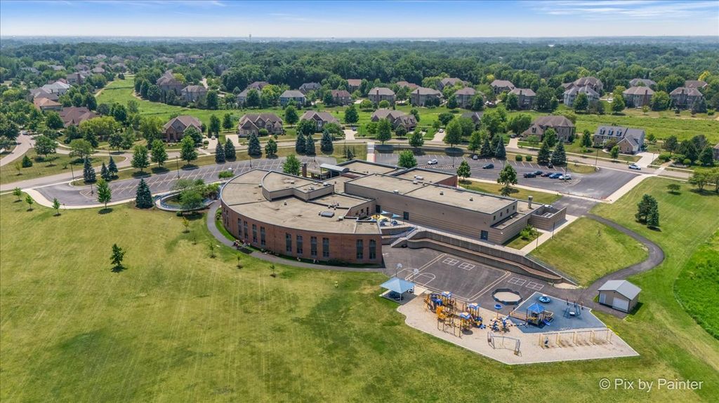 First Impressions Matter-and This Home Delivers. Step into a grand two-story foyer that sets the tone for the expansive interior. It opens to a soaring two-story family room centered around an intricately detailed fireplace surround, creating an unforgettable focal point. The formal dining room features elegant wainscoting, a coffered ceiling with extensive trim work, and a modern light fixture-perfect for hosting fun parties. A spacious living room with a charming bay window offers a versatile additional space. An oversized first-floor office / den / bedroom includes a large walk-in closet and is conveniently located next to a full bath, making it ideal for guests or working from home. A dual "T" staircase-with iron spindles-leads you either upstairs from the kitchen or foyer, enhancing flow and functionality. A Kitchen Designed to Be the Heart of the Home. The kitchen anchors the main level with a bright eating area that overlooks the open backyard. Explore your inner 3 star cooking with upper end appliances. Double oven, SS Frig. and 2 beverage refrigerators makes for easy cooking. Just off the kitchen, the sunroom (or Florida room) features skylights and a vaulted ceiling, bringing in natural light and offering a perfect retreat. You'll also love the oversized laundry/mudroom-over 20 feet long-with abundant storage and a side entry door. Upstairs Comforts and Conveniences await. The primary suite is generously OVER-sized, with a tray ceiling, cozy fireplace, and a spacious sitting area. The walk-in closet is impressive-not only in size but in function, with a second laundry unit for ultimate convenience. The en-suite bath has been tastefully updated with a double vanity and oversized walk-in shower. Three additional bedrooms complete the second level-one with a private bath and the other two sharing a Jack-and-Jill bath. The Possibilities for enjoyment continue in the Basement. The English-style basement with extra tall ceiling, is full of potential. Offering natural light and a rough-in for a future bathroom, making it easy to finish to your taste. Outdoor Living and Ideal Location await. Step out onto the expansive deck that overlooks open space-offering privacy and tranquility. The home is located directly across the street from the local grade school, this home truly has it all: space, function, beauty, and location. Easy to show! Updates in the home: The hot water heaters were done in 2020 and 2022. The home has been newly updated to included, repainting of the home, extensive update to the baths upstairs, tops, new plumbing and lights and cab and tiles as well as newer light fixtures in home. Hardwood floor was refinished. ** Fences are allowed we're told by the HOA