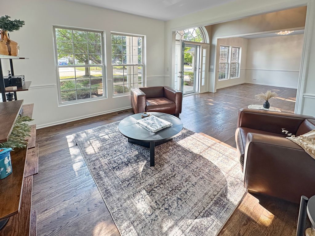 BEAUTIFULLY UPDATED 5 bed, 3.5 bath, 3500+ sq. ft. home in the highly sought-after Augusta Village neighborhood! Step inside through the grand 2-STORY CATHEDRAL FOYER and you'll immediately feel the warmth and elegance this home exudes. Gleaming HARDWOOD FLOORS span the main level, which features an OPEN FLOORPLAN ideal for entertaining. The spacious kitchen includes STAINLESS STEEL APPLIANCES, an island, WALK-IN PANTRY, and flows seamlessly into the oversized family room with cozy gas FIREPLACE. Enjoy panoramic views of the professionally landscaped yard from the sunlit sitting room or from the first-floor OFFICE/DEN. Retreat to the LUXURIOUS MASTER SUITE, large enough for a personal sitting area, complete with a soaking tub, separate shower, DOUBLE VANITIES, and WALK-IN CLOSET. The FULLY FINISHED BASEMENT with 9-FOOT CEILINGS includes an additional bedroom and full bath-perfect for guests, in-laws, or a private retreat. A NEST THERMOSTAT adds energy-efficient comfort. Step outside to the LARGE, FULLY FENCED BACK YARD with a stunning PAVER PATIO, ideal for summer grilling, entertaining, or simply relaxing under the mature trees. Additional recent updates include a new roof and water heater in 2022. All appliances stay. Tucked away on a quiet street yet minutes from Century Park, Lilac Park, Champions Park, and scenic nature preserves, this home also offers easy access to I-355/I-55 and great shopping.