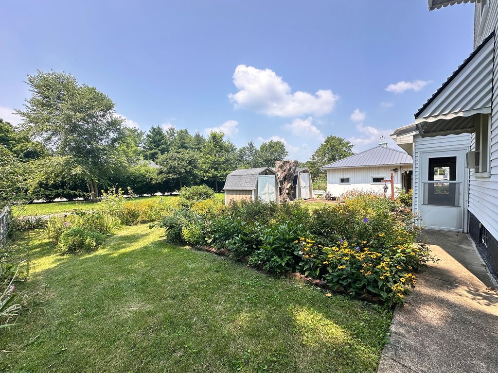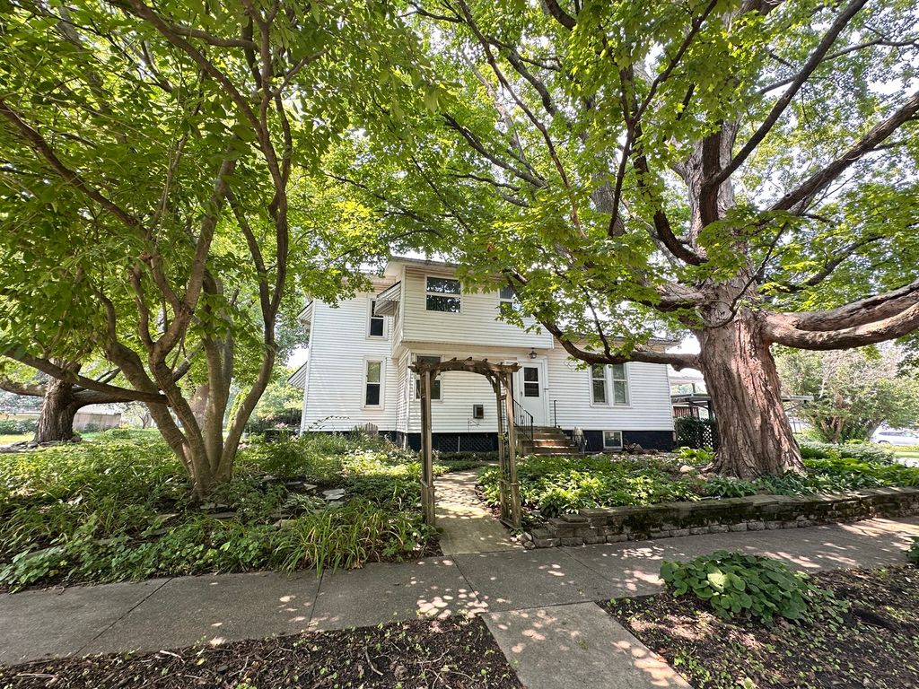 This cherished home has been lovingly maintained by the same family for over 50 years! Four spacious bedrooms-including one conveniently located on the main floor-this home is full of timeless charm, highlighted by hardwood floors, antique sconces and an original beautiful open staircase. Enjoy the generously sized kitchen and separate dining room. The vaulted-ceiling sunroom offers a stunning view of the beautifully landscaped yard, creating a peaceful space to relax in. The basement is functional and versatile, complete with a full bath. Outdoors, you'll find a covered deck, his and hers garden sheds, a workshop adjacent to the two-car garage, a perfect garden spot with perennials galore. Sitting proudly on a pristine, nearly half-acre corner lot, this stately home boasts a massive yard with mature landscaping and steel roofs on both the home and garage. Farmer City is an easy 30 min drive to Champaign or Bloomington. The perfect property in the perfect location!!
