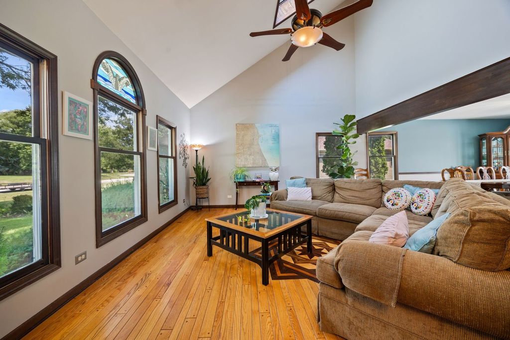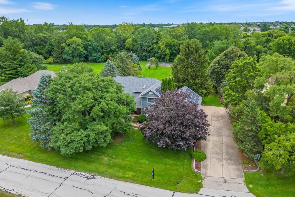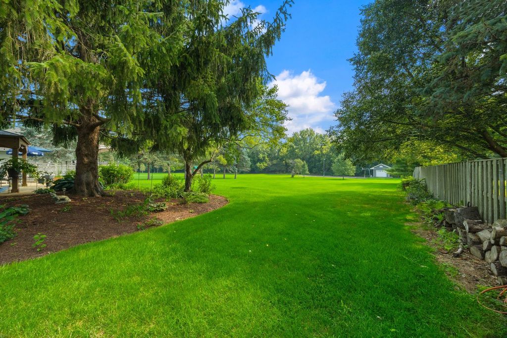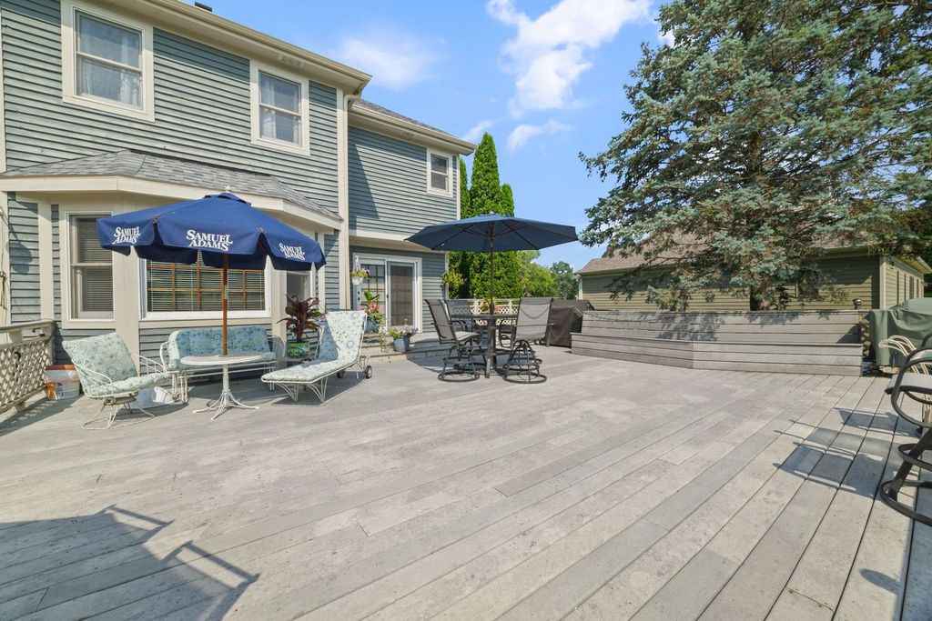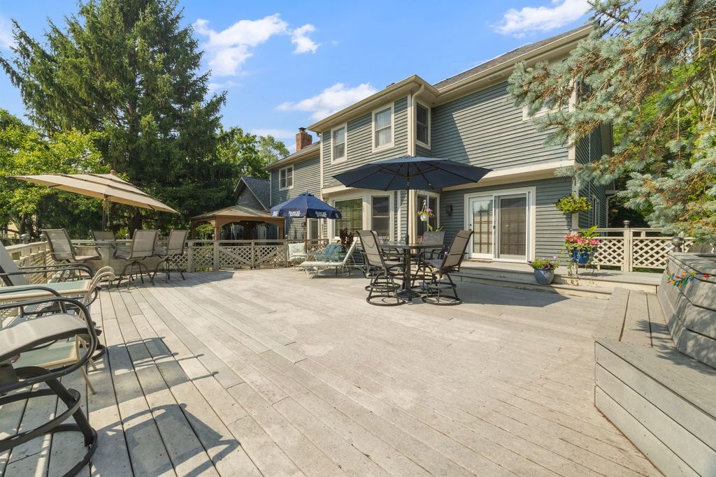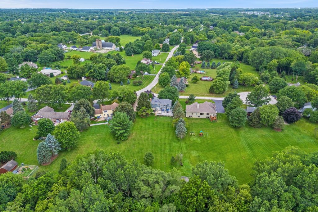Set on over an acre in the highly sought-after Farmstead subdivision, this exceptional, well-built home blends timeless charm with modern updates. Featuring a spacious 3-car garage and beautifully manicured landscaping, the curb appeal is unmatched. Step inside to find gleaming hardwood floors with decorative inlays, vaulted ceilings with exposed beams, and elegant touches like chair rail, crown molding, and recessed lighting throughout. The heart of the home includes a gourmet kitchen with stainless steel appliances and is perfect for entertaining. Relax in the inviting living room with a cozy fireplace or serve drinks from the built-in wet bar. The expansive master suite offers an en suite with dual vanity, separate tub and shower, and serene views of the grounds. The finished basement is designed for relaxation and fun, boasting a custom bar and a spa room with a jacuzzi. Step outside to enjoy a large composite deck with built-in seating, a spacious patio with a newer gazebo (2020)-ideal for gatherings or peaceful evenings under the stars. Major upgrades include solar panels (2023), a new roof and gutters (2023), and a new AC (2020) for energy efficiency and peace of mind. Located in a quiet neighborhood close to shopping, dining, and entertainment, and served by the highly regarded St Charles District 303 schools, this home is the perfect balance of comfort, style, and convenience. This home is perfect for multi-generation living.