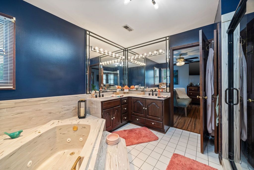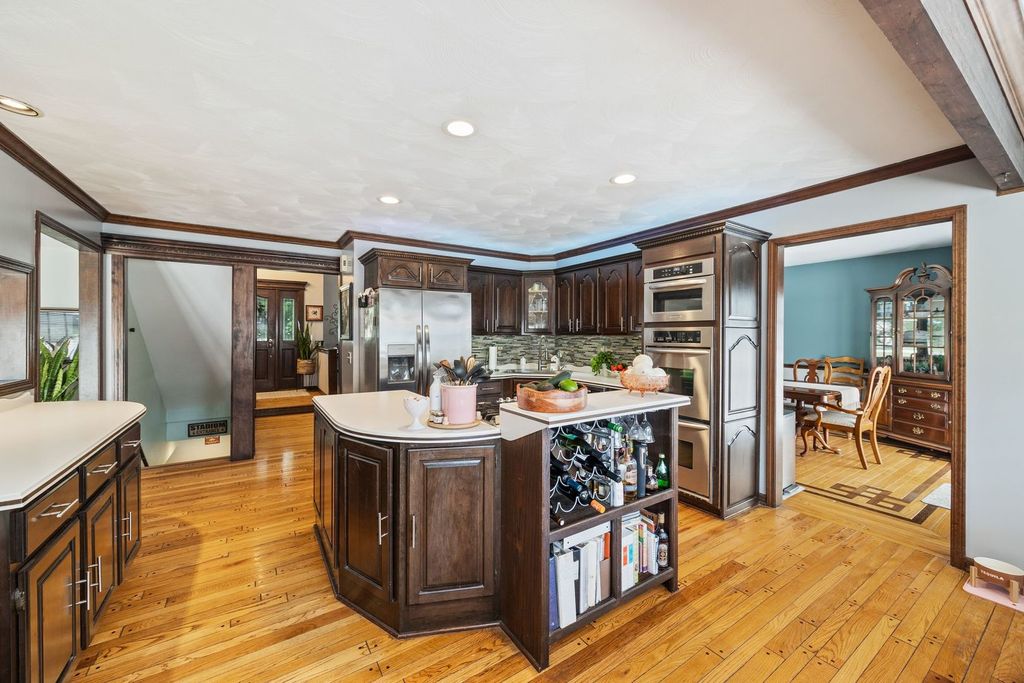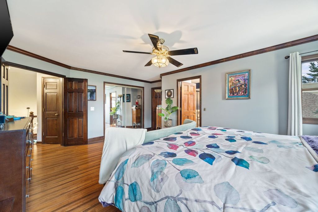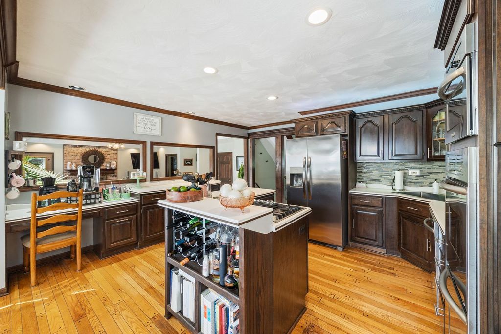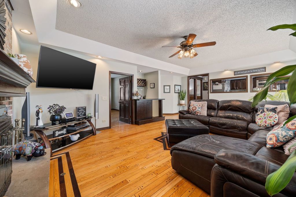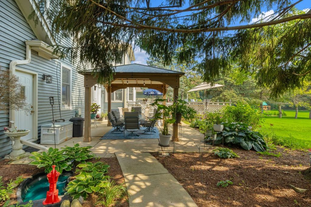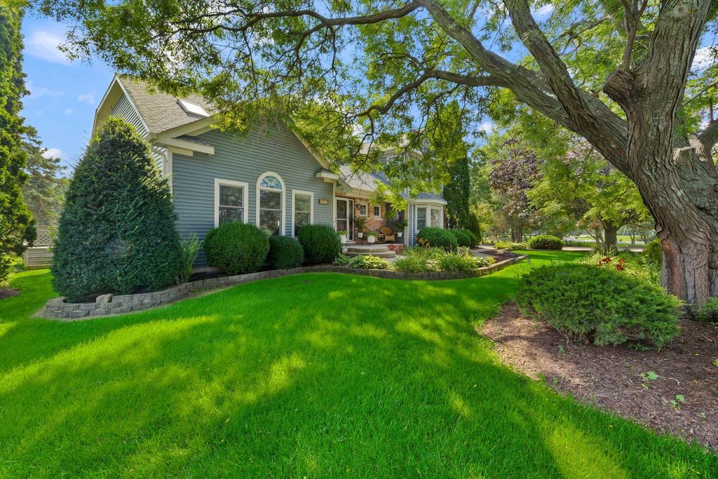 Set on over an acre in the highly sought-after Farmstead subdivision, this exceptional, well-built home blends timeless charm with modern updates. Featuring a spacious 3-car garage and beautifully manicured landscaping, the curb appeal is unmatched. Step inside to find gleaming hardwood floors with decorative inlays, vaulted ceilings with exposed beams, and elegant touches like chair rail, crown molding, and recessed lighting throughout. The heart of the home includes a gourmet kitchen with stainless steel appliances and is perfect for entertaining. Relax in the inviting living room with a cozy fireplace or serve drinks from the built-in wet bar. The expansive master suite offers an en suite with dual vanity, separate tub and shower, and serene views of the grounds. The finished basement is designed for relaxation and fun, boasting a custom bar and a spa room with a jacuzzi. Step outside to enjoy a large composite deck with built-in seating, a spacious patio with a newer gazebo (2020)-ideal for gatherings or peaceful evenings under the stars. Major upgrades include solar panels (2023), a new roof and gutters (2023), and a new AC (2020) for energy efficiency and peace of mind. Located in a quiet neighborhood close to shopping, dining, and entertainment, and served by the highly regarded St Charles District 303 schools, this home is the perfect balance of comfort, style, and convenience. This home is perfect for multi-generation living.