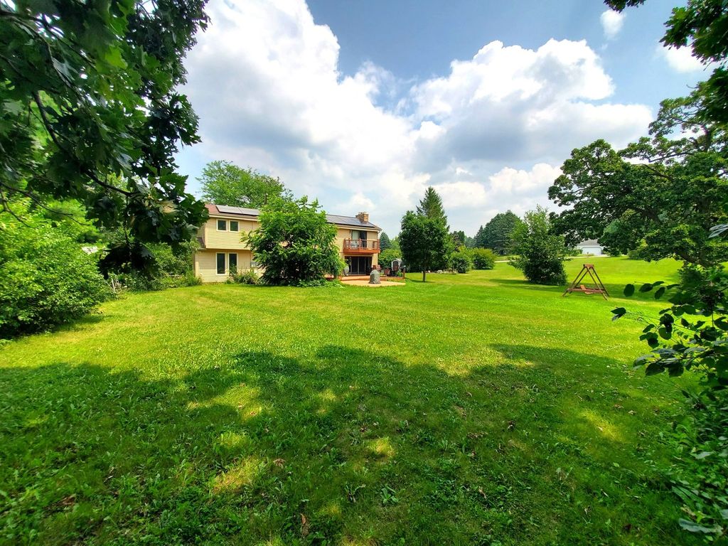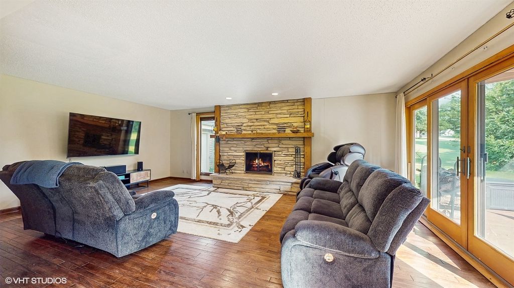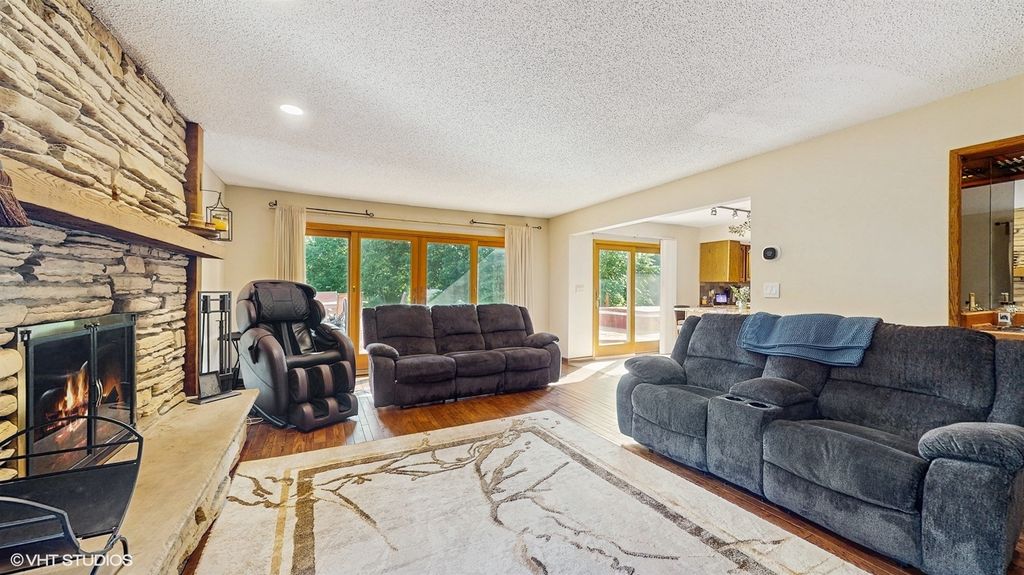Discover your new laid-back lifestyle in Andover Acres! This custom-built home is perched on an elevated 1.8-acre corner lot with commanding views of the neighborhood and over 4100 sq/ft of flexible living space. Ideally located with easy access to Huntley, Woodstock, and Crystal Lake this property offers both privacy and proximity. Originally intended as a long-term residence, the current owner made significant energy-efficient upgrades before life called for a new chapter. Enjoy exceptionally low electric bills thanks to owned solar panels, a 50-amp EV charging station, 400 amp service, and an array of smart home features designed for comfort and efficiency. Inside, the layout provides long-term flexibility, including a walkout lower-level in-law suite complete with a second kitchen, living room, full bath, two bedrooms, private patio, and extra storage. The main level showcases a well-appointed granite and stainless kitchen, a separate dining room, and a spacious family room with vaulted ceilings-perfect for that massive Christmas tree you've always wanted. A gorgeous stone hearth wood-burning fireplace and a built-in wet bar create a cozy and stylish entertaining space also connected to the large deck and patio area. Upstairs, you'll find a versatile loft ideal for an office, craft space, or gaming area. The primary suite is a true retreat, featuring its own wood-burning fireplace and a private coffee balcony. Need space for your toys or tools? The generous driveway and side parking area provides ample parking for RVs, boats, trailers, campers, and work vehicles. The huge savings from owning solar panels will go a long way towards customizing your own updates. Come see the rest for yourself!