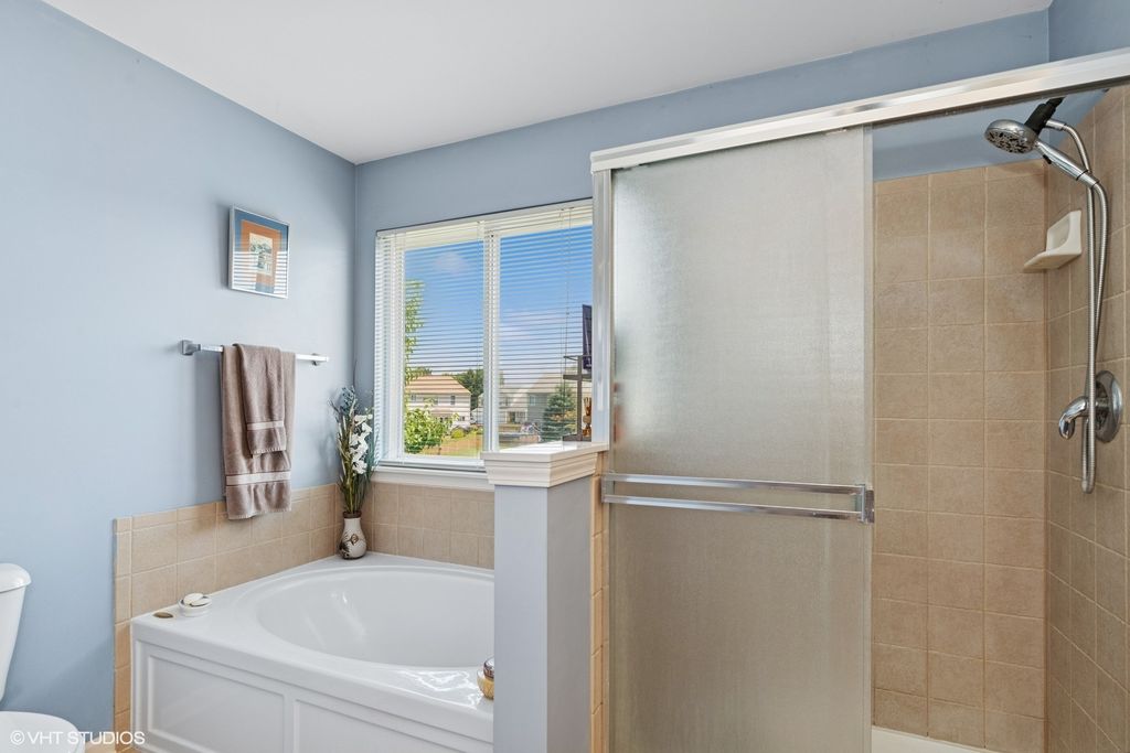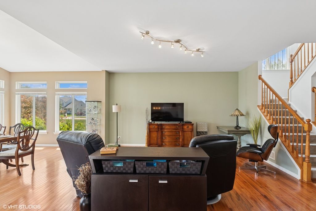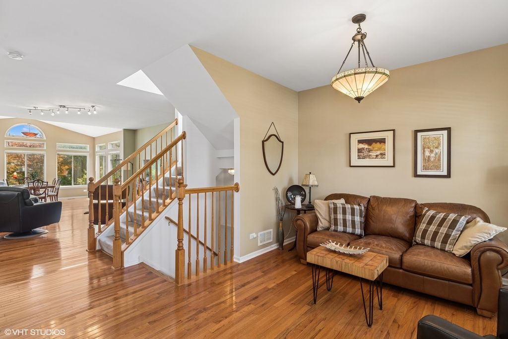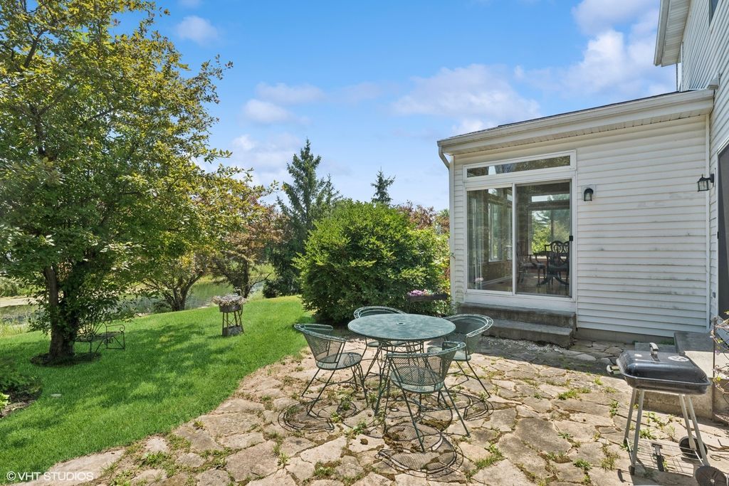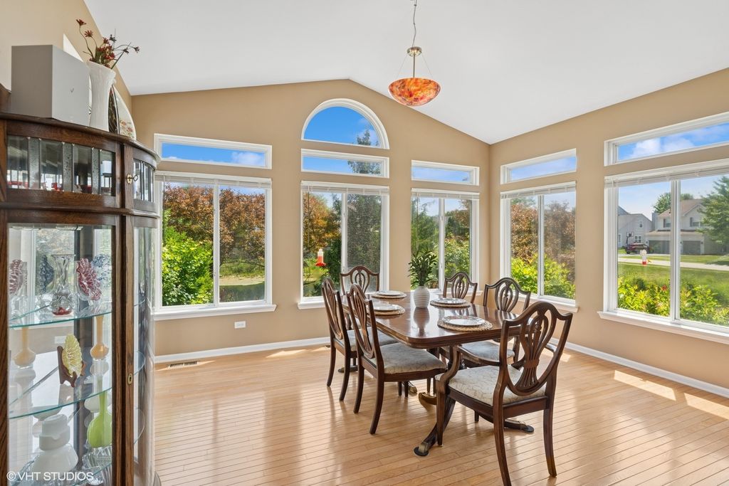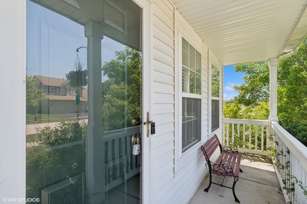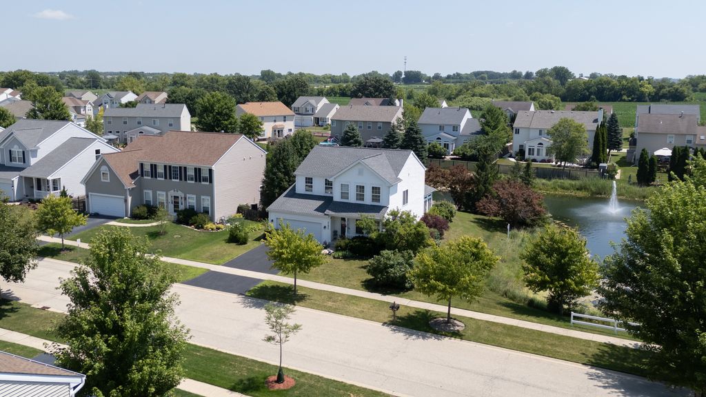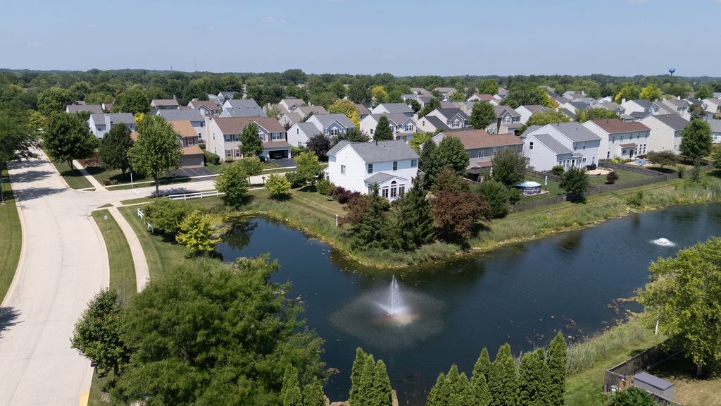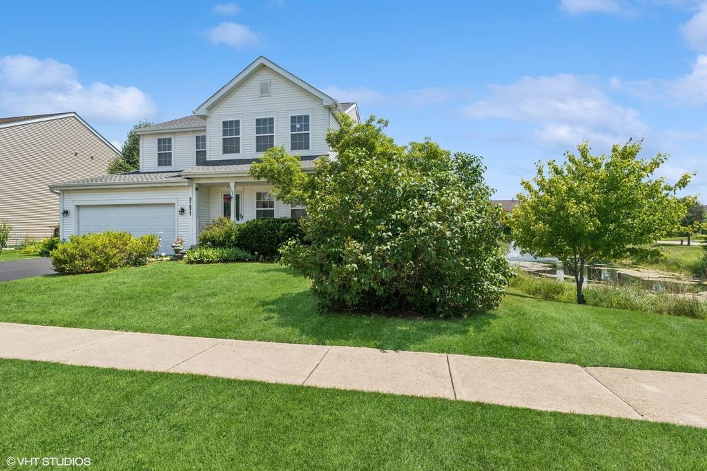 Welcome to this stunning 4-bedroom, 2.5-bath Yorktown model located on a premium corner lot in The Pines of Lakemoor. Enjoy beautiful pond views from multiple angles of the home and an inviting front porch, perfect for relaxing. The main level offers a formal living room at the front of the home and a spacious open-concept layout connecting the family room, dining area, and kitchen-ideal for entertaining. The kitchen features updated white cabinetry, granite countertops, a walk-in pantry, and ample prep space. A sliding glass door off the dining area leads to a peaceful backyard with patio and serene pond and nature views. There is a half bath that completes the main level. The first-floor laundry room is conveniently located just off the garage entrance. The attached 2-car garage is extended for additional storage needs. One unique feature of this home is the open staircase to the basement-custom to this model-adding to the home's bright and open feel. Upstairs, the oversized primary suite offers a relaxing retreat, a private en-suite bathroom with a soaker tub, separate walk-in shower, and dual vanity. Three additional generously sized bedrooms and a full hall bath complete the second level. The finished basement offers flexible space for a potential 5th bedroom, rec room, office, or home gym. Plenty of storage is available in the large unfinished section, with shelving racks and a deep freezer included. Major updates include a new roof (2019) and new A/C unit (2023). Enjoy neighborhood walking paths and two nearby parks-all within the highly rated Wauconda School District. Conveniently located near Woodman's, shopping, dining, and more. This well-maintained home is a must-see!