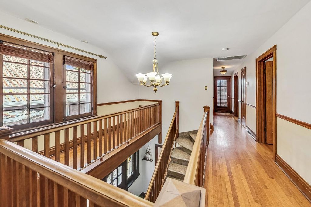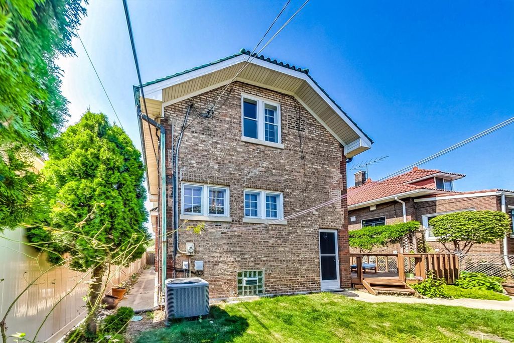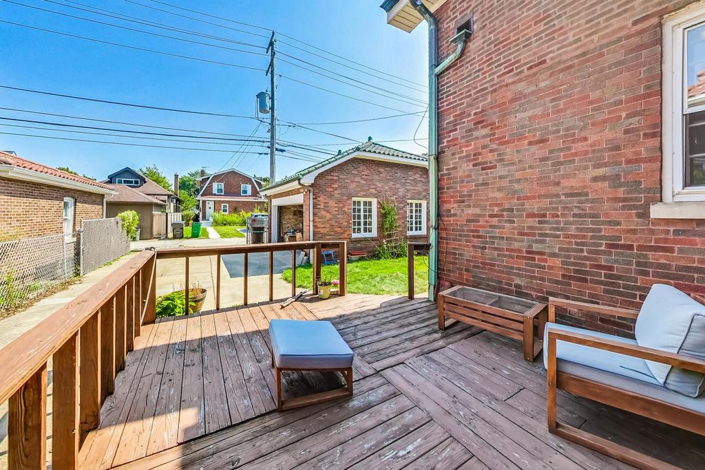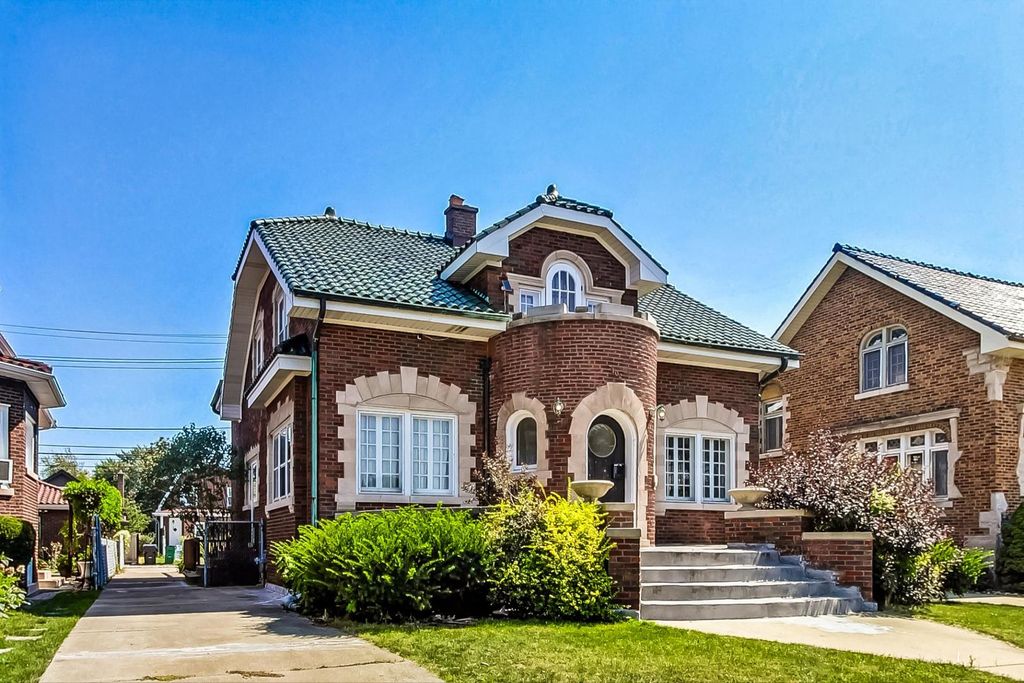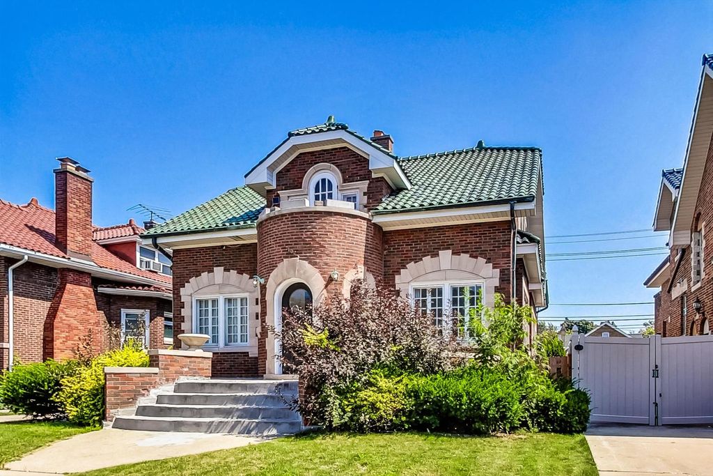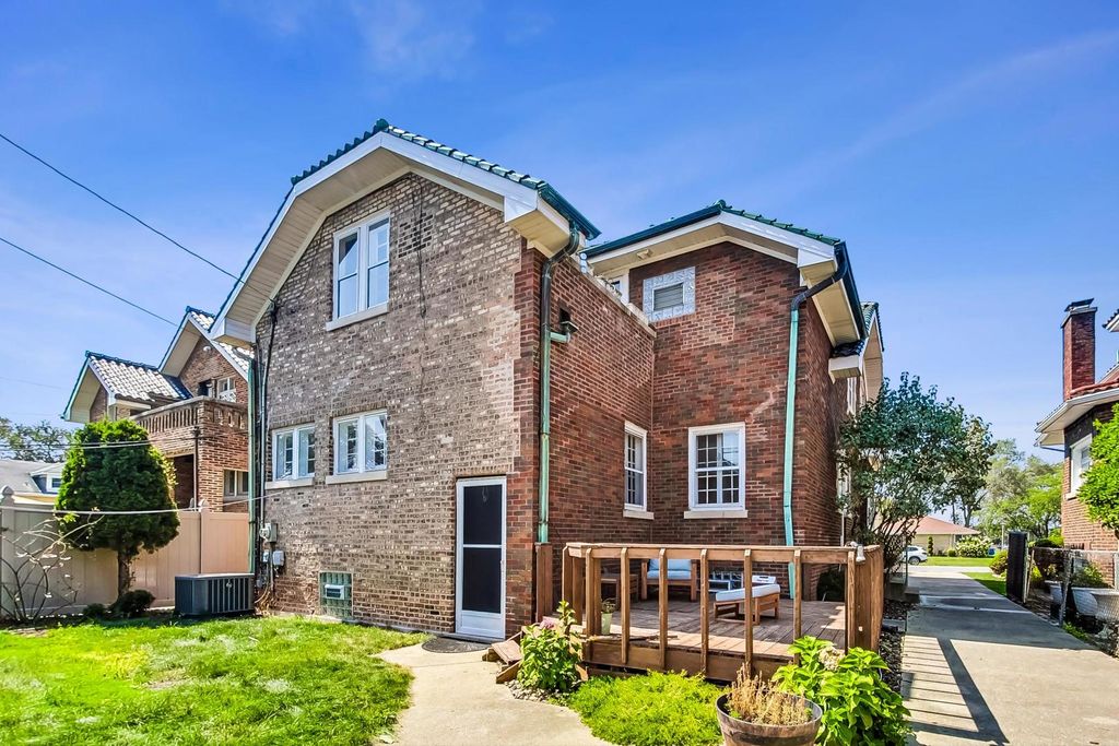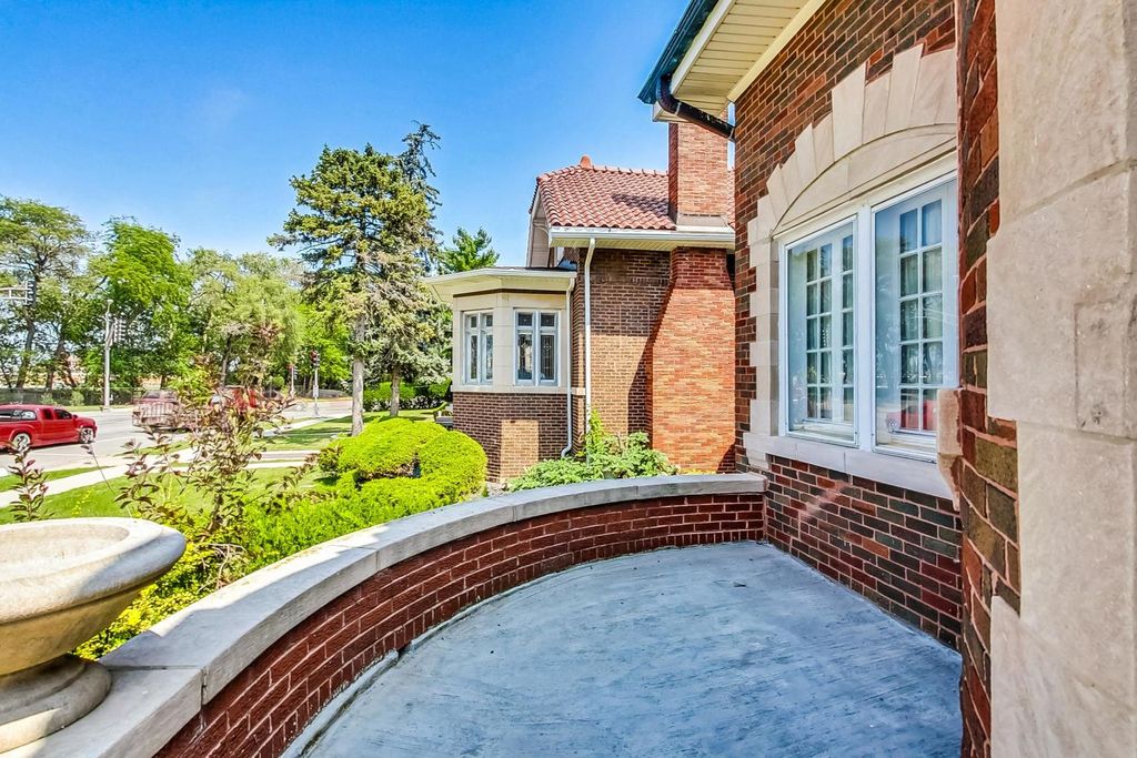Stunning European Custom-Built Home in Historic Depot District. Step into a world of vintage charm and European elegance with this custom-built home, beautifully situated in the heart of Berwyn's Historic Depot District. This residence, reminiscent of a grand European mansion, showcases a brick and stone exterior with a symmetrical design, green clay Spanish tile roofs, and all-copper gutters, flashing, and trim. Inside, discover coved ceilings, large casement windows, and impeccably maintained textured plaster walls. The spacious living room features a stone fireplace, while the formal dining room boasts vintage corner cabinets. The kitchen, flooded with natural light, is equipped with granite countertops, stainless steel appliances, and a separate pantry. Upstairs, find three bedrooms, a den, two balconies, and a full bathroom, all accented with ornate etched plaster wall trim. The finished basement offers a wet bar, custom wine cellar, full bathroom, and ample storage. Enjoy outdoor living with a deck, manicured backyard, oversized 2-car garage, and gated carport. Conveniently located near Metra, shopping, dining, and more. This home has been featured in Berwyn's Historic Bungalow Tour-an absolute must-see!