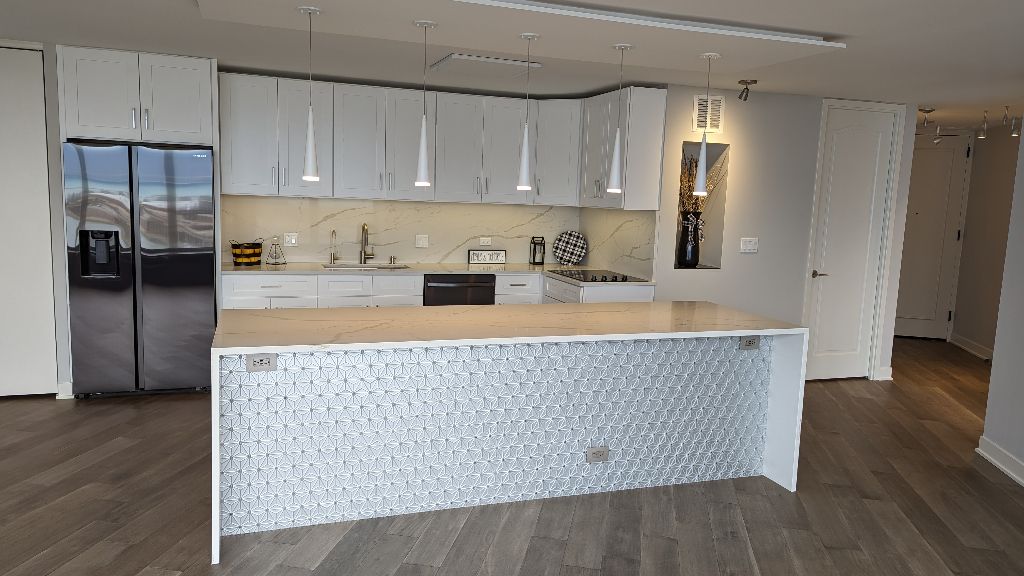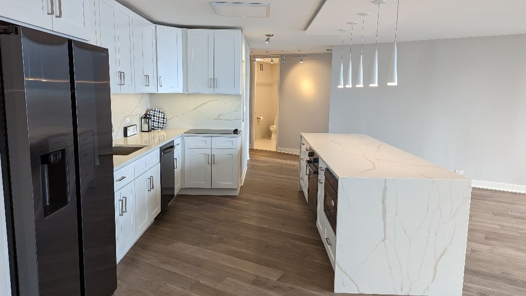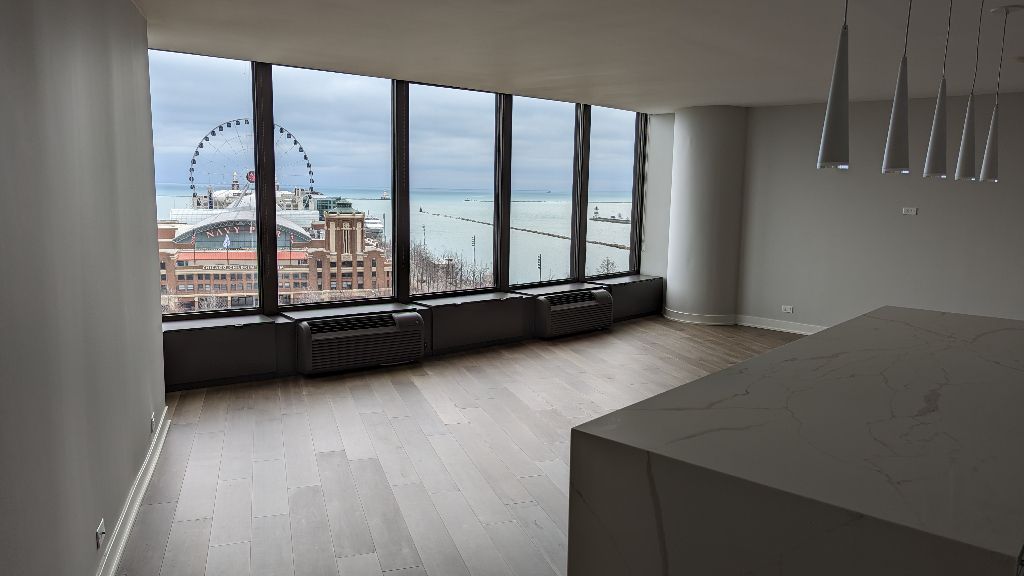 Fully remodeled spacious one bedroom, one bath condo in the Iconic Lake Point Tower with a panoramic east facing view of Lake Michigan, Navy Pier and daily picturesque sunrises from the comfort of your home. The open concept features elegant wood look LVT flooring, quartz countertops with water fall features on the island cabinets, full height backsplash, Black stainless appliances and designer pendant lighting. The bathroom features a large vanity with quartz countertop, undermount sink, and a glass enclosure for the spacious shower. Closets, closets, closets. There is a walk-in closet in the bedroom, a walk-in laundry room with built-n shelving and a 10-foot closet in the living space. Lake Point Tower offers resort style amenities including an award winning 2.5-acre park, lagoon, in ground pool, waterfall, BBC area and playground. Indoor features include Community room conference room, office center, full fitness center, Steam/Saunas, indoor pool and hot tubs. This rare building is with-in walking distance to the Lakefront trail, CTA center, numerus restaurants, a movie theater, Northwestern Hospital too many others to list. This is a must see property,