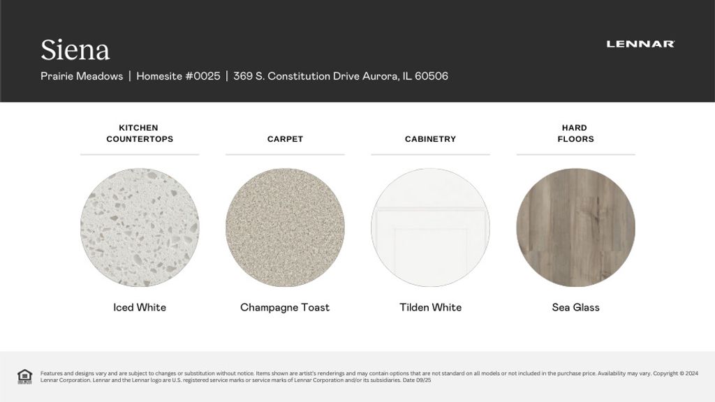 SPECIAL FINANCING OFFERS AVAILABLE!! READY FOR NOVEMBER DELIVERY!!!! Homesite# 0025 Step into the Siena, a thoughtfully designed single-story home that blends comfort, efficiency, and modern style. This well-balanced layout features three bedrooms and two bathrooms within an open-concept design that creates a seamless flow between the family room, dining area, and kitchen-perfect for both everyday living and casual entertaining. At the heart of the home, the kitchen shines with a spacious island, Quartz countertops, stainless steel appliances, and generous cabinetry, offering both function and elegance. The private owner's suite is a peaceful retreat, complete with an expansive walk-in closet and a spa-like en-suite bathroom designed for relaxation. Two additional bedrooms are positioned near a shared hallway bath, offering flexibility for guests, family members, or a home office. The Siena also includes 9-foot ceilings, luxury vinyl plank flooring, plush carpeting, Deluxe shower upgrades, smart-height water-saving commodes, and many other premium features tailored to enrich your lifestyle. Delivering modern living in a streamlined, practical layout, the Siena is a versatile and stylish choice for a wide range of homeowners. Exterior will be Greystone color vinyl siding with Weathered White color brick. (pic for reference ONLY) *Photos are not this actual home* Experience the perfect blend of comfort, convenience, and outdoor living at Prairie Meadows, a charming new community offering low-maintenance ranch-style homes in the vibrant suburbs of Aurora, Illinois. Thoughtfully designed for effortless living and a love of nature, Prairie Meadows delivers a lifestyle centered on relaxation, recreation, and meaningful community connection. This thoughtfully planned neighborhood will feature a scenic park and playground, modern pickleball courts, a welcoming picnic shelter, fire pit, and comfortable seating areas, along with approximately 15 acres of open space to enjoy fresh air and the natural surroundings. Living at Prairie Meadows means you're just minutes from some of Aurora's most popular attractions. Downtown's RiverEdge Park offers outdoor festivals, an amphitheater, and scenic trails along the Fox River, making it a go-to destination for entertainment and relaxation. For shopping enthusiasts, the Chicago Premium Outlets is a premier open-air retail center featuring more than 170 designer brands, seasonal events, and unbeatable deals. Golfers will love the nearby Orchard Valley Golf Course, a beautifully maintained 18-hole championship course perfect for both casual and competitive play, complete with a welcoming clubhouse for dining and socializing. Whether you're enjoying a quiet walk through green space or spending the day exploring downtown Aurora, Prairie Meadows is where peaceful suburban living meets a vibrant, active lifestyle.