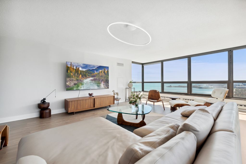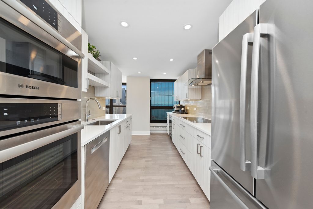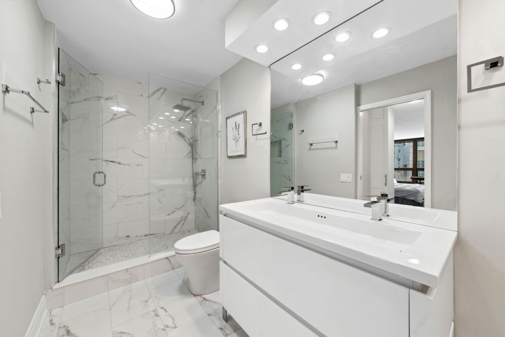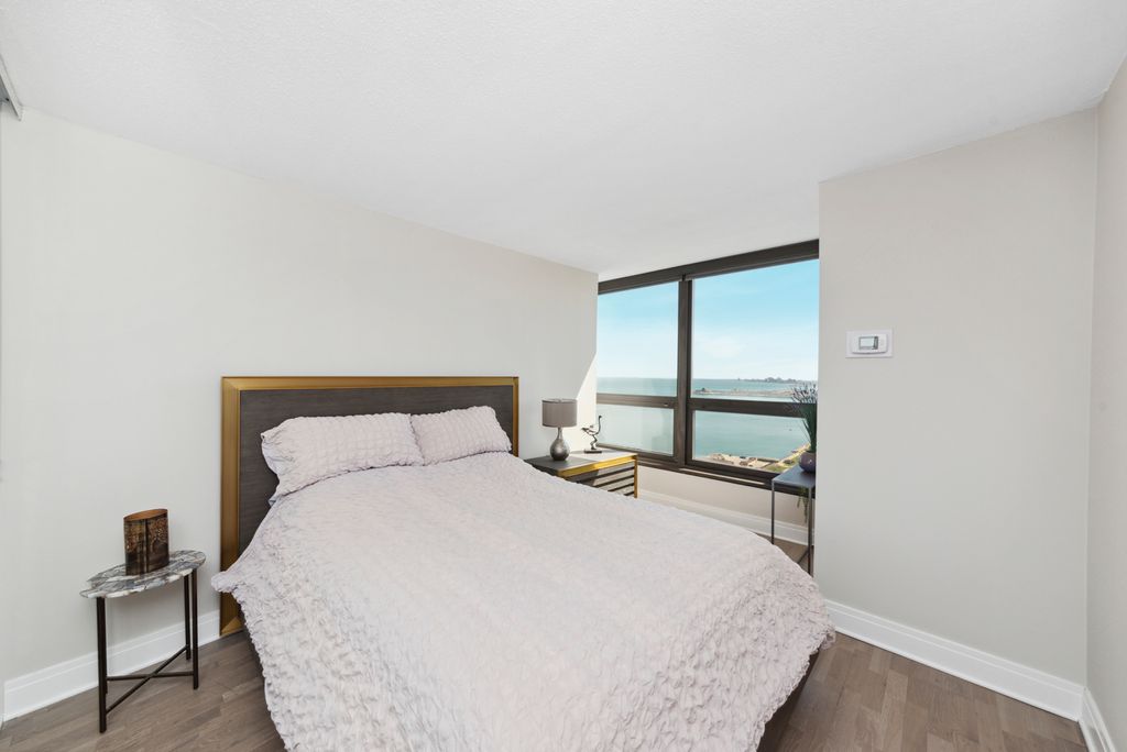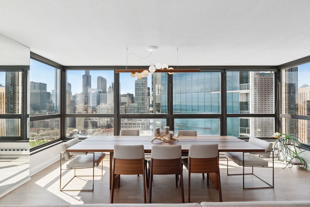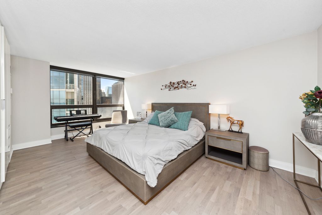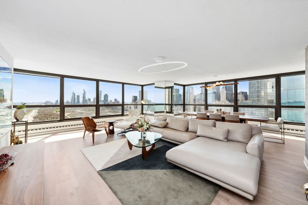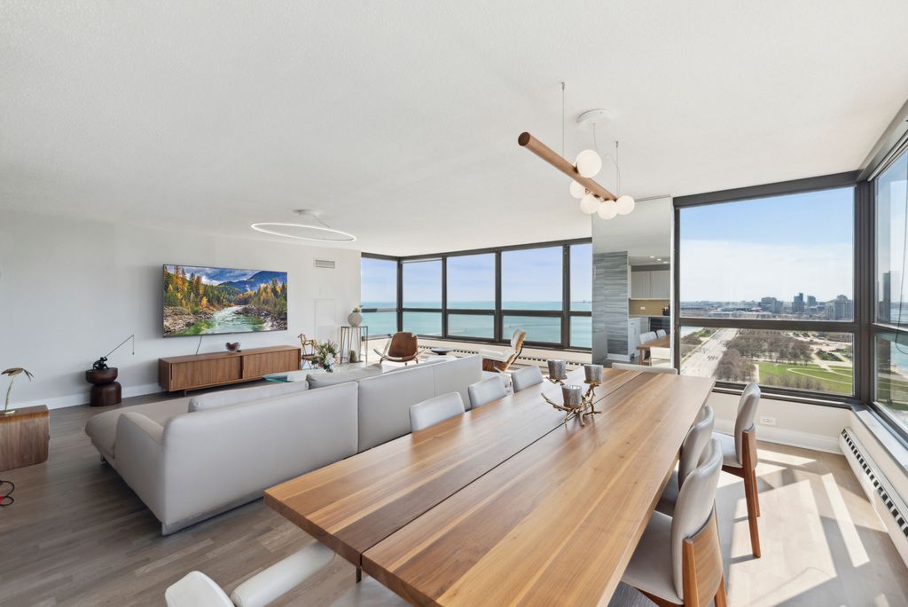 Experience forever south, east and west views of Lake Michigan, Park and City architectural views from this preferred southwest corner residence. A complete and masterful renovation, this home features hardwood floors in a gray/brown finish, roller shades throughout, kitchen with windows to views, stainless steel all Bosch appliances including double oven, microwave, French Door refrigerator, cooktop and culinary hood. Under mount sink and disposal. White quartz counters. Light contemporary cabinetry and under cabinet lighting. Full height large format glass subway tile backsplash, open shelving, soft close drawers and wine fridge. Master suite offers built in armoires, his and hers walk in closets with built ins. Master bath with stand alone soaking tub, shower with frameless glass, rain shower head and handheld, dual vanity and white and gray veined quartz tiling. Second bathroom dressed in marble, floating vanity and body sprays. Tandem parking available for 45k.