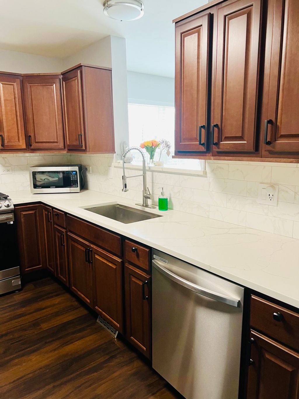 Welcome in to this Beautifully remodeled 2 BR, 2.1 Bath Townhome! Step into this stunning 2 Story end unit that blends modern updates with comfortable living. Hardwood flrs thru out, The open-concept main level boasts a beautifully updated kit, wood cab., Quartz countertop, porcelain backsplash w/accent lighting, SS appls.,Lg. Pantry, enjoy coffee at your kit. table looking out to balcony and enjoy the pond view. Lg. DR, 3 sided Fireplace for a cozy L.R., half bath for guests, 2nd level features 2 generous size BRs, the primary suite offers w/i closet, spa inspired full porcelain tiled bath w/ step in shower, 2nd BR has ample closet space, hall bath porcelain tile w/tub, Darling Laundry room for total convenience. Lower level perfect for Office, Den or 3rd BR has closet. Access to 2 car garage, epoxy flooring. Newly sided exterior. Located in a well maintained community close to Shopping, Metra and dining. This home is move in ready waiting for you! Schedule your showing now.