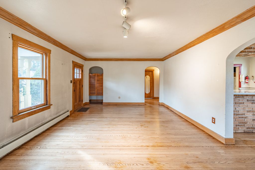 Located in a nice neighborhood of similar type homes, 402 Orange will suit your needs, either as a starter home or maybe a downsized home. Sitting proudly on the corner of Elm and Orange, this property has a side yard that is enclosed by a fence and hedge. On the first floor of the house you will find the original hardwood floors, plaster walls and trim. A nice-sized living room has a fireplace, and flows into the dining room, which has built in corner cabinets. Two bedrooms, a full bath and kitchen comprise the rest of the first floor. Upstairs there is a large bedroom with a full bath and bonus room, ideal for an office or den. The windows are insulated wood windows. Over 1000sq.ft. of space in the basement could be finished off or used for storage. A little TLC will bring this gem up to date in decor. Sellers realize there is work required so this is listed As Is.