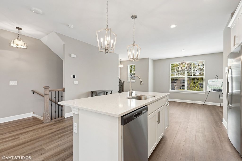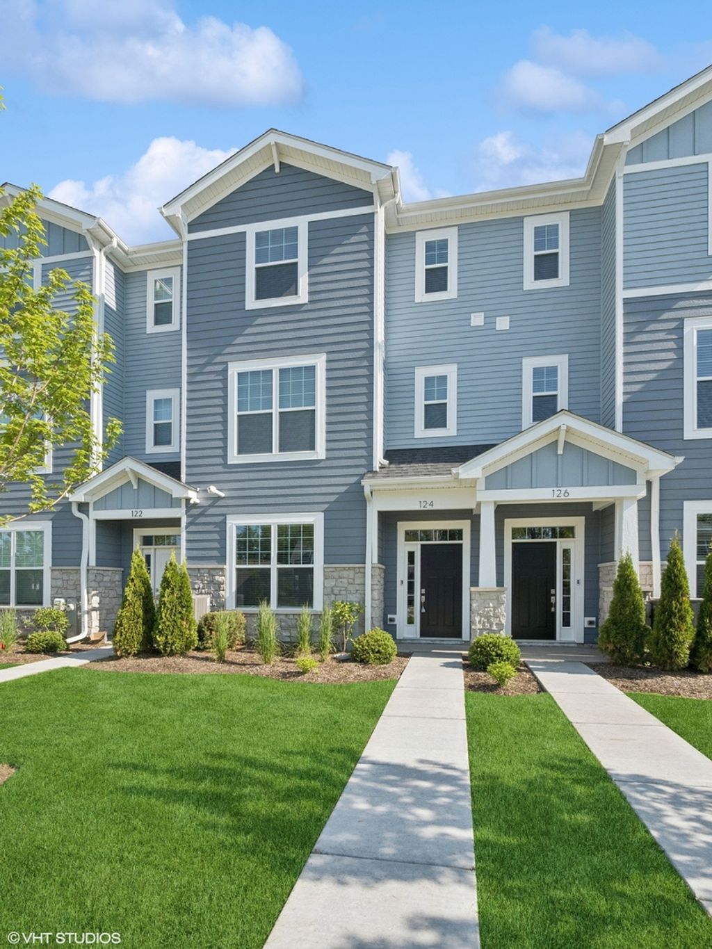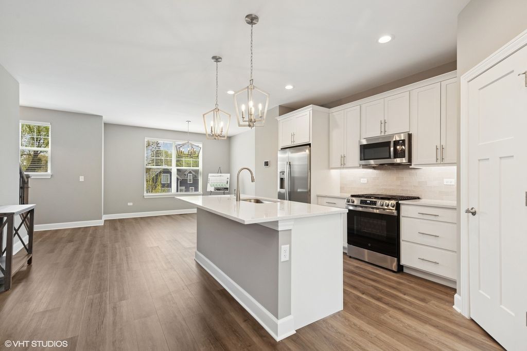 Available immediately! Welcome to Ridgefield Landing-a boutique community of just 10 townhomes where modern elegance meets exceptional walkability. Enjoy open-concept living with 9-foot ceilings, upgraded wide luxury vinyl plank flooring, designer tile selections, and high-performance James Hardie siding for lasting durability. At the heart of the home is a stunning kitchen featuring GE stainless steel appliances, quartz countertops, 42" cabinetry with soft-close doors and drawers and under-cabinet molding, a sleek tile backsplash, and an expansive island with seating. The dining room is located just off the kitchen and offers the perfect space for casual meals or formal gatherings. The family room sits on the opposite side and includes direct access to your private balcony-ideal for relaxing or entertaining-with a stylish built-in dry bar adding the perfect finishing touch. Upstairs, the spacious primary suite includes a walk-in closet and an en-suite bath with quartz-topped dual vanity and tiled walk-in shower. A second bedroom, full bath, and laundry area (GE washer and dryer included) complete the upper level. The entry-level flex den makes a great home office, gym, or creative space. Additional features include a 2-car attached garage, smart home technology package (central control panel, Wi-Fi boosters, smart thermostat), and energy-efficient construction with a HERS score rating. Brand new Samsung 65 Inch TV included! Located just two blocks from downtown Cary and the Metra, you're steps from local favorites like Barstool-rated Uncle Jerry's Pizza, the famous Tracks Bar & Grill, Cucina Rustica, the Sunday Farmer's Market, and Cary's beloved Wednesday Cruise Nights. These homes are complete and in high demand-don't miss your chance to own a brand-new luxury townhome in Ridgefield Landing, where style meets small-town living.