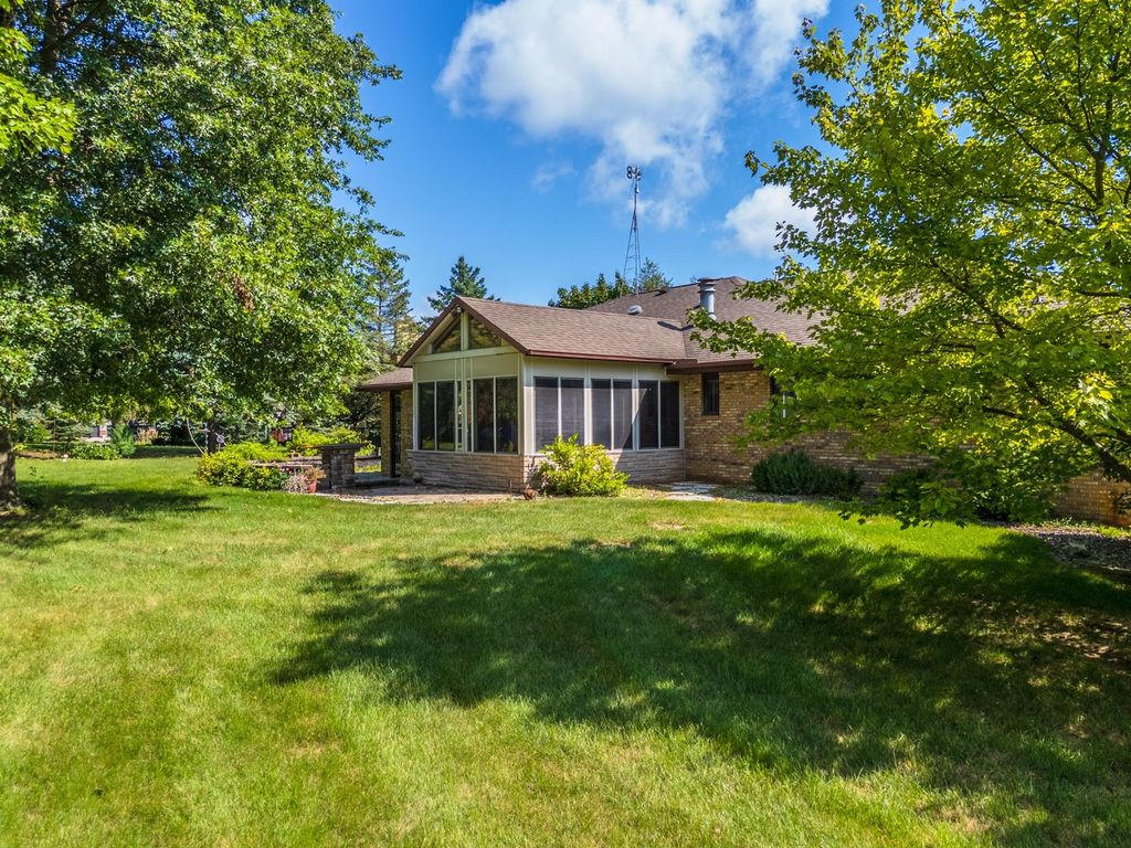 Picture crisp fall weather on almost an acre private lot with backyard wiener roasts and s'mores around a fire! Come and enjoy the crunch of leaves along the path in the woods, fishing, or put your kayak or canoe in the lake! Tennis court in the neighborhood too of this Tri-Valley School district property! All Brick Custom Built Home with 2 x 6 construction. Only 2nd owner in this split ranch! Ring Doorbell at the front with a cozy porch and landscaped yard. Wood flooring greets you with an extended living room that could be divided for extra dining space. Appointed kitchen with a walk-in pantry, planning desk, solar tube lighting, Corian countertops and ceramic flooring. Dining/hearth room with gas fireplace beckons you into 3 seasons room with a paver patio and a beautiful retreat in backyard. Shed (11 x 18) with overhead door and concrete floors for all of your extras! Oversized 2 1/2 car attached garage with pull-down attic stairs, workbench and EV charger too! Inviting primary suite offers dual closet space, walk-in shower, garden tub, double sinks, and LVP flooring. Main Floor laundry with laundry sink and toilet and LVP flooring. Bedroom 2 has built-ins and bedroom 3 has newer carpet this past month! Full Hall bath has a stand-up shower too! The basement is massive with an enormous family room, bedroom, full bath, separate office, workshop that everyone dreams of having and a bonus room for storage, crafts, sewing, or whatever your heart desires!! The piano, projector screen and desk in office stays with the property. Geothermal, water softener is owned, Roof 15 yrs old, 2 water heaters, and $10 a month for water! Star gazing is allowed with no streetlights to interfere!! Come make it your own!!!