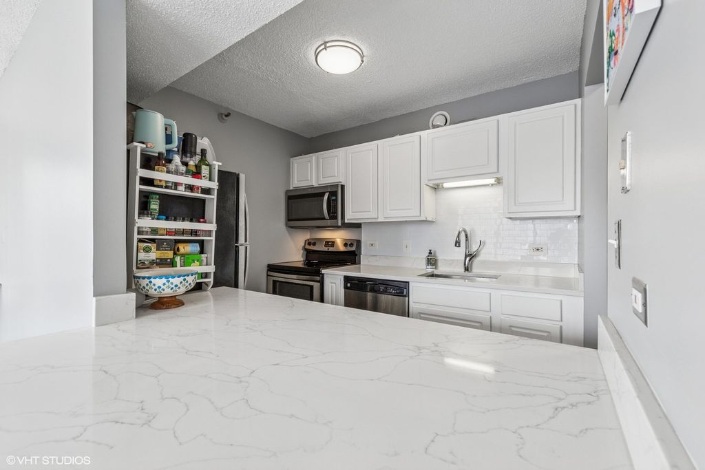This RARE nearly 1000 square foot "05" tier CORNER unit with large balcony and stunning city views has been beautifully upgraded with lovely Pergot floors throughout, gorgeous white redone kitchen with quartz counters, stainless appliances and cool extended Breakfast bar with extra storage below and perfect for two bar stools... Huge living room with plenty of room for formal dining as well as room for large couch, chairs, entertainment center and more.... Unbeatable location in heart of River North with fabulous pool, park area with grilling stations, huge gym, business center, 7/11 within building, sauna and more! Steps to the best restaurants, clubs and Magnificent Mile shopping... Extra bonus! TraderJoe's is right next door! Can't beat that!!