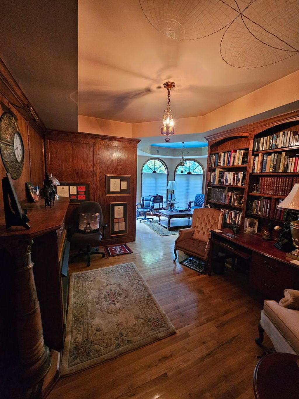 Magnificent Executive Luxury Estate on 11 Private Acres! A Rare Opportunity Being Sold As-Is! Cash or Pre-Approved Buyers Only! Prepare to be captivated by this custom-built 5-bedroom, 5.5-bath estate featuring a walkout basement, 3-car attached garage, and stunning architectural details throughout. As you approach the long driveway, you'll be welcomed by soaring windows and elegant double doors that lead into a grand foyer showcasing a breathtaking curved wooden staircase with handcrafted oak railings and exquisite trim work. Entertain in style in the expansive formal dining room adorned with a tray ceiling and chandelier, or relax in the sunlit living room featuring hardwood floors, dramatic curved windows, and a carved fireplace mantle that makes a statement. The spacious family room offers hardwood flooring, a floor-to-ceiling brick fireplace, full wet bar, panoramic windows, and seamless access to the rear deck. The chef's kitchen is a true masterpiece, highlighted by a center island, custom cabinetry, walk-in pantry, double appliances, and even its own brick fireplace! The estate also features a richly detailed library, a private den, a theater room, rec room with a second wet bar, and unique touches like hidden liquor cabinets and a "secret" room for added intrigue. The luxurious primary suite includes an en suite bath and walk-in closets, with four or more additional bedrooms providing ample space for family or guests. All of this is nestled within 11 acres of wooded privacy along Deer Creek; just minutes from top-rated schools, shopping, and dining. Don't miss your chance to own this one-of-a-kind luxury retreat. Schedule your private showing today!