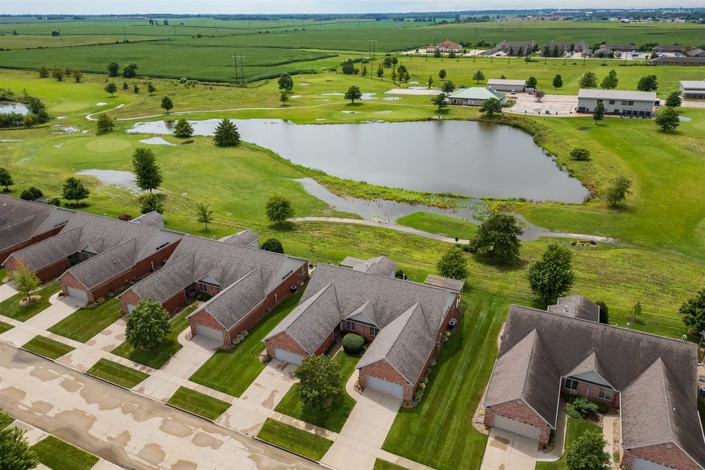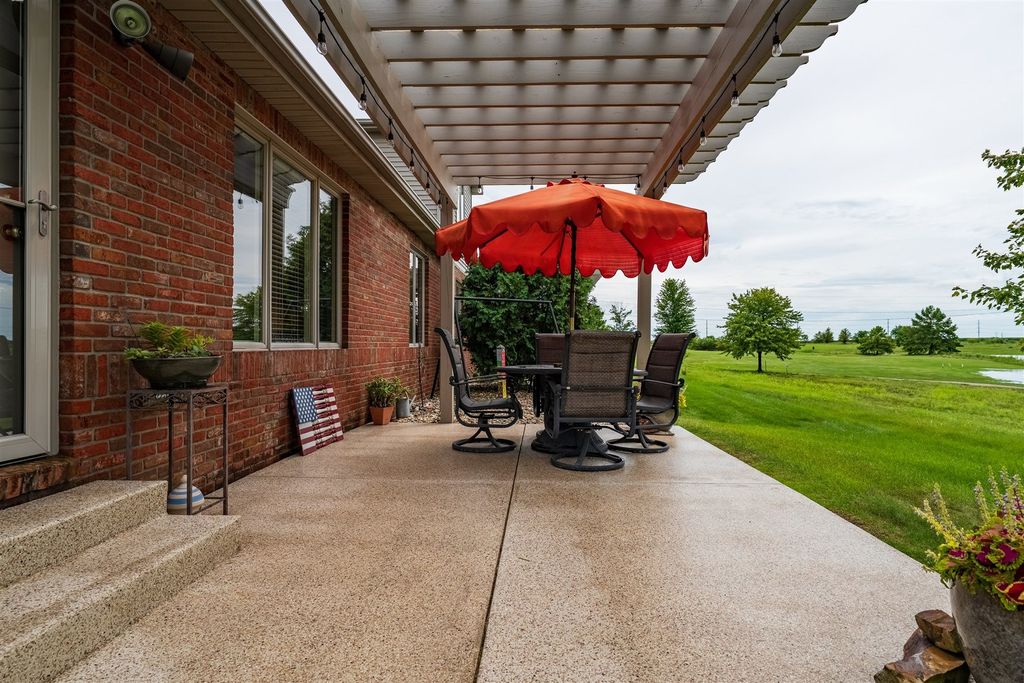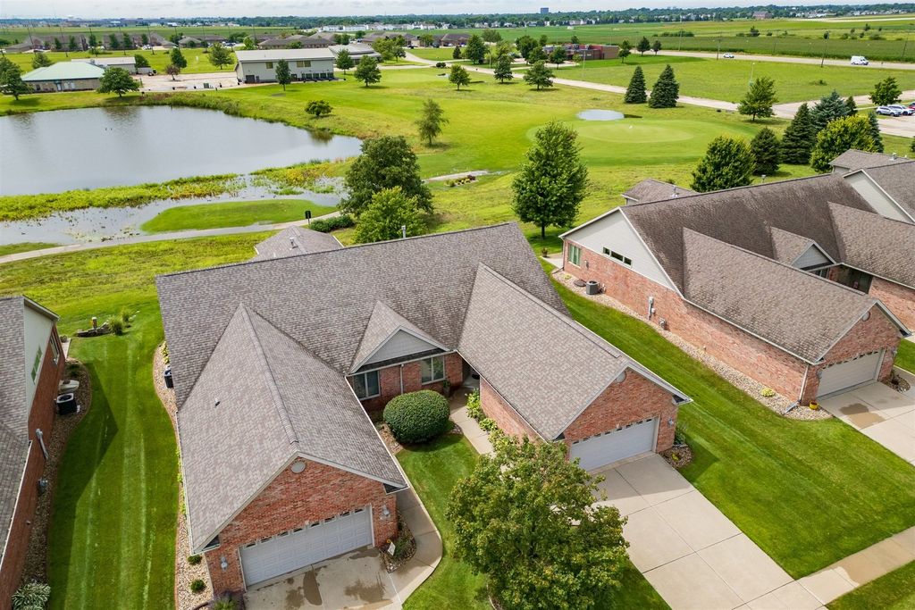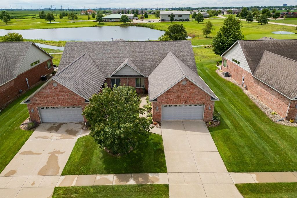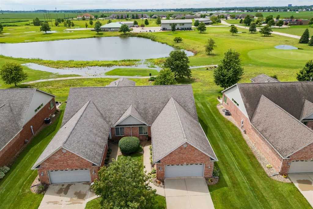 Welcome to 1713 Dunraven! This wonderful 2 Bedroom, 2 (full) Bath brick Ranch (duplex) is situated on The Links golf course (2nd tee) and offers fantastic GOLF COURSE and LAKE VIEWS! Enjoy the peace, quiet and pristine back yard views while also walking to golf, restaurants or the local brewery! This one owner property has been meticulously kept, offering over 3300 SF of living space with a 1st floor primary bedroom and laundry, cathedral ceiling, and a 4 SEASONS SUNROOM with abundant natural light to enjoy the sunsets. The beautiful Kitchen features quality white cabinets, appliances, a pantry, an extended island and upgraded cabinets with glass doors and shelving with built-in lighting. Bedrooms are spacious with walk-in closets and attached bathrooms with a modern look. Recent updates include; Pergola 2018, HVAC thermostat 2019, Sump Pump 2021, Roof 2021, Garbage Disposal 2021, Epoxy (TSR Coating) garage and patio 2022, Wi-Fi garage door opener and key pad 2022, and Refrigerator/Dishwasher 2023. HOA fees are just $130/month providing irrigation, lawn care, snow removal, clubhouse with gym, sauna & private inground pool. The spotless garage is nicely painted and the garage and patio are enhanced with a quality done epoxy coating. DON'T MISS THIS QUALITY BUILT BEAUTY READY FOR MOVE-IN!