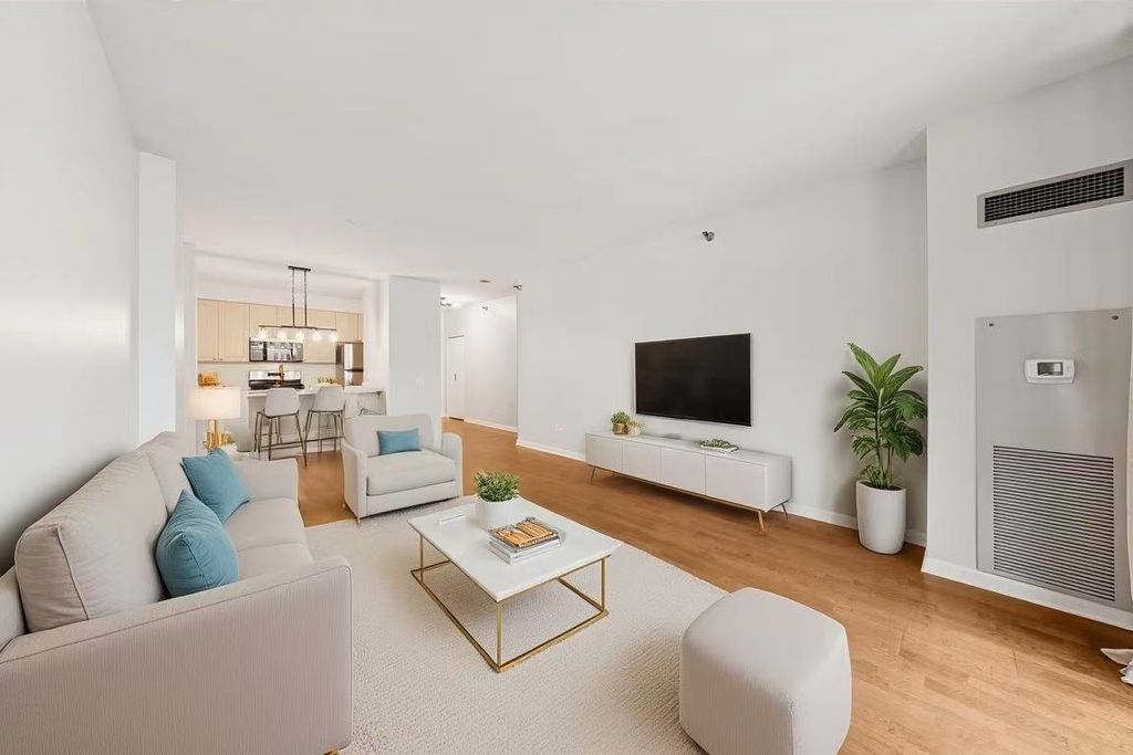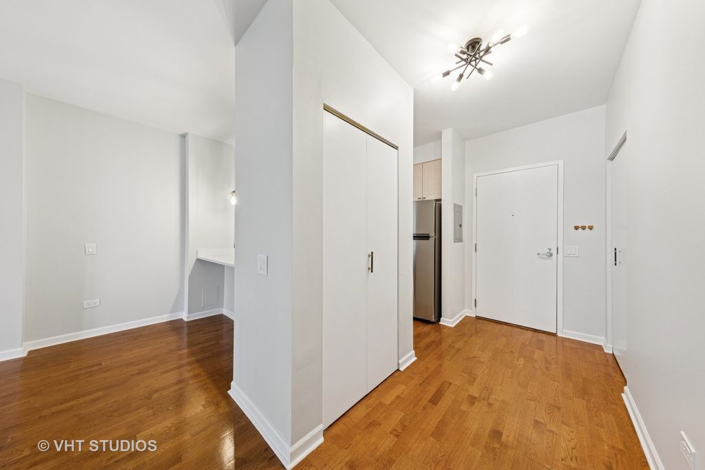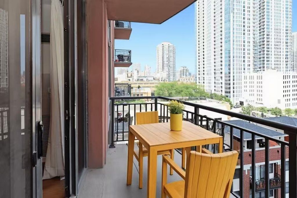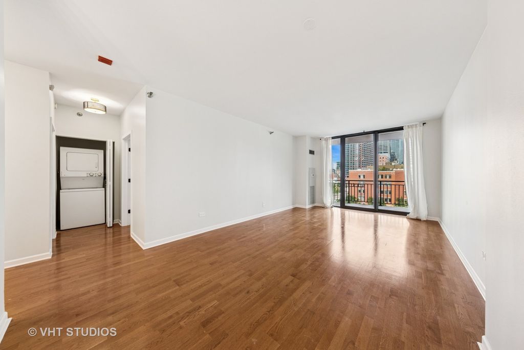 Beautifully upgraded 1BR/1BA freshly painted east facing move-in ready condo at Kinzie Station located in the heart of Fulton Market/West Loop! Garage parking and additional storage included! The kitchen features brand-new Whirlpool stainless steel appliances-refrigerator, oven, microwave, and dishwasher-along with sleek quartz countertops and modern cabinetry, all complemented by engineered hardwood flooring throughout. The spacious, open layout offers a bright living area leading to a private balcony with stunning city skyline views! The bedroom offers spacious walk in closet and easily fits a king size bed and additional furniture. In-unit laundry, ample closet storage space, and central heating and cooling. The building offers full-service, 24-hour door staff, a fitness center, landscaped terrace, party room, Amazon Hub, on-site dry cleaner, and a dog relief area. Pets friendly. The monthly HOA covers gas, heat, A/C, cable, internet, water, and building amenities. Unbeatable location walking distance to restaurants and grocery stores, Metra, CTA Green/Pink/Blue lines, and major expressways-ideal for modern city living. Come to see it today!
